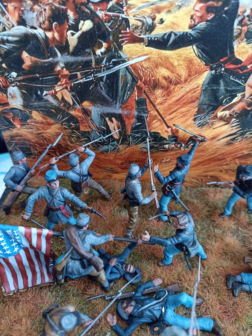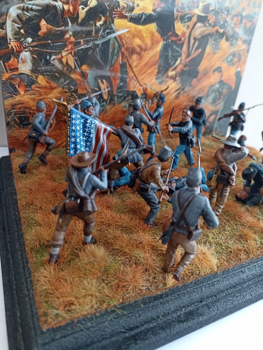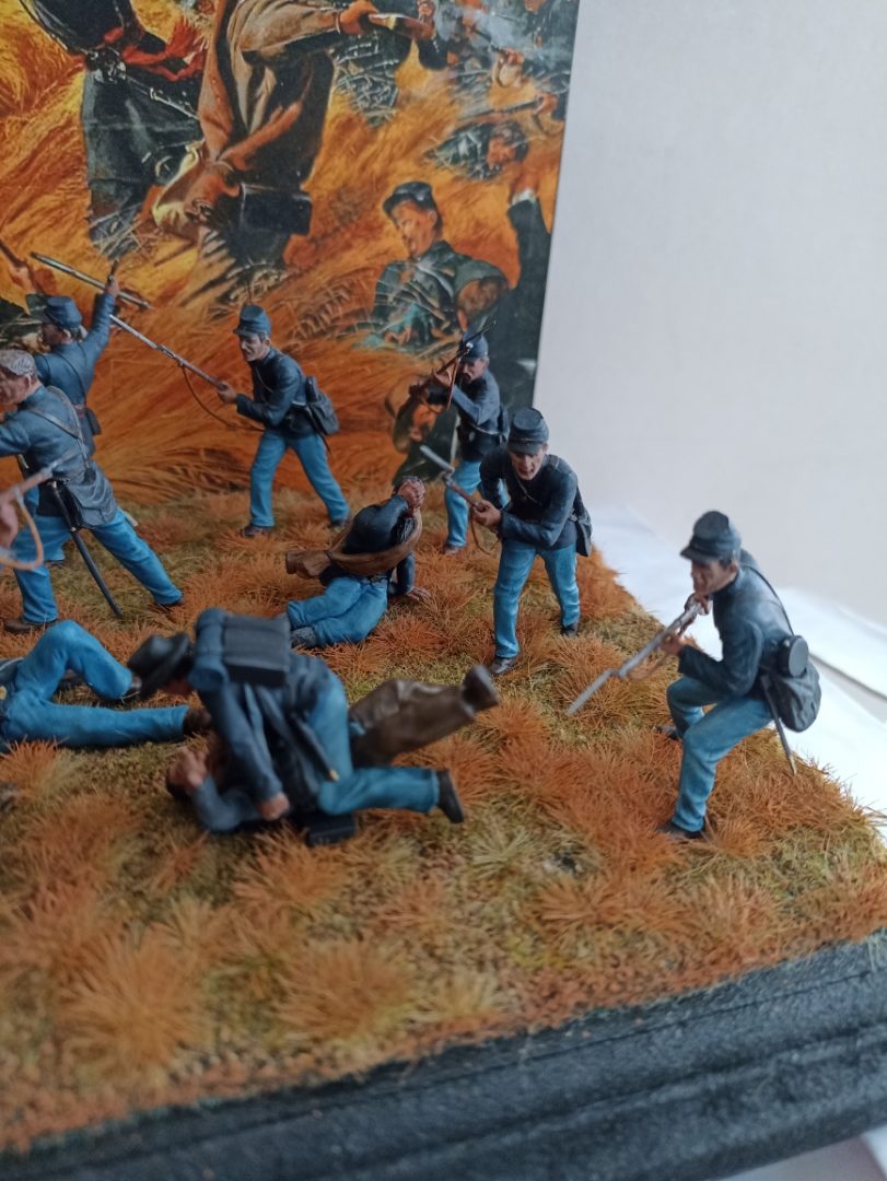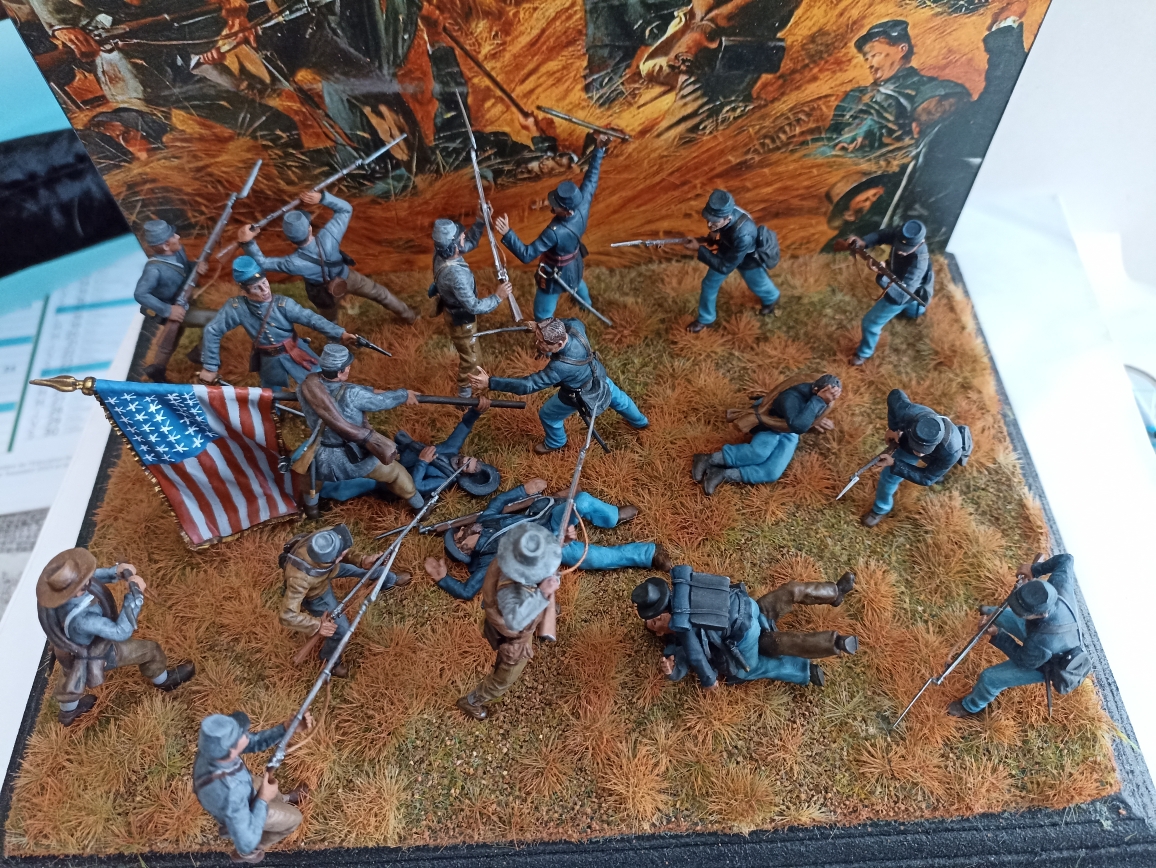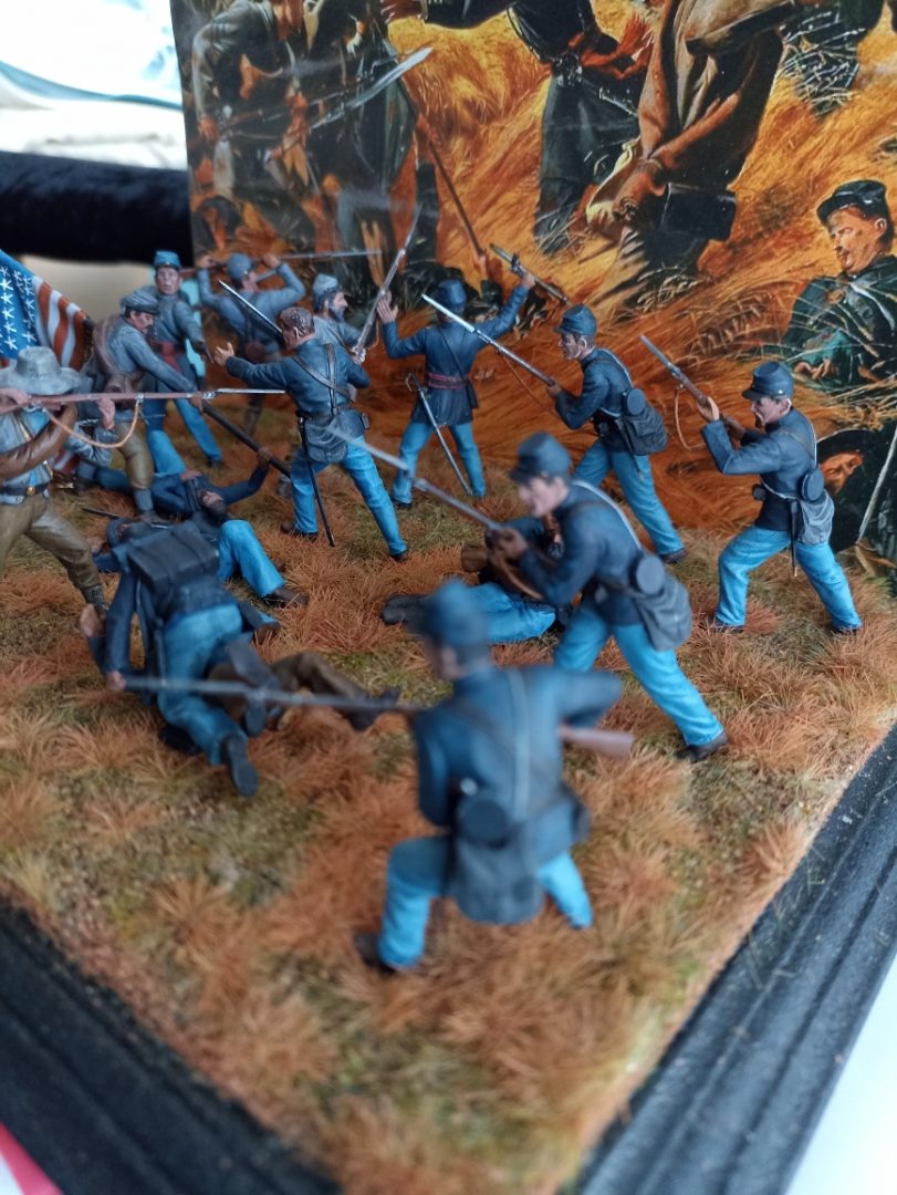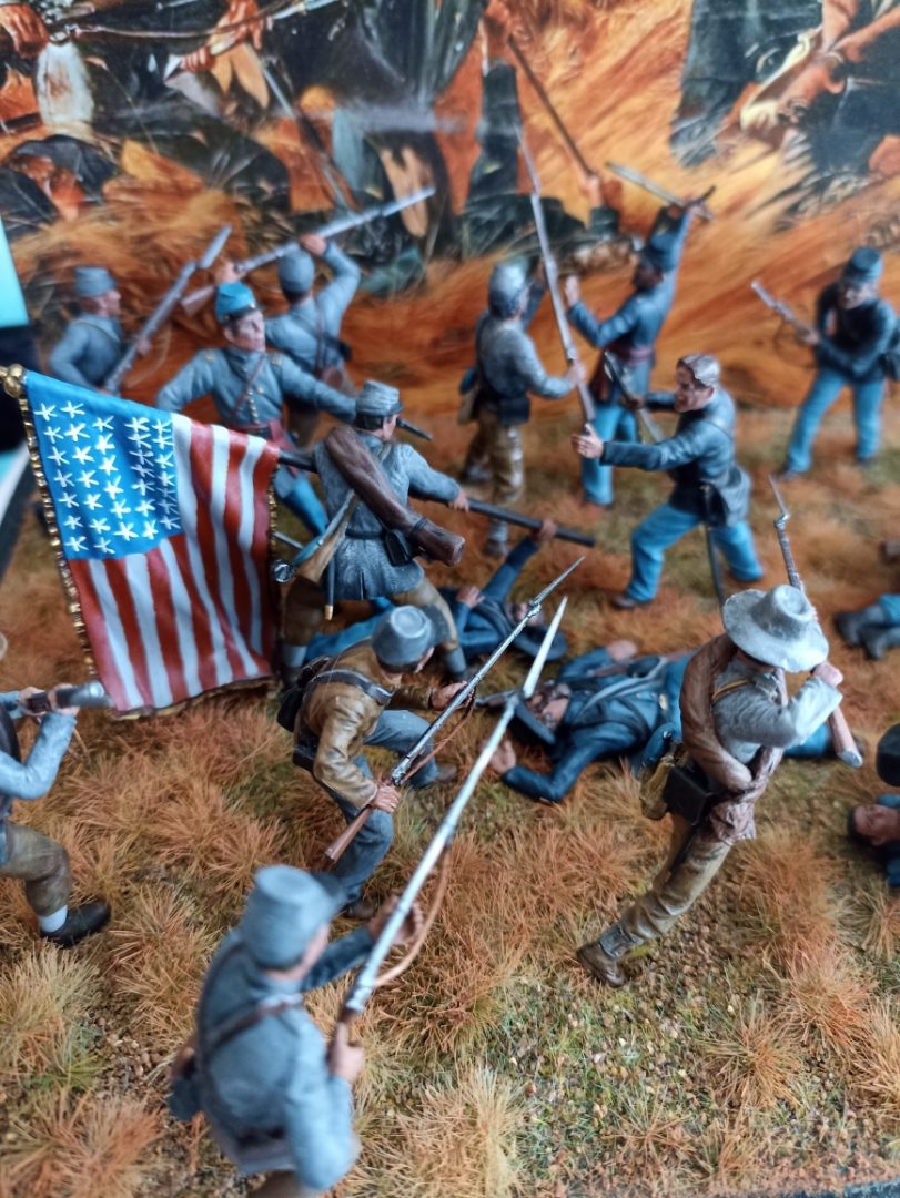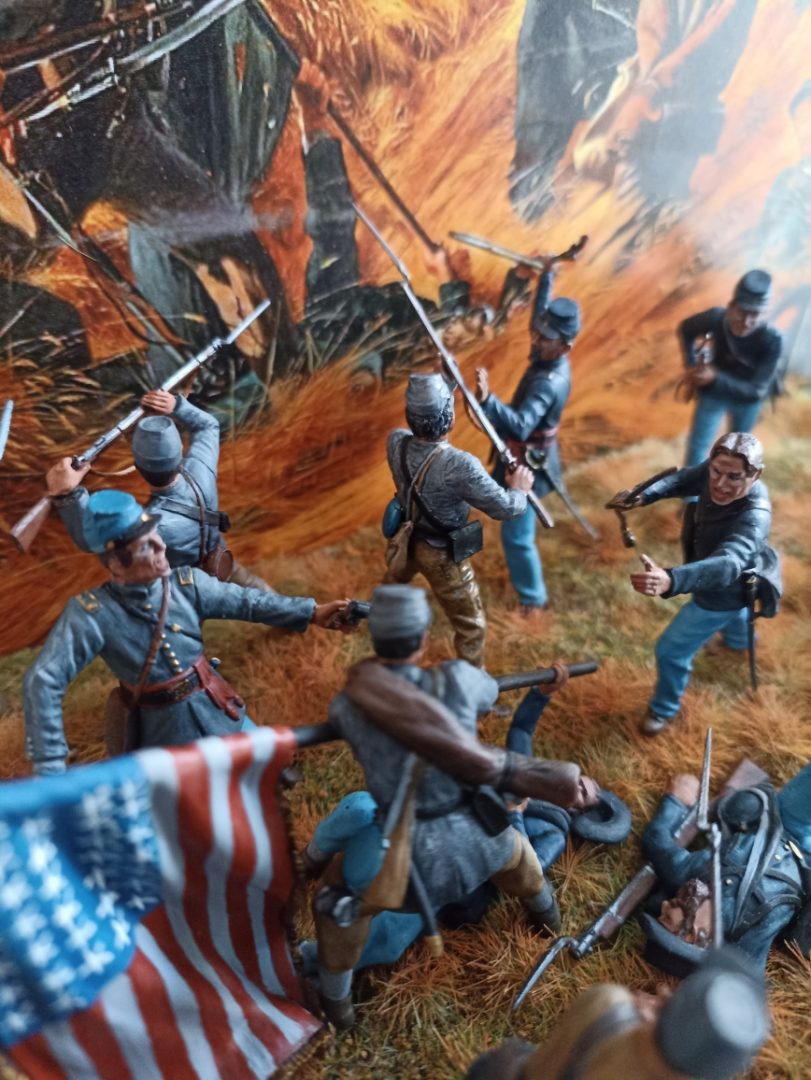 j’ai choisi un petit moment d’histoire après avoir vu une gravure s’approchant des figurines. Nous sommes à Gettysburg, le 2 juillet 1863. Lors d’ une phase de combat, le colonel Jeffords du 4th Michigan de l’Union est mortellement touché d’un coup de baïonnette en tentant de sauver le drapeau de son unité. Le drapeau sera tout de même récupéré au prix de lourdes pertes. Diorama sympa à faire, la peinture est également plaisante, mais je ne ferais plus de figurines plastiques pour une histoire de gravure. Nous sommes ici à l’Échelle 1/35. I chose a little moment of history after seeing an engraving approaching the figurines. We are in Gettysburg, on July 2, 1863. During a combat phase, Colonel Jeffords of the 4th Michigan of the Union was fatally hit with a bayonet blow while trying to save the flag of his unit. The flag will still be recovered at the cost of heavy losses. Nice diorama to make, the painting is also pleasant, but I would no longer make plastic figurines for a story of engraving. We are here on a 1/35 scale