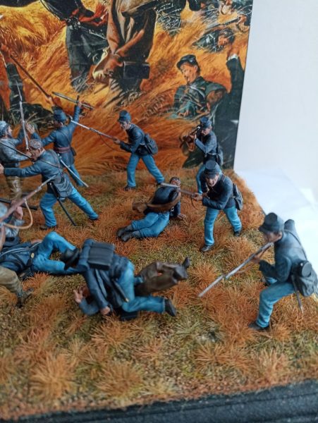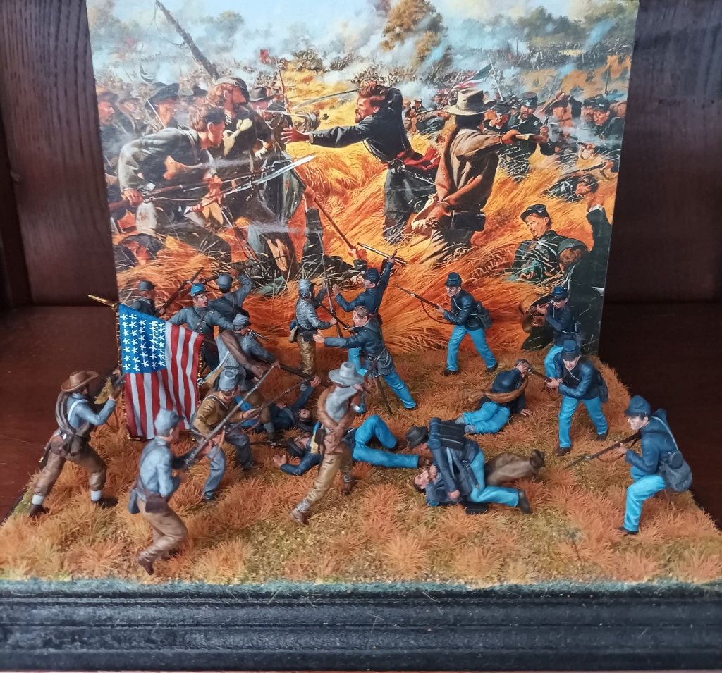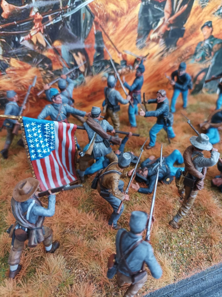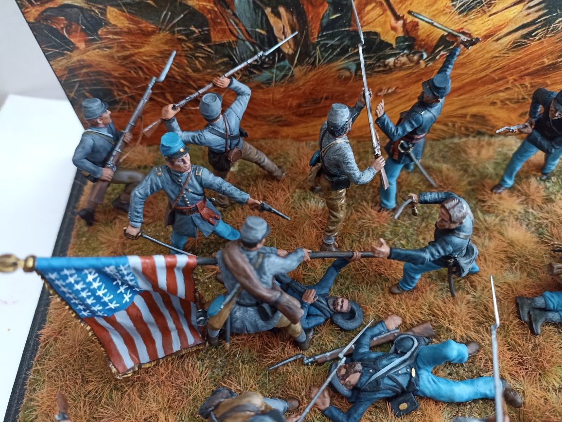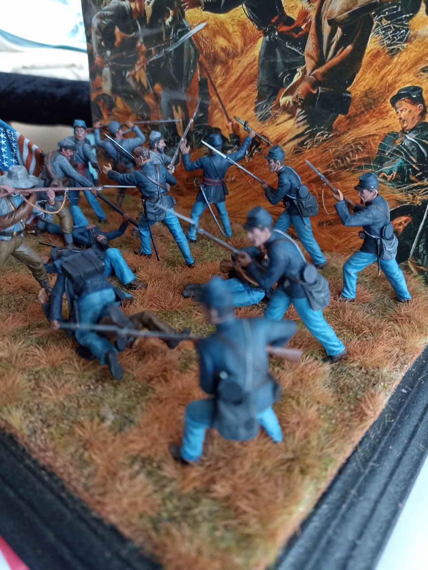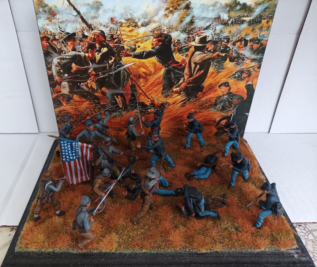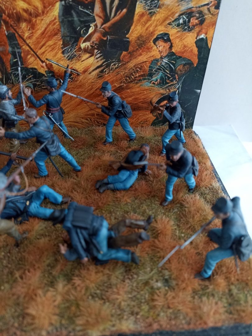 j’ai choisi un petit moment d’histoire après avoir vu une gravure s’approchant des figurines. Nous sommes à Gettysburg, le 2 juillet 1863. Lors d’ une phase de combat, le colonel Jeffords du 4th Michigan de l’Union est mortellement touché d’un coup de baïonnette en tentant de sauver le drapeau de son unité. Le drapeau sera tout de même récupéré au prix de lourdes pertes. Diorama sympa à faire, la peinture est également plaisante, mais je ne ferais plus de figurines plastiques pour une histoire de gravure. Nous sommes ici à l’Échelle 1/35. I chose a little moment of history after seeing an engraving approaching the figurines. We are in Gettysburg, on July 2, 1863. During a combat phase, Colonel Jeffords of the 4th Michigan of the Union was fatally hit with a bayonet blow while trying to save the flag of his unit. The flag will still be recovered at the cost of heavy losses. Nice diorama to make, the painting is also pleasant, but I would no longer make plastic figurines for a story of engraving. We are here on a 1/35 scale