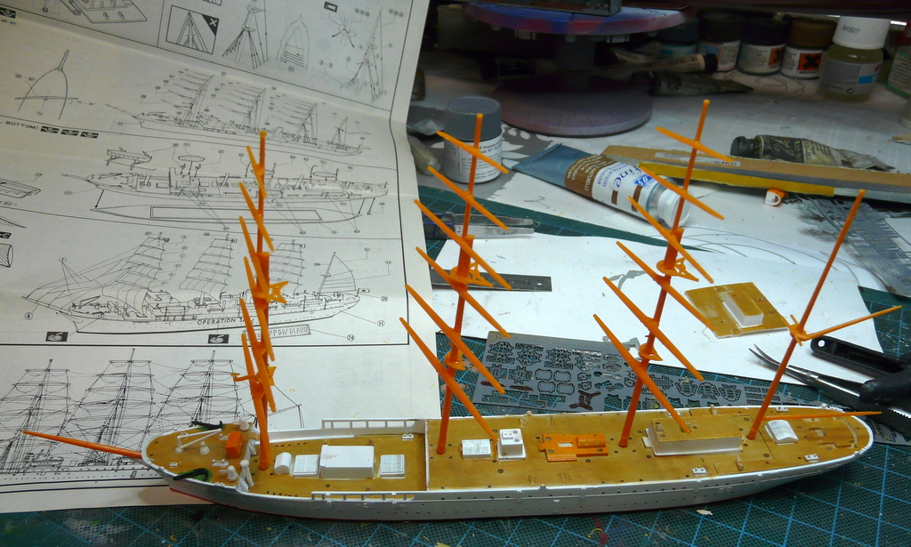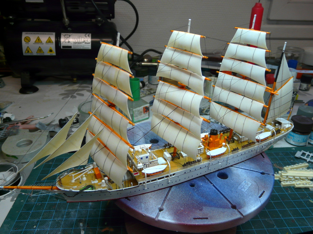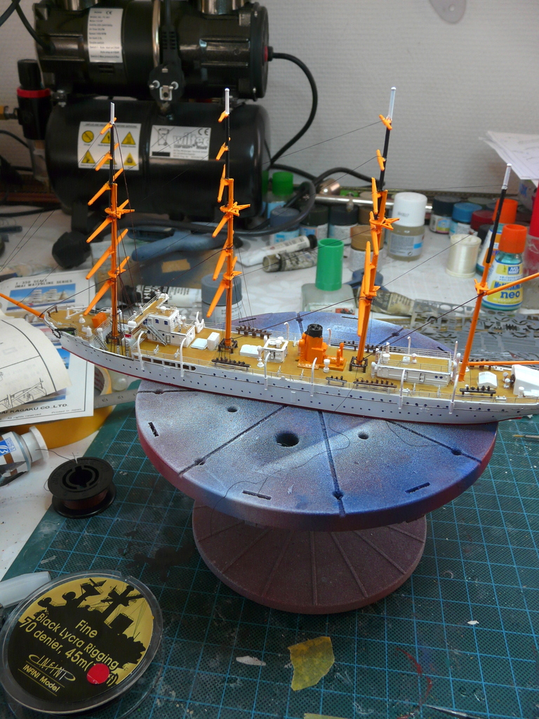 La peinture prend beaucoup de temps. Plein de pièces à coller sur le pont. Puis vient la pose des quatre mats. J’ai fait sauter le radar moderne sur le premier. Puis vient le haubanage, et là c’est long, très long. Une bobine de fil est fournie dans la boite. J’ai voulu l’utiliser et très rapidement, c’est mission impossible, trop rigide….Après avoir posé quelques brins, j’abandonne et je me retourne vers ma bobine de lycra INFINI au 350 ème et là ! Quel bonheur ! Un point de cyano et c’est pris, plus de nœud à faire. J’ai retrouvé mon plateau tournant TAMIYA qui me rehausse mon chantier, (plus prêt de mes yeux), et permet de tourner le bateau dans tous les sens sans le manipuler. Poser les fils, c’est le salaire de la peur, tant que cela prend c’est bon. Dès que cela commence à «merdouiller» et à agacer , mieux vaux aller promener le chien, boire un café, faire un câlin à maman, (choisissez vos priorités!).