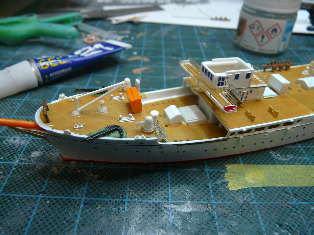 Construire ce voilier au 350 ème, ce n’est pas une partie de rigolade. Si on veut un résultat correct, il faut vraiment rentrer dans le détail de la peinture. Et là, ça va vous prendre plusieurs jours. Mine de rien, ce petit bateau est finement détaillé. Tout s’assemble correctement , pas un gramme de mastic a été maltraité dans ce nouvel épisode. Toutes les pièces sont apprêtées en blanc mat. Pour avoir un blanc « flaschi », je me suis concocté un reste de blanc brillant GUNZE rehaussé d’une goutte de bleu. Le pont est peint en bois GUNZE, puis une fois sec , travaillé à l’huile « terre de sienne ». Reste le choix du « jaune-orange », pour la cheminée, diverses pièces et toute la mature. J’ai longtemps hésité, puis en cherchant des photos du NIPPON MARU actuel, puis je me suis rabattu sur le jaune-orange GUNZE . Je peins tout à l’aérographe, je ne peux m’en passer et je suis devenu incapable de peindre au pinceau. Le montage ne pose pas de problème. Par contre, si je veux qu’il soit au même niveau que le MOGAMI, il va falloir rajouter de la photodec. Déjà remplacer les escaliers, puis mettre toutes les rambardes non prévues dans le kit. Ma boite à rabiot à fait son office et j’y ai trouvé mon bonheur. Il y a un joli plan couleur de peinture et la notice de montage est relativement claire. Comme c’est un bateau « waterline », IMAI fournit en plus, une plaque qui se met sous le bateau et qui représente la ligne de flottaison. Je n’ai pas respecté le plan et j’ai l’ai mise dès le départ, bien mal m’en a pris, ( voir plus loin).