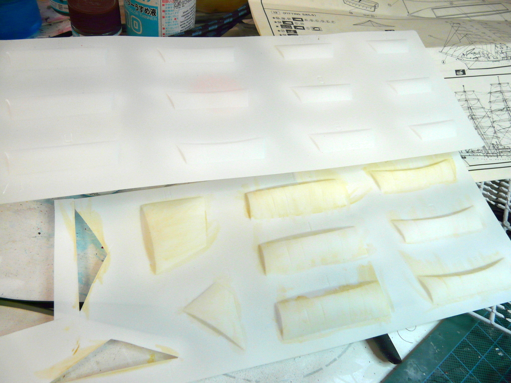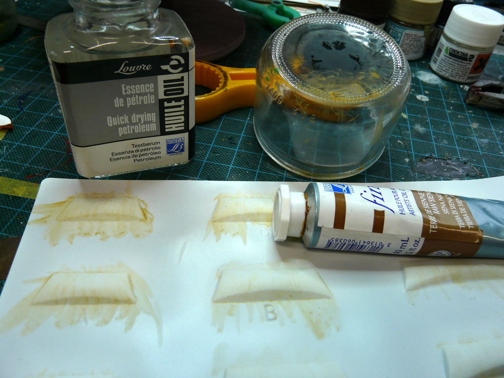 Puis viens les voiles. Il y a deux petites planches de plastiques soufflés. Maintenant, il faut donner une couleur à ces voiles pour que cela ne ressemble plus à un vulgaire bout de plastique. Apprêtées à l’aéro en blanc mat. Je laisse bien sécher. Je me munis ensuite de ma petite fiole d’essence de pétrole et de mon tube de peinture à l’huile « terre de sienne ». Sur un bocal en verre à l’envers, je frotte à peine le tube de sienne de façon à ne laisser de quelques traces. Avec une pipette, j’inonde d’essence de pétrole, (non, non, n’allez pas trop vite ! je n’y mets pas le feu ensuite ). Bien mélangé et je badigeonne sans trop frotter ma voile, ( sous peine de décaper le blanc mat) , l’effet est sympa tout de suite, même en séchant il s’atténue. Et voilà mes voiles sont prêtes.
