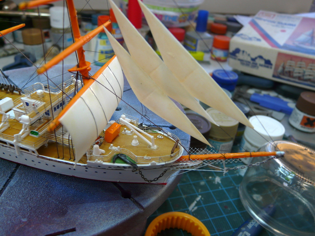 Pose des voiles à la cyano, c’est très délicat, vu la taille du bateau. Pas de problème majeur. Des bouts seront rajoutés sur chaque voile et les angles bas seront fixés par un bout à la coque. En fin de compte, quand on met les bouts, il faut imaginer la manœuvre que cela va faire quand on tire dessus. Pour chaque vergue, il faudrait deux bouts partant du pont pour les régler en hauteur, deux autres aux extrémités, reliés au pont pour leur débattement. J’ai à peu près respecter ce schéma en « trichouillant » un peu par ci par là.