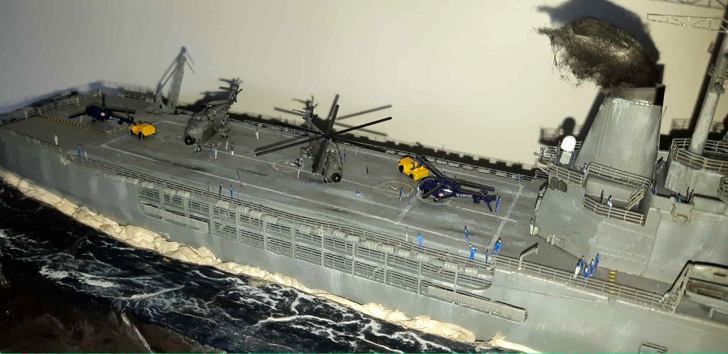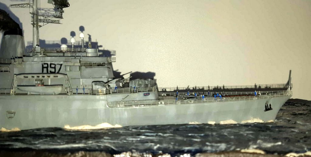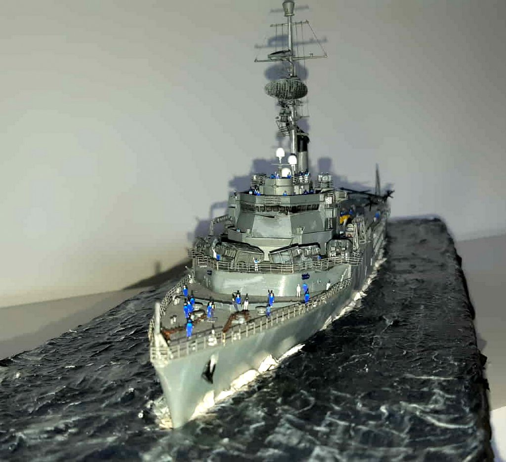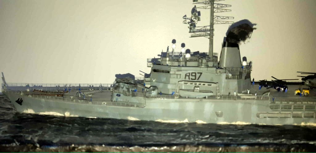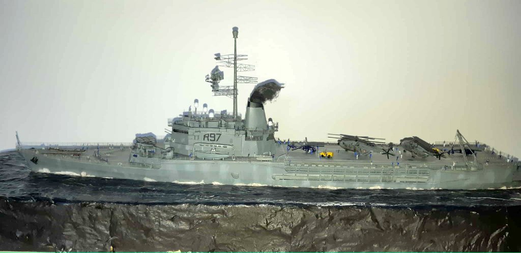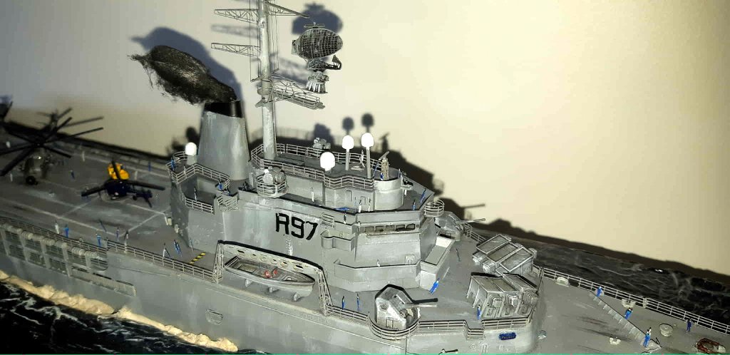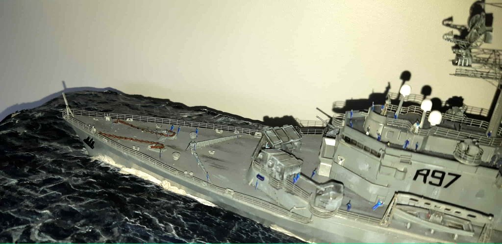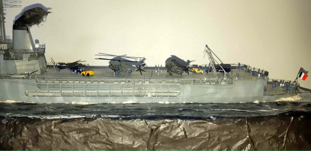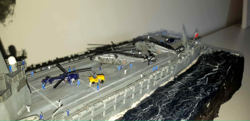 TRUMPETER a sorti la maquette au 1/350 faisant la joie de nombreux maquettistes (certes la boîte a ses défauts)… Mais à titre personnel cela ne me dérange pas. Boîte vite acquise. A l’ouverture, rien de particulier (pas de pièce 3d, hélicoptères en plastique transparent (le plastique impossible à travailler). Le montage est classique. Rien de particulier. La teinte sera faite en gunze H334 car je n’arrive plus à trouver la gunze H324. Le pont sera en gris foncé. Par contre, je rate totalement la mise en place du décalcomanie avec les chiffres blancs du pont (le decal s’est tout recroquevillé sur lui-même). Je fais donc un masquage au scotch puis blanc à l’aéro (les chiffres viennent d’un set de décalcomanie de chez l’Arsenal) puis avec le vieillissement du pont, le resultat me convient. Les radars sont en photo découpe, je ne les monte pas. Je commande chez L’ARSENAL, les radars et les hélicos (super frelon / alouette 3). Et là, une longue attente avant que la commande arrive… donc en attendant je monte les rambardes et divers accessoires, le mât. Et puis un jour enfin, la dite commande arrive. Les radars sont superbes et je vois que les hélicos ne sont pas en une seule pièce… Le montage des hélicos sera une énorme déception, les pales cassent en les découpant, les roues impossibles à installer, le rotor pareil… À titre personnel, je ne suis pas prêt de recommander des hélicos chez eux, voir des avions si le montage est identique… Pour remplacer les pales cassées, j’ai pris des pales en plastique transparent. La teinte de l’alouette sera en H5 bleu .Les super frelons seront en H334 sans le camouflage gris foncé. Mise en place de l’équipage avec les figurines déjà peintes EDUARD. Puis création du diorama et mise en place du bateau. Le résultat est superbe et je dédie cette maquette de bateau à toutes les petites mains de l’arsenal de Brest (dont deux qui étaient celles de mon pépé LOUIS) qui ont œuvré à la construction de la vraie « JEANNE D’ARC ».