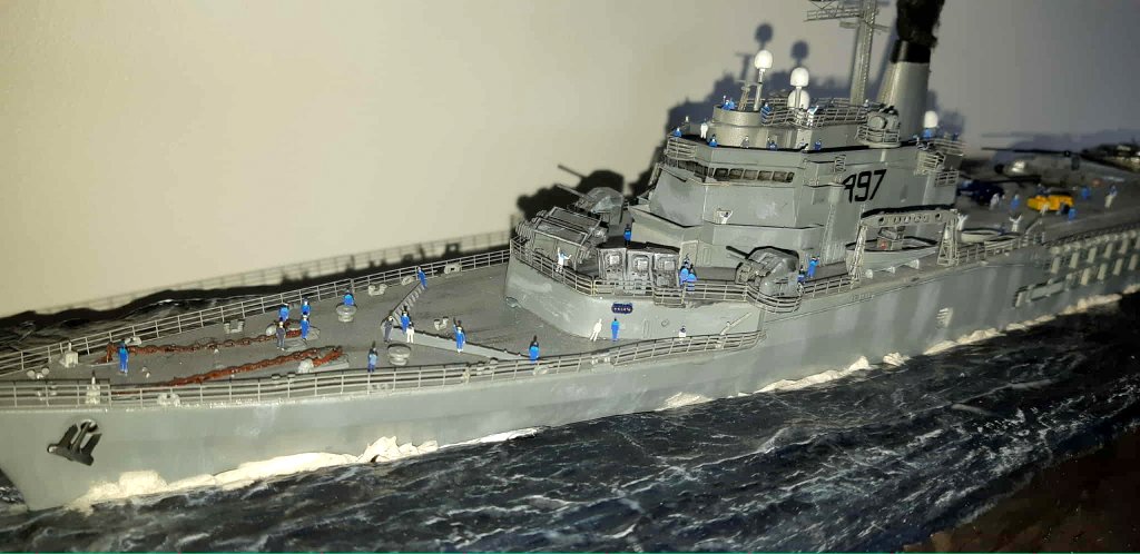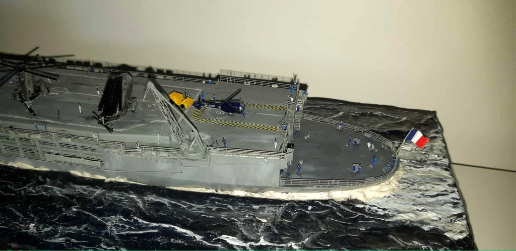 TRUMPETER released the model at 1/350, making many modellers happy (certainly the box has its flaws)… But personally, it doesn’t bother me. A company quickly acquired. At the opening, nothing particular (no 3d part, transparent plastic helicopters (plastic impossible to work). The assembly is classic. Nothing particular. The shade will be made with gunze H334 because I can no longer find the gunze H324. The bridge will be in dark gray. On the other hand, I totally miss setting up the decal with the white numbers of the bridge (the decal has all curled up on itself). So I do a masking with tape then white with aero (the numbers come from a decal set from the Arsenal) then with the aging of the bridge, the result suits me. The radars are in photoetching, I do not mount themorder from L’ARSENAL, the radars and the helicopters (super frelon / lark 3). And there, a long wait before the order arrives… so in the meantime I put up the railings and various accessories, the mast. And then one day finally, the said order arrives. The radars are superb and I see that the helicopters are not in one piece… The assembly of the helicopters will be a huge disappointment, the blades break while cutting them, the wheels impossible to install, the rotor similar… Personally, I am not ready to recommend helicopters to them, or even planes if the setup is identical… To replace the broken blades, I chose transparent plastic blades. The shade of the skylark will be blue H5. The super hornets will be in H334 without the dark gray camouflage. Setting up the crew with the already painted EDUARD figures. Then creation of the diorama and setup of the boat. The result is superb and I dedicate this model boat to all the little hands of the arsenal of Brest (including two that were those of my grandpa LOUIS) who worked on the construction of the real « JEANNE D’ARC ».