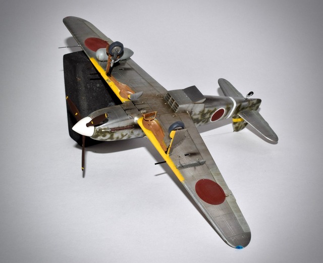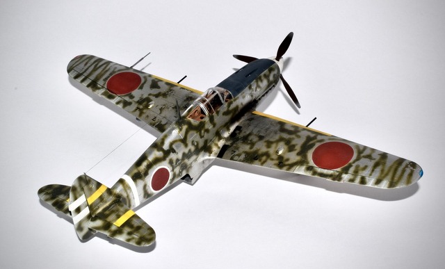 L’offensive des Alliès en Nouvelle-Guinée obligea les Japonais à réagir, ce qu’ils firent. L’Armée étant en charge de ce théâtre d’opération, elle envoya en renfort des régiments depuis le Japon , équipés d’un nouveau chasseur à moteur en ligne, le Kawasaki Ki-61. Equipé d’un moteur en ligne qui causa d’innombrables problèmes jamais maîtrisés, handicapés par un manque chronique de pièces, le personnel décimé par les maladies tropicales, tout concouru à un désastre dont les strafings des B-25 de la 5th AF furent les auteurs! Ces régiments disparurent dans le chaudron de Wewak, Lae, Boram ainsi que leurs archives. De fait les seules photos disponibles du 78° Hiko-Sentai sont celles des caméras ventrales des B-25 destinées à vérifier les effets des bombardements par parafrag. La version Hei du Ki-61 était équipée de Mauser de 20mm qu’un sous-marin Italien avait livré au Japon. Ils étaient prisés par les pilotes aguerris du fait de leur puissance de feu. Les Ki-61 étaient livrés tout alu et badigeonnés de vert de façon aléatoire par la maintenance. L’avion représenté appartient au 78° Hiko-Sentai dont les pilotes survivants furent tués en combattant avec l’infanterie en 1944. La maquette est celle d’Hasegawa au 48° qui a bien tenu compte du fuselage plus court, de la roulette de queue rétractable et des feux de position différents de la version Tei. Comme d’habitude pas de décalques mais des masques, l’alu est de chez AK et le vert de chez Gunze H 330.