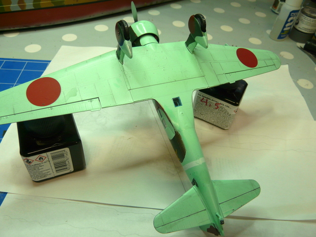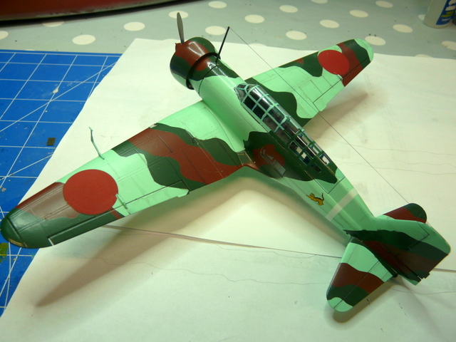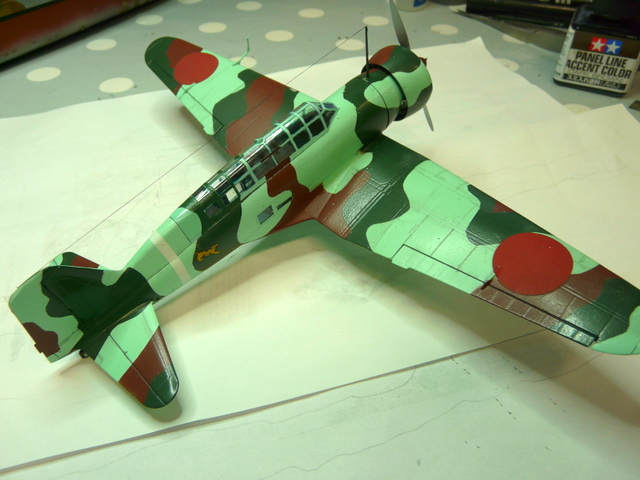 Pour la déco, je voulais retrouver la déco de l’illustration de la boîte qui m’a séduite lors de l’achat du kit. Un peu fantaisiste me direz vous ? C’est pas grave, juste pour mon plaisir. Donc un vert pale pour le dessous et pour le dessus un camouflage marron, vert et gris vert…… Une couche de vernis brillant puis pose des décalques, le tigre est magnifique, les hinomarus sont un peu trop rouge sombre à mon avis. Ah oui ! Petite précision, lors du camouflage, après la couche de blanc mat, j’ai taillé dans de l’adhésif TAMIYA, des ronds au diamètre des hinomarus. Mise en place à la place des cocardes, j’ai pu ainsi réalisé la camouflage et poser mes hinomarus sur les ronds blancs, comme cela, on ne voit pas la peinture par transparence, vous suivez ? Je sens que je vous ai perdu ?