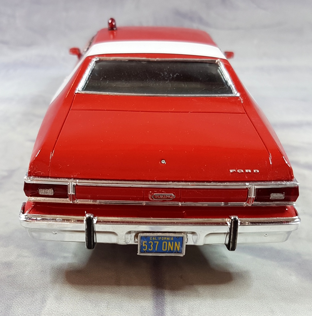 Nous avons là dans les mains de quoi faire une très belle FORD TORINO, bagnole mythique que même Clint Eatswood en à fait son super film «grand Torino». A l’ouverture, le contenu est des plus agréables. Les grappes sont conditionnées sous sachet cello, les pièces transparentes sont belles, on y trouve même une grappe de pièces transparentes moulée en rouge pour les feux arrières et le gyrophare. Le livret en couleur du plan est au top, les phases de montages sont claires, précises, impossible de se tromper. La maquette se compose de 88 pièces, ce qui convient même aux amateurs de «fast maquette» du week-end. On y trouve aussi une très belle planche de décalques avec les grandes bandes blanches qui me laissent déjà perplexe quant à leur pose. Ah! J’oubliais les 4 jolis pneus en vinyle. Deux pages du plan sont consacrées aux peintures, c’est clair, net..