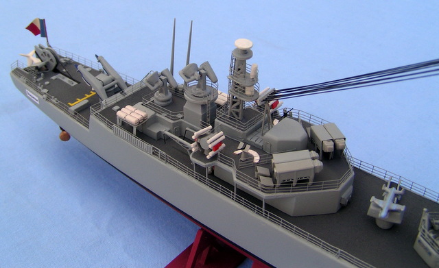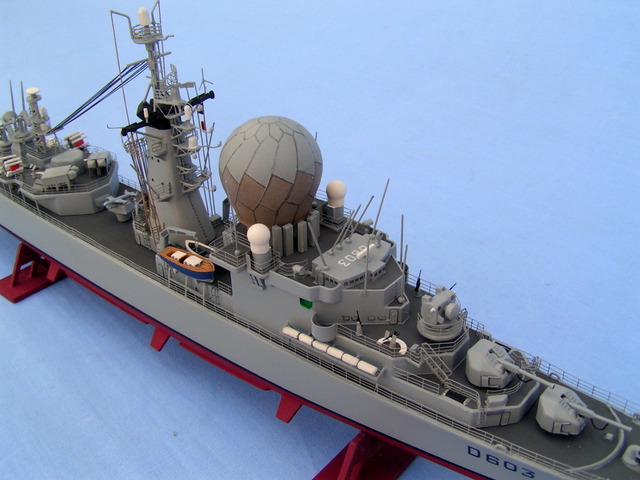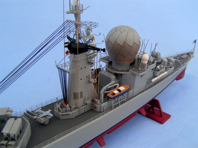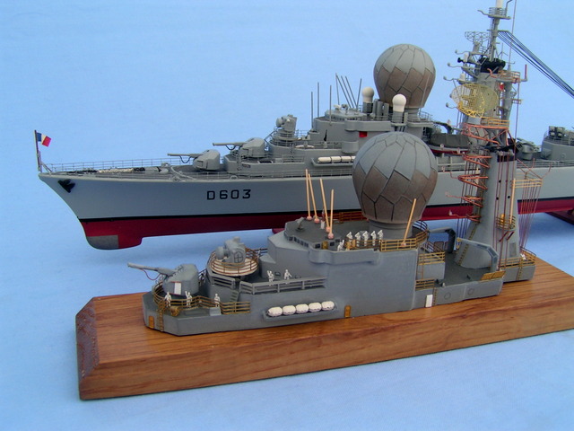 Cette maquette a été montée dans les années 1970/1975, à cette époque je montais brut de boite. J’ai voulu la restaurer pour lui donner un aspect plus récent. Première phase, dépose des rambardes et de certains appareils, décapage total et c’est parti pour un montage version 1990. Cette base heller à vu le rajout de pièces suivantes; la photodécoupe de chez L’Arsenal 2.0, des pièces découpées dans les feuilles Evergreen, des fils de cuivres de plusieurs dimensions, des pièces en résine Arsenal ( syracuses, missiles exocet, etc …).