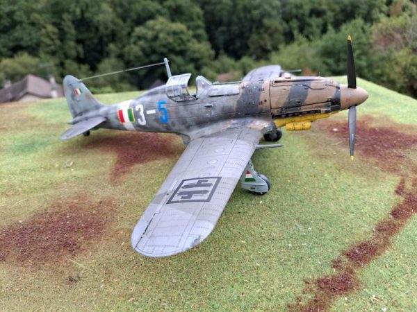 - Et pour terminer voici le Veltro ( lévrier) dans son entier, il est revêtu du camouflage type Luftwaffe de l’ANR (Arenautica Nazionale Reppublicana) de la RSI (République Sociale Italienne) créé par Mussolini après l’armistice de 1943, avec une partie de l’ancien camouflage en arêtes de poisson, la machine étant en train d’être repeinte ou conservée pour une quelconque raison de camouflage