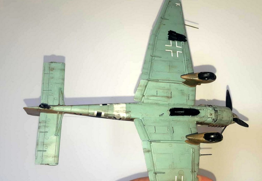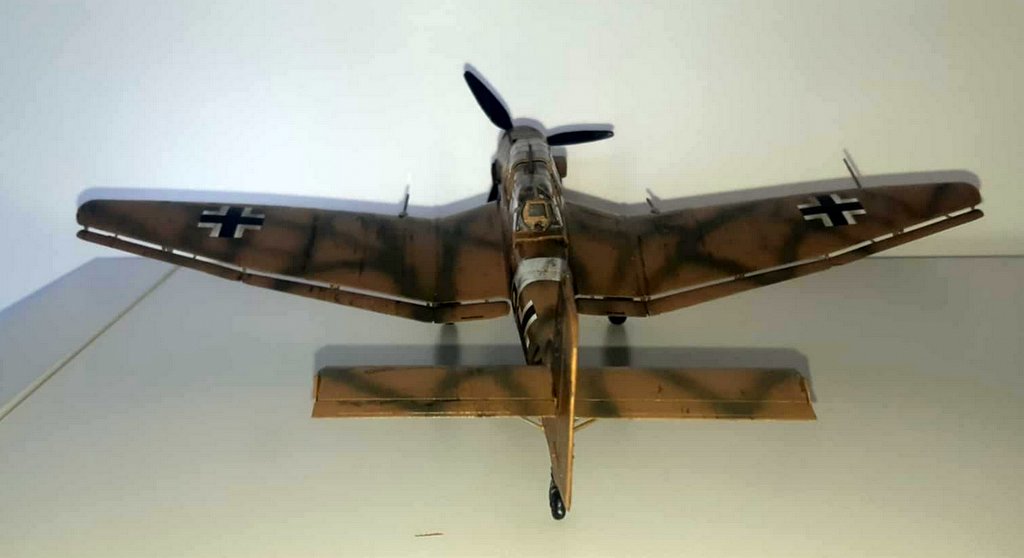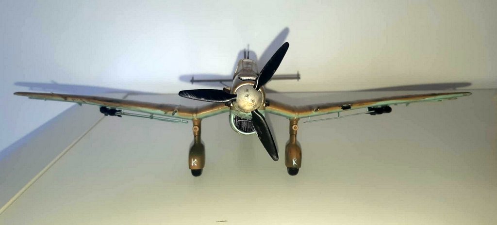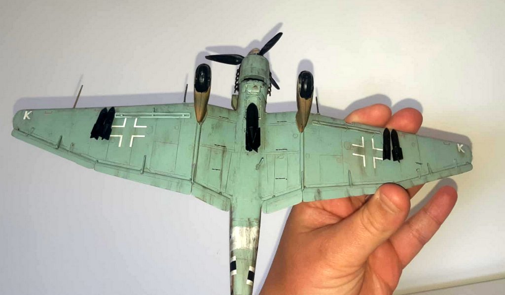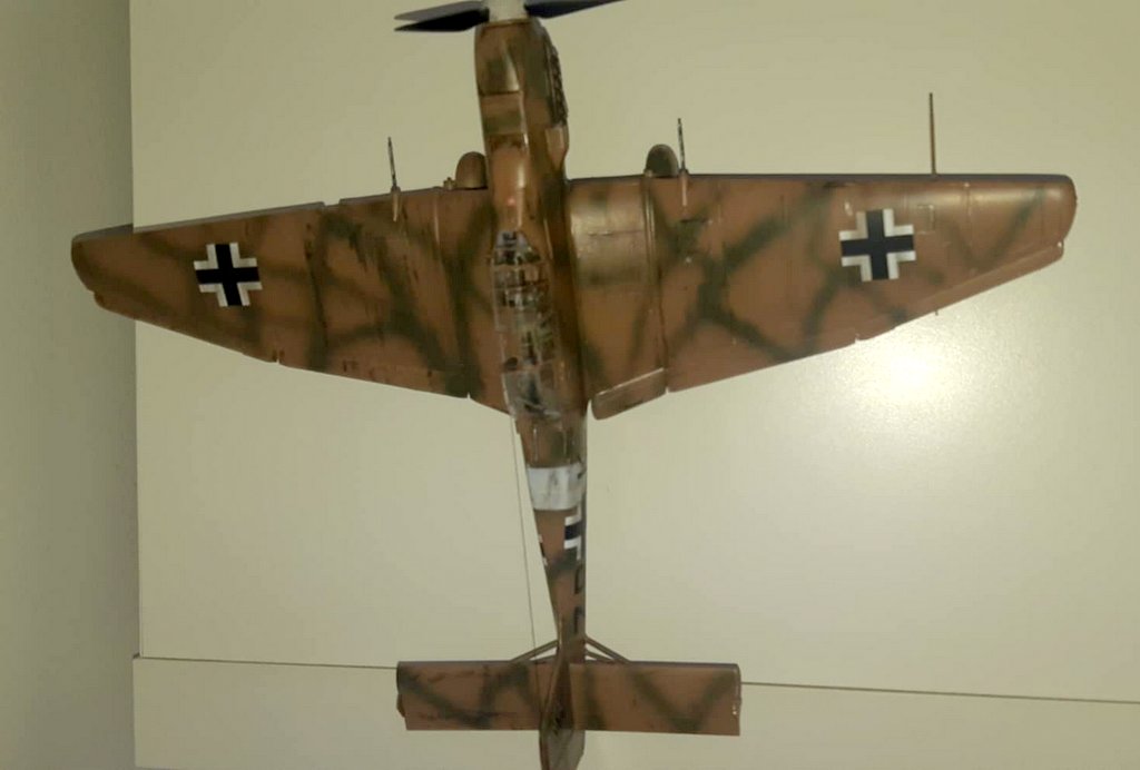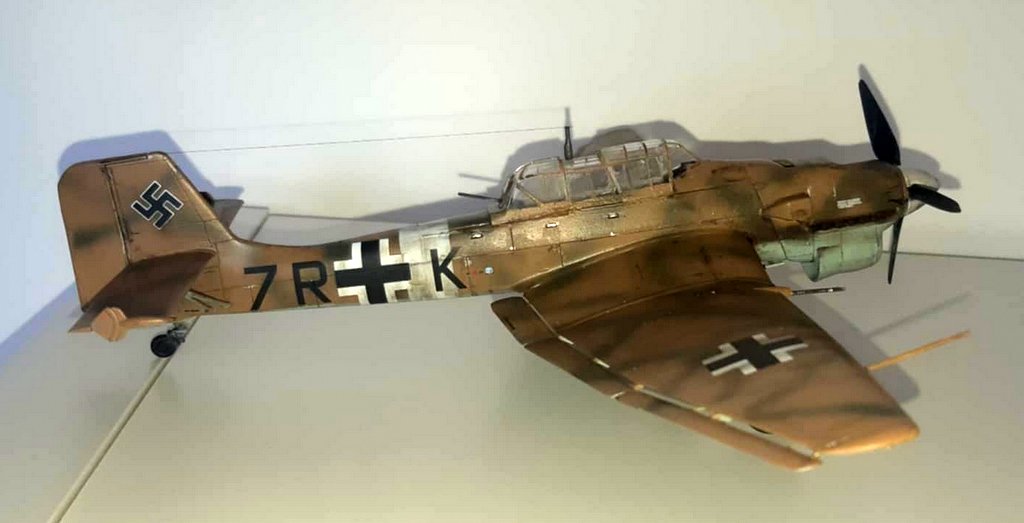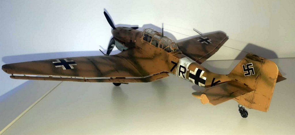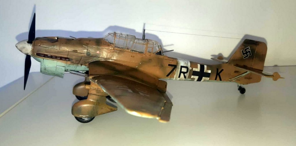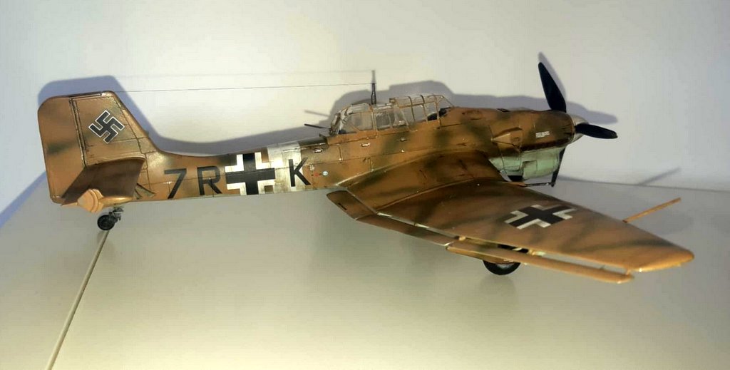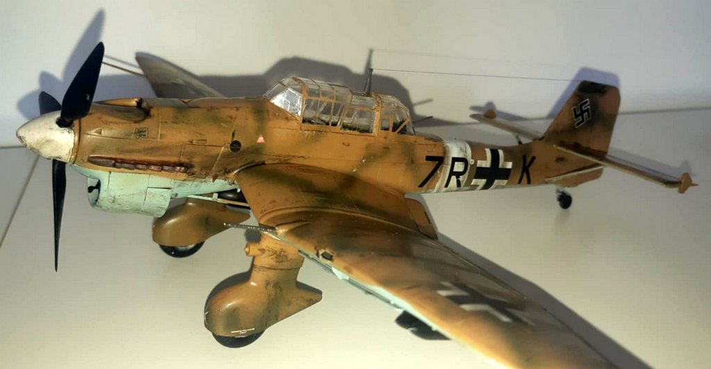 J’ai acquis une très vieille référence HASEGAWA d’occasion. Malheureusement la planche de decals est inutilisable. J’ai donc acquis 2 sets de chez EDUARD (l’un pour les croix allemandes et l’autre spécial stuka), les chiffres et lettres viendront de ma boîte à rabiots. Dans la boîte, j’avais déjà certains kits supplémentaires (protège vitre et canon métal). Les teintes seront : en GUNZE AQUEOUS, Intérieur : H416 / Dessous : H418 / Dessus : H66-H423 . Le montage se fera sans difficulté, la plus grosse difficulté sera pour moi l’installation des vitres (beaucoup de mal à bien aligner les différents blocs de vitres), beaucoup de scrogneugneu viendront attirés ma fille dans le garage afin de savoir ce qu’il se passe… au bout d’une heure, j’ai réussi à les aligner. La mise en place des protèges vitres, ne pose pas de problème. La mise en peinture se fera comme d’habitude, apprêtage en blanc, puis le dessus en sable suivi du dessous et je finis par les traits verts. Puis vernis brillant, pose des decals et vernis mat. Vieillissement à la peinture à l’huile, jus et Pastel TAMIYA . Je suis très content du résultat final malgré les problèmes eus avec mon aérographe (ça sent qu’il va falloir envisager son remplacement !). I acquired a very old used HASEGAWA reference. Unfortunately, the decals board is unusable. So I bought 2 sets from EDUARD (one for the German crosses and the other special stuka), the numbers and letters will come from my rabiots box. In the box, I already had some additional kits (window protector and metal barrel). The shades will be: in GUNZE AQUEOUS, Interior: H416 / Below: H418 / Above: H66-H423. The assembly will be done without difficulty, the biggest difficulty for me will be the installation of the windows (a lot of trouble aligning the different glass blocks), many scrogneugneu will come to lure my daughter into the garage in order to know what is happening… After an hour, I managed to align them. The installation of the window guards is not a problem. The painting will be done as usual, priming in white, then the top in sand followed by the bottom and I finish with the green lines. Then glossy varnish, apply decals and matte varnishes. Aging with oil paint, juice and Pastel TAMIYA. I am very happy with the final result despite the problems with my airbrush (it feels like we will have to consider replacing it!).