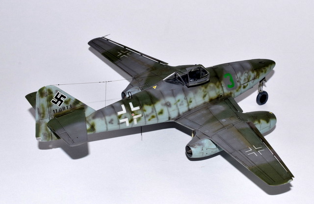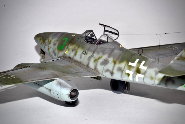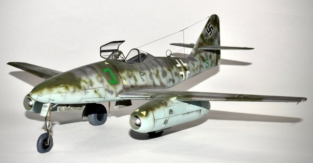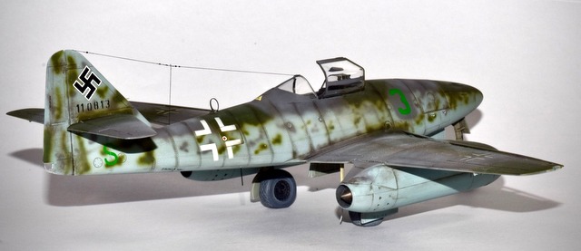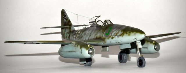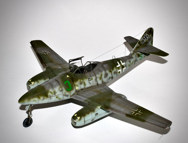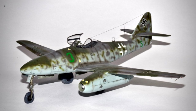 On ne présente plus l’avion qui fut le premier Jet opérationnel et qui, à ce titre révolutionna l’Aviation. La mise en oeuvre de cet appareil fut longue et coûteuse tant en hommes qu’en matériel. Les accidents furent nombreux et les victoires sur les bombardiers US ne furent pas aussi élévées que prévues. Ilfallait déjà maîtriser l’art du pilotage et si les Experts savaient manier le manche et s’adapter, il n’en n’était pas de même pour les jeunes pilotes. Afin de pallier ces carences, la Luftwaffe créa des groupes d’école pour familiariser les pilotes aux nouveaux aspects du combat aérien. La III E/JG2 était une de ces unités et la maquette représente un de ces appareils. Basé à Lechfeld, le 3 vert y fut appliqué ainsi que la lettre S sous l’empennage indiquant une machine école. La déco assez rare pour un 262 est en RLM75/83/76, toute la déco y compris le Wrk N est faite au pochoirs! La maquette est celle d’Hobby Boss au 48° qui est un peu en dessous de celle de Tamiya mais nettement moins chère!.