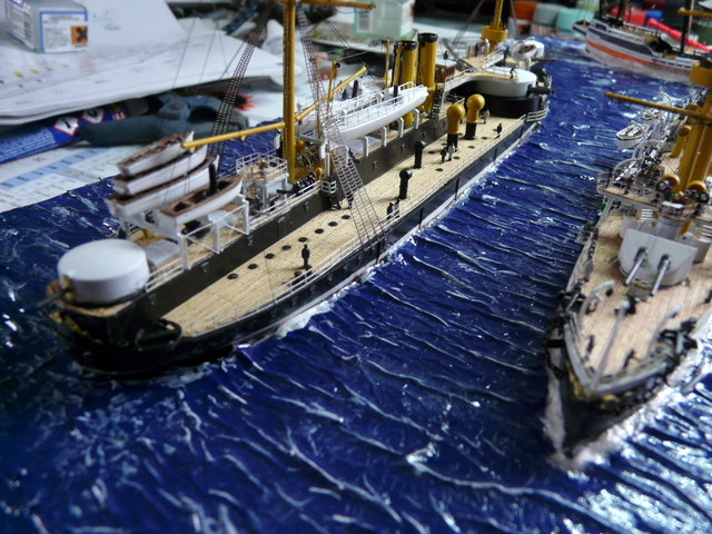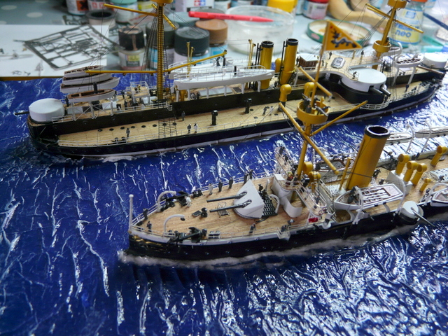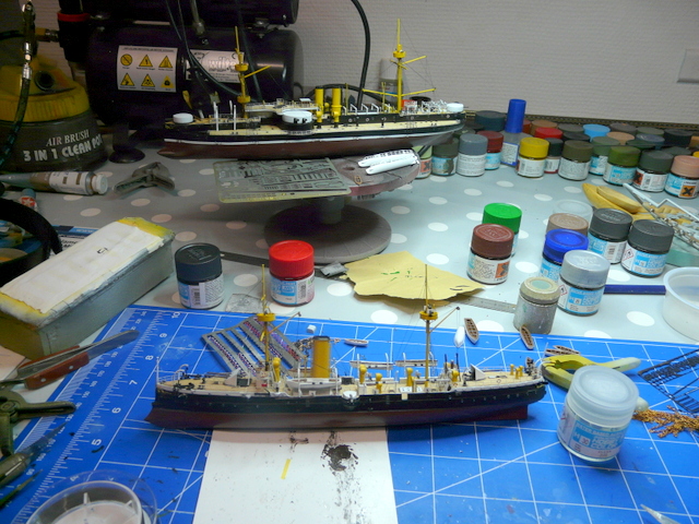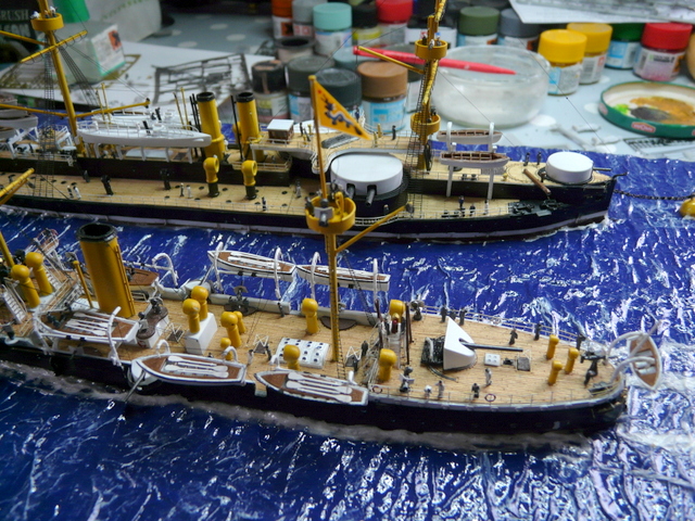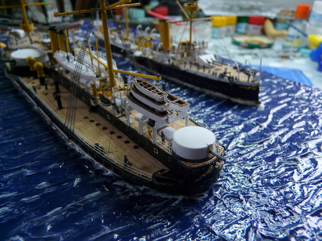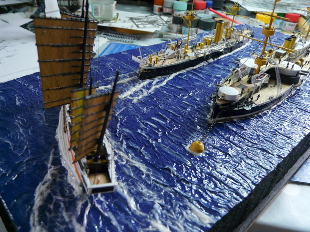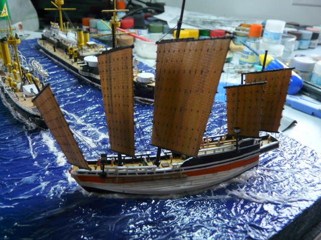 Ras le bol des gros bateaux, envie de faire des plus petits. Mon choix s’est porté sur deux navires Chinois de la marque Bronco Model au 350 ème. Ce qui m’a attiré vers ces modèles, c’est leur tronche de vieux bateaux de fin de siècle et leurs couleurs chatoyantes, rouge pour la sous marine, coque noire et blanche, cheminées et manches à air en jaune. Cela nous sort un petit peu du gris «kuru arsenal». L’idée était de faire une mise en scène pacifiste, reflet de l’histoire. Tentant de mêler bateaux civil et bateaux de guerre, j’ai eu idée de me mettre en quête, (et c’est peu dire) d’une jonque Chinoise de la marque IMAI, produit absolument rarissime que certains rigolos ou escrocs, mettent en vente sur ebay à plus de 90 euros. J’ai enfin trouvé mon bonheur sur ebay à un prix sympa avec un vendeur sympa.