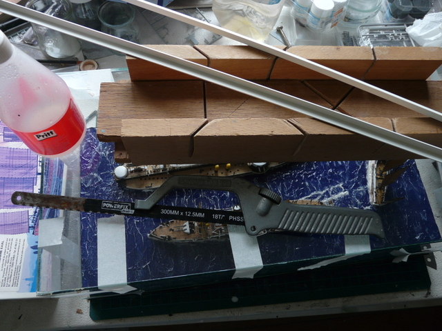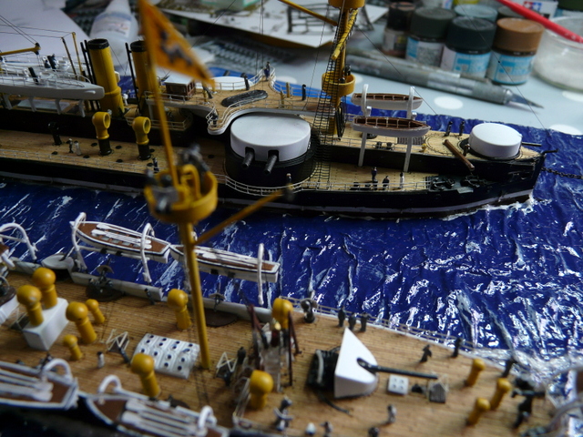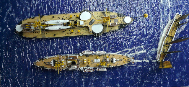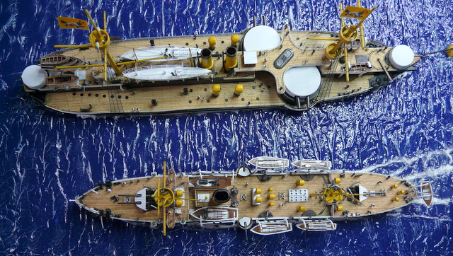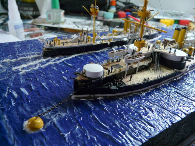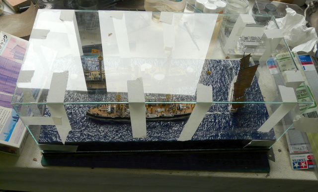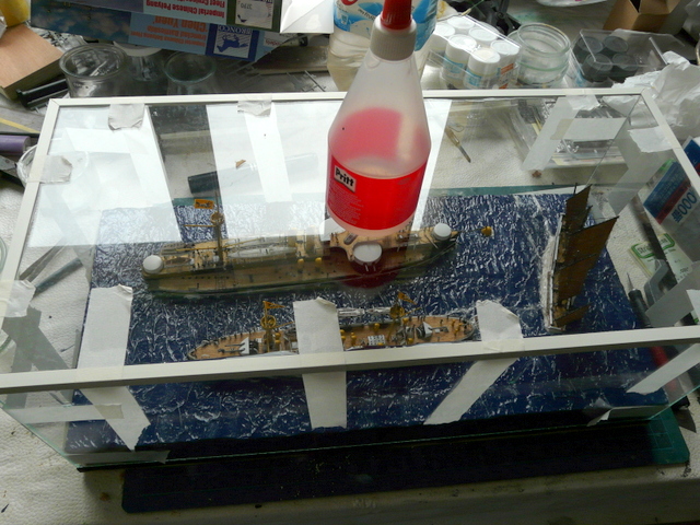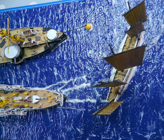 La technique de la réalisation de la mer est toujours la même. Sur une plaque de contreplaqué 10 mm, collage de la base en polystyrène 30 mm d’épaisseur. Nappage de la surface de la mer, avec des feuilles de papier WC, ( blanc de très mauvaise qualité), avec de la colle à bois dilué à 50 % avec de l’eau. Séchage 48 heures. Creusement des emplacements des bateaux au cutter. Peinture de la mer, en bleu marine, (gros pot). Séchage. Collage des bateaux dans leur trou respectif à la colle à bois. Rectification des petits défauts de raccord autour des bateaux avec du papier WC roulé en petits rouleaux très fins. Réalisation des sillages avec le même papier WC. Séchage. Et enfin , pose d’un vernis brillant, ( gros flacon de vernis à tableaux dans les rayons loisirs créatifs). Vitrine en verre 2 mm. Entourage de la base en tasseaux de pins 37 mm par 9 mm. Et pis voilà…..Encore la caisse de transport à faire en contreplaqué 5 mm pour les expos, et on voit enfin le bout……………….