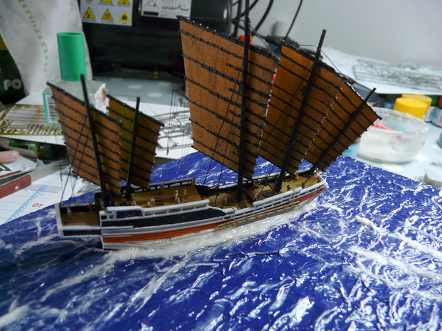 La jonque IMAI est toute petite, mais il y a tout de même 5 mats. Cinq voiles en lattes végétales complètent le tout. Le montage d’une 20 ène de pièces, est très simple. Je n’ai utilisé que des peintures GUNZE pour ces trois kits, retravaillées à la peinture à l’huile en tube, (comme pour les voiles de la jonque).