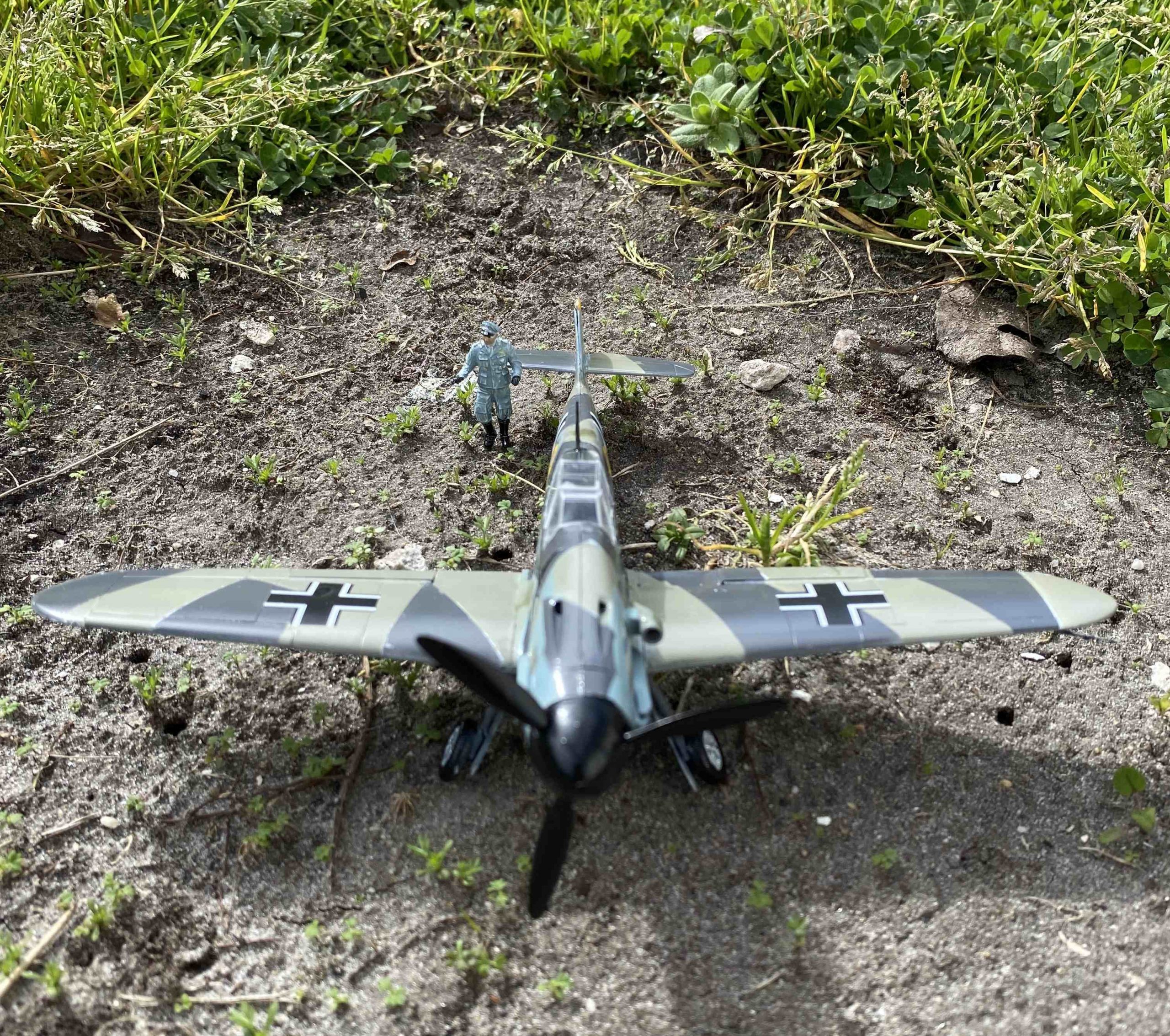 Ce redémarrage a été laborieux pour ce chasseur, j’ai repris mes notes et me suis mis à l’ouvrage mais le résultat n’est pas réellement satisfaisant. Peut être la coupure et le nouvel environnement… Bref, j’ai mis quelques photos pour vous montrer ce chef d’œuvre en péril que j’ai essayé de mettre un peu en valeur sur un aérodrome de fortune, en l’occurrence mon jardin. J’ai pourtant suivi tous les conseils de mon président unique et préféré dans la méthodologie à appliquer, sous-couche, masquage, collage, peinture, vernis….. This restart was laborious for this fighter, I picked up my notes and got to work but the result is not really satisfactory. Maybe the cut and the new environment… Anyway, I put some photos to show you this masterpiece in danger that I tried to highlight a little on a makeshift airfield, in this case my garden. Yet I followed all the advice of my unique and favorite president in the methodology to be applied, undercoating, masking, gluing, painting, varnish…..