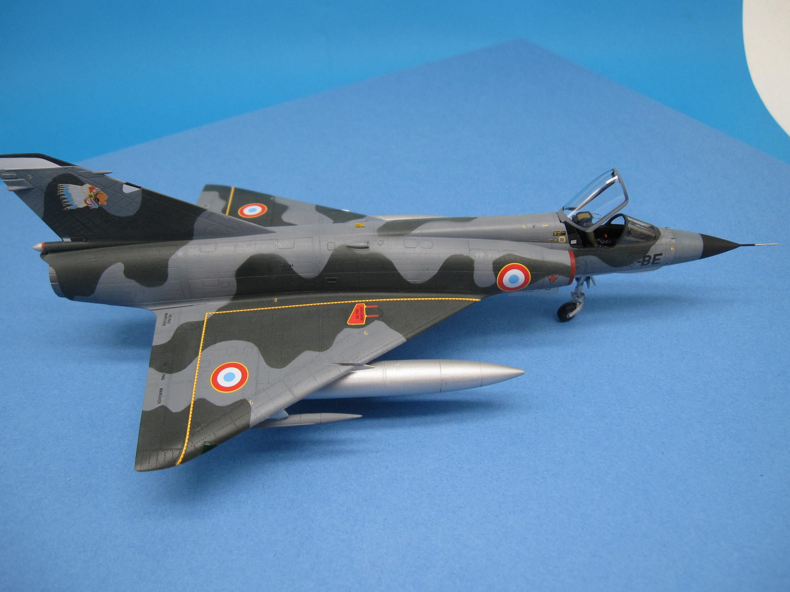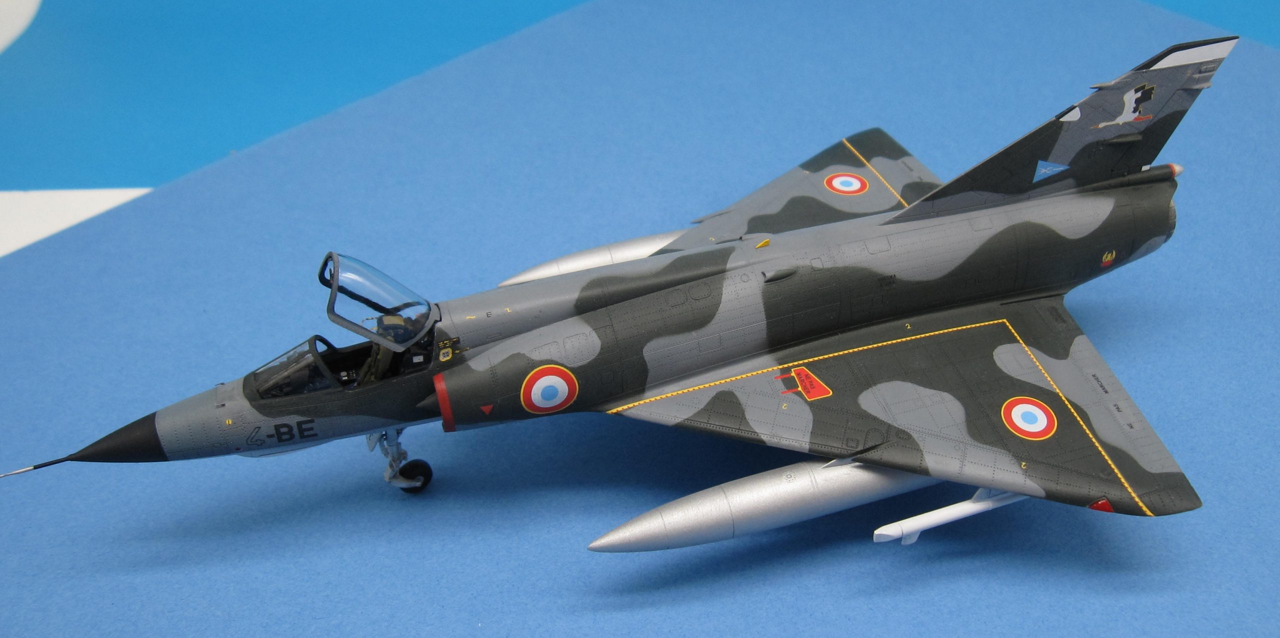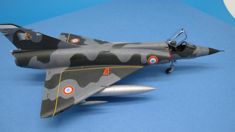 Un joli petit Mirage IIIE au 1/72 pour remplacer le bon vieux Heller, c’était bien tentant. Allez hop, l’aventure commence… Déjà, faut bien dire que c’est du short run, même s’il est de qualité. Au premier abord, plein de pièces bien moulées et des possibilités de décorations attrayantes. Au deuxième abord, gravure trop prononcée, découpe des pièces principales avec plans de joints bizarres (la dérive et les demi intrados en particulier) et pas mal de pièces à nettoyer pour cause de bavures. Le montage, une purge ! L’intrados n’a pas la même épaisseur de chaque côté, il faut donc poncer, raboter, la jonction aile-fuselage est à faire par moitiés sinon on a un gouffre à l’emplanture. Même observation pour la sortie réacteur, les demi coques de fuselage ont une épaisseur différente, donc séance de ponçage après avoir collé le fuselage, et on ne peut mettre la tuyère qu’à ce moment, bonjour l’angoisse. D’autant qu’installer les vérins en photodécoupe à l’intérieur dudit anneau est plutôt sportif ! On passe rapidement sur l’ajustage pointe avant, entrées d’air et corps proprement dit qui occupent un brin encore. Dans les gags, bien penser à raboter le siège, sinon la verrière ne ferme pas. Histoire d’atténuer la gravure, une couche d’apprêt Tamiya a été pulvérisée, pas de jus après peinture on voit déjà bien assez la structure comme ça. Les décorations sont sympas, même si les motifs ne répondent pas bien aux indispensables Micro Set et Sol, au passage, les masques en plastique, sensés protéger les zones à ne pas peindre, sont bien moins performants que les classiques en papier. Conclusion, il est terminé, youpi et ouf !!! A nice little Mirage IIIE at 1/72 to replace the good old Heller, it was quite tempting. Come on, hop, the adventure begins… Already, it must be said that it is short run, even if it is of quality. At first glance, plenty of well-molded parts and attractive decoration possibilities. At second glance, too pronounced engraving, cutting out the main parts with strange joint plans (the fin and the half-foils in particular) and quite a few parts to be cleaned due to burrs. The editing, a purge! The intrados does not have the same thickness on each side, so it is necessary to sand, plane, the wing-fuselage junction should be done in halves otherwise we have a gap at the foot. Same observation for the reactor outlet, the half hulls of the fuselage have a different thickness, so sanding session after bonding the fuselage, and one can only put the nozzle at that moment, hello anxiety. Especially since installing the photocutting cylinders inside the said ring is rather sporty! We quickly move on to the front-tip adjustment, air inlets and body itself which occupy another strand. In gags, remember to plane the seat, otherwise the canopy does not close. To mitigate the engraving, a layer of Tamiya primer was sprayed, no juice after painting we already see quite enough of the structure like that. The decorations are nice, even if the patterns do not respond well to the essential Micro Set and Sol, by the way, the plastic masks, supposed to protect the areas not to be painted, are much less efficient than the classic paper ones. Conclusion, it is finished, yay and oof!!!