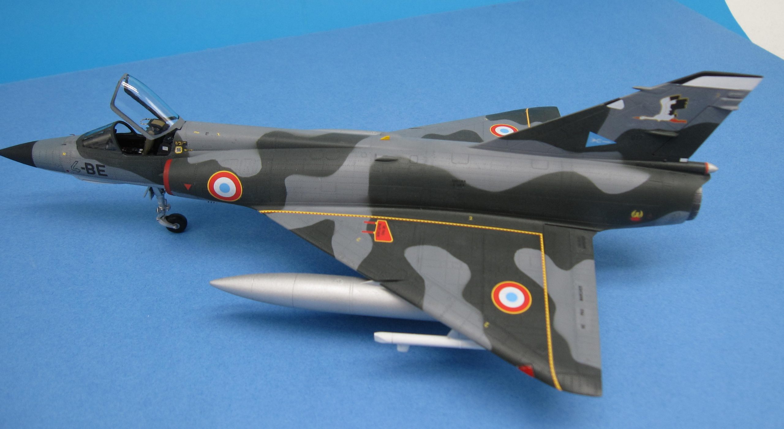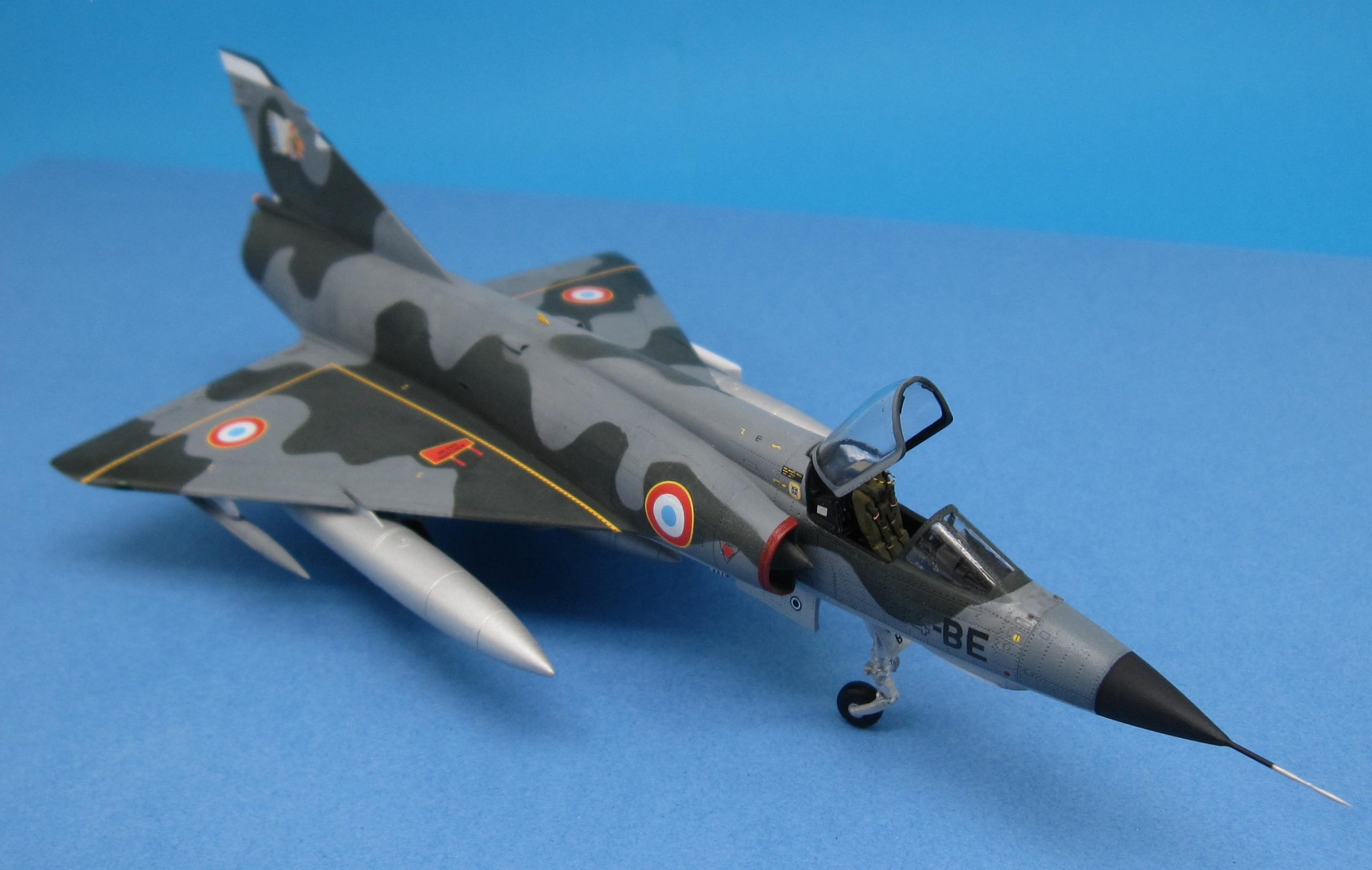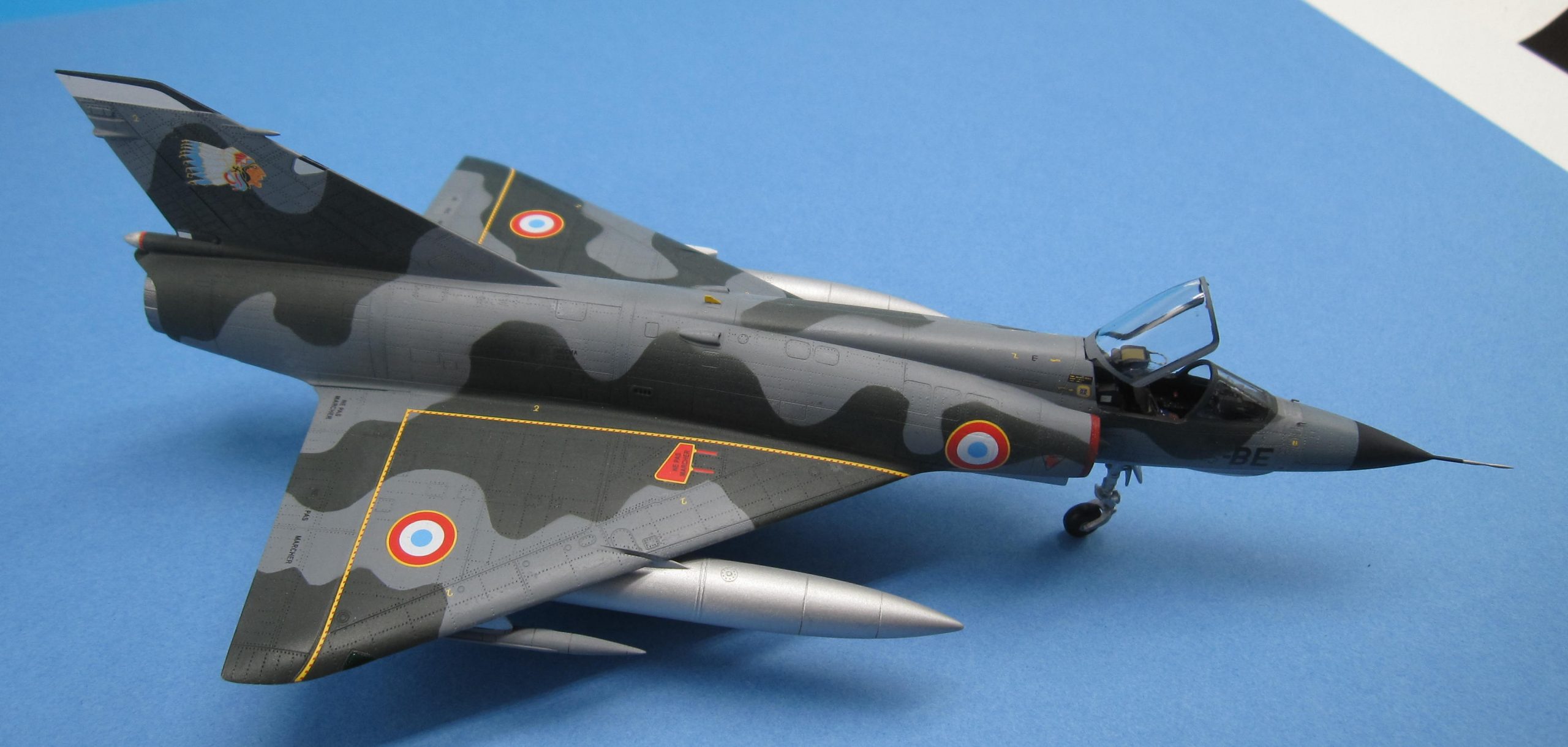 Un joli petit Mirage IIIE au 1/72 pour remplacer le bon vieux Heller, c’était bien tentant. Allez hop, l’aventure commence… Déjà, faut bien dire que c’est du short run, même s’il est de qualité. Au premier abord, plein de pièces bien moulées et des possibilités de décorations attrayantes. Au deuxième abord, gravure trop prononcée, découpe des pièces principales avec plans de joints bizarres (la dérive et les demi intrados en particulier) et pas mal de pièces à nettoyer pour cause de bavures. Le montage, une purge ! L’intrados n’a pas la même épaisseur de chaque côté, il faut donc poncer, raboter, la jonction aile-fuselage est à faire par moitiés sinon on a un gouffre à l’emplanture. Même observation pour la sortie réacteur, les demi coques de fuselage ont une épaisseur différente, donc séance de ponçage après avoir collé le fuselage, et on ne peut mettre la tuyère qu’à ce moment, bonjour l’angoisse. D’autant qu’installer les vérins en photodécoupe à l’intérieur dudit anneau est plutôt sportif ! On passe rapidement sur l’ajustage pointe avant, entrées d’air et corps proprement dit qui occupent un brin encore. Dans les gags, bien penser à raboter le siège, sinon la verrière ne ferme pas. Histoire d’atténuer la gravure, une couche d’apprêt Tamiya a été pulvérisée, pas de jus après peinture on voit déjà bien assez la structure comme ça. Les décorations sont sympas, même si les motifs ne répondent pas bien aux indispensables Micro Set et Sol, au passage, les masques en plastique, sensés protéger les zones à ne pas peindre, sont bien moins performants que les classiques en papier. Conclusion, il est terminé, youpi et ouf !!! A nice little Mirage IIIE at 1/72 to replace the good old Heller, it was quite tempting. Come on, hop, the adventure begins… Already, it must be said that it is short run, even if it is of quality. At first glance, plenty of well-molded parts and attractive decoration possibilities. At second glance, too pronounced engraving, cutting out the main parts with strange joint plans (the fin and the half-foils in particular) and quite a few parts to be cleaned due to burrs. The editing, a purge! The intrados does not have the same thickness on each side, so it is necessary to sand, plane, the wing-fuselage junction should be done in halves otherwise we have a gap at the foot. Same observation for the reactor outlet, the half hulls of the fuselage have a different thickness, so sanding session after bonding the fuselage, and one can only put the nozzle at that moment, hello anxiety. Especially since installing the photocutting cylinders inside the said ring is rather sporty! We quickly move on to the front-tip adjustment, air inlets and body itself which occupy another strand. In gags, remember to plane the seat, otherwise the canopy does not close. To mitigate the engraving, a layer of Tamiya primer was sprayed, no juice after painting we already see quite enough of the structure like that. The decorations are nice, even if the patterns do not respond well to the essential Micro Set and Sol, by the way, the plastic masks, supposed to protect the areas not to be painted, are much less efficient than the classic paper ones. Conclusion, it is finished, yay and oof!!!