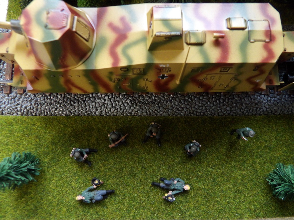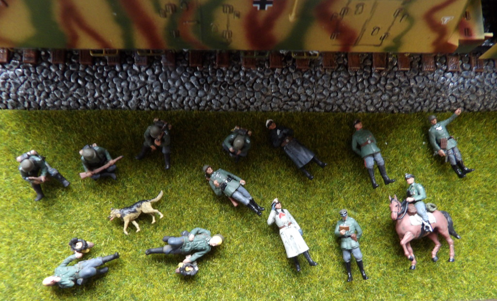 Voulant faire simple, j’ai découpé dans du tapis de pelouse à train, ma pelouse que j’ai collée avec du double face. Une couche de peinture noire, cerne tous les bords du diorama y compris la face arrière de la falaise. Ne souhaitant pas faire de scène guerrière, j’ai trouvé chez Tonton ALI, de chouettes figurines au 1/72, de soldats en position de travail et au repos. Ces figurines sont en résine et déjà peintes. Elles sont en série limitée, (bien regarder la disponibilité avant de commander, je me suis fait pièger). J’ai également demandé à mon ami Pierrot de me peindre trois soldats germains de la marque Zvezda ( merci à lui !). Wanting to make it simple, I cut out of carpet from lawn to train, my lawn that I glued with double face. A layer of black paint, surrounds all the edges of the diorama including the back of the cliff. Not wishing to make a war scene, I found at Tonton ALI, nice 1/72 figures, soldiers in working position and at rest. These figures are made of resin and already painted. They are in limited edition, (well look availability before ordering, I got trapped). I also asked my friend Pierrot to paint me three German soldiers of the brand Zvezda ( thank you to him!).