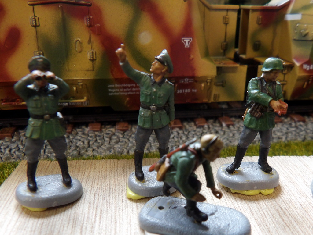 Voulant faire simple, j’ai découpé dans du tapis de pelouse à train, ma pelouse que j’ai collée avec du double face. Une couche de peinture noire, cerne tous les bords du diorama y compris la face arrière de la falaise. Ne souhaitant pas faire de scène guerrière, j’ai trouvé chez Tonton ALI, de chouettes figurines au 1/72, de soldats en position de travail et au repos.  Ces figurines sont en résine et déjà peintes. Elles sont en série limitée, (bien regarder la disponibilité avant de commander, je me suis fait pièger). J’ai également demandé à mon ami Pierrot de me peindre trois soldats germains de la marque Zvezda ( merci à lui !). Wanting to make it simple, I cut out of carpet from lawn to train, my lawn that I glued with double face. A layer of black paint, surrounds all the edges of the diorama including the back of the cliff. Not wishing to make a war scene, I found at Tonton ALI, nice 1/72 figures, soldiers in working position and at rest.  These figures are made of resin and already painted. They are in limited edition, (well look availability before ordering, I got trapped). I also asked my friend Pierrot to paint me three German soldiers of the brand Zvezda ( thank you to him!).