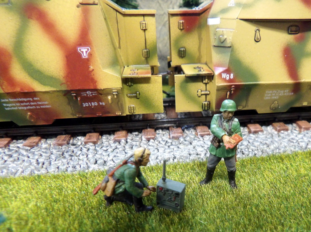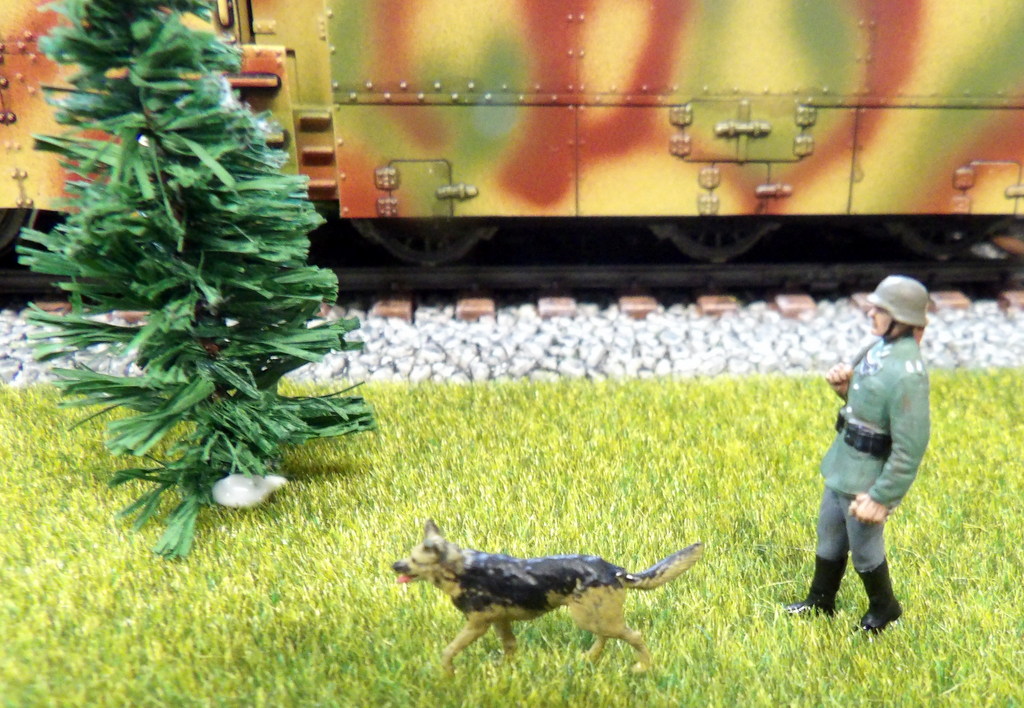 Les sapins du fond du diorama sont des arbres à train HO. Pour le premier plan, le ballast étant très haut, j’ai rajouté une couche de polystyrène de 5 mm pour rattraper de la hauteur (il faut bien que le personnel puisse monter dans le train, sans avoir l’air d’escalader une colline). Et j’ai recollé une pelouse sur le premier plan. J’ai rajouté quelques sapins qu’il me restait. Puis j’ai fait une petite mise en scène avec les personnages. The fir trees at the bottom of the diorama are HO train trees. For the foreground, the ballast being very high, I added a layer of 5 mm polystyrene to catch the height (it is necessary that the staff can get on the train, without seeming to climb a hill). And I put a lawn back in the foreground. I added a few trees that I had left. Then I did a little staging with the characters.
