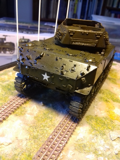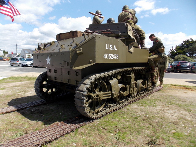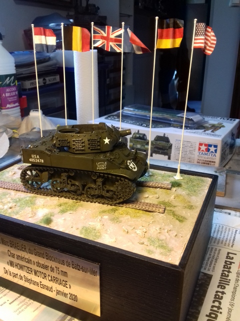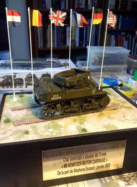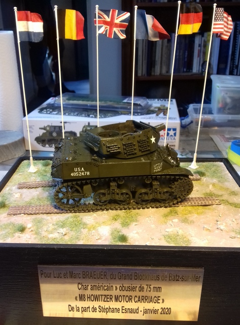 A cet effet, des chars dont plus précisément des » obusiers M8 » sur châssis Stuart seront actifs dans cette zone de combat. Un exemplaire d’époque a été restauré et confié par le Musée des Blindés de Saumur à Luc et marc Braeuer, conservateurs du Musée du Grand Blockhaus de Batz-sur-Mer (44). Outre une belle cérémonie d’inauguration à laquelle j’ai eu le plaisir d’assister, un plus tard, je me suis amusé à réaliser ce char pour l’offrir aux frères Braeuer.