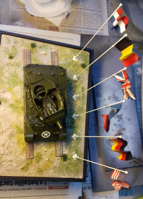 Un socle en chute de parquet flottant présente le terrain sec et les plaques PSP où est posé le blindé avec son nom de baptême peint à la main, faute d’avoir pu trouver des transferts à sec idoines, ainsi que les drapeaux de pays européens « faits maison » en papier, colle à bois et cordes à piano, encadrant le tout.