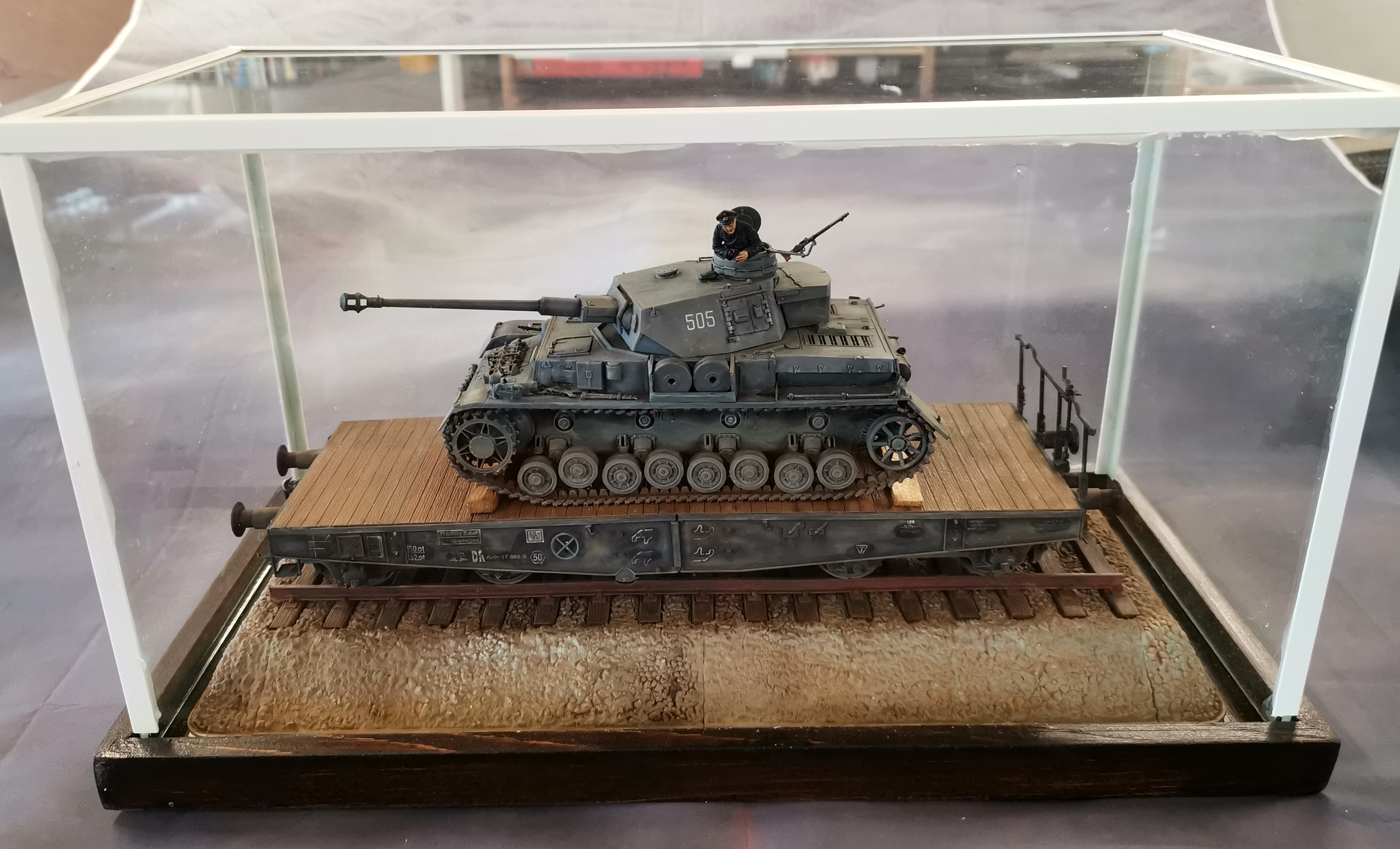 Pareil que pour le char, aucune pièces en photodécoupe. Le montage est d’une rapidité et d’simplicité, aucun travail de mastic à prévoir. La teinte du wagon sera gris panzer. Le plancher bois est peint en sous couche humbrol (couleur bois) puis travail à la peinture à l’huile (même procédé que pour les ponts de navires). Le socle sera peint couleur pierre puis différents jus à huile finiront de la vieillir. Les rails sont peints en Humbrol et les traverses de chemin de fer sont peintes à huile. Le vieillissement sera fait aussi avec les pastels Tamiya.