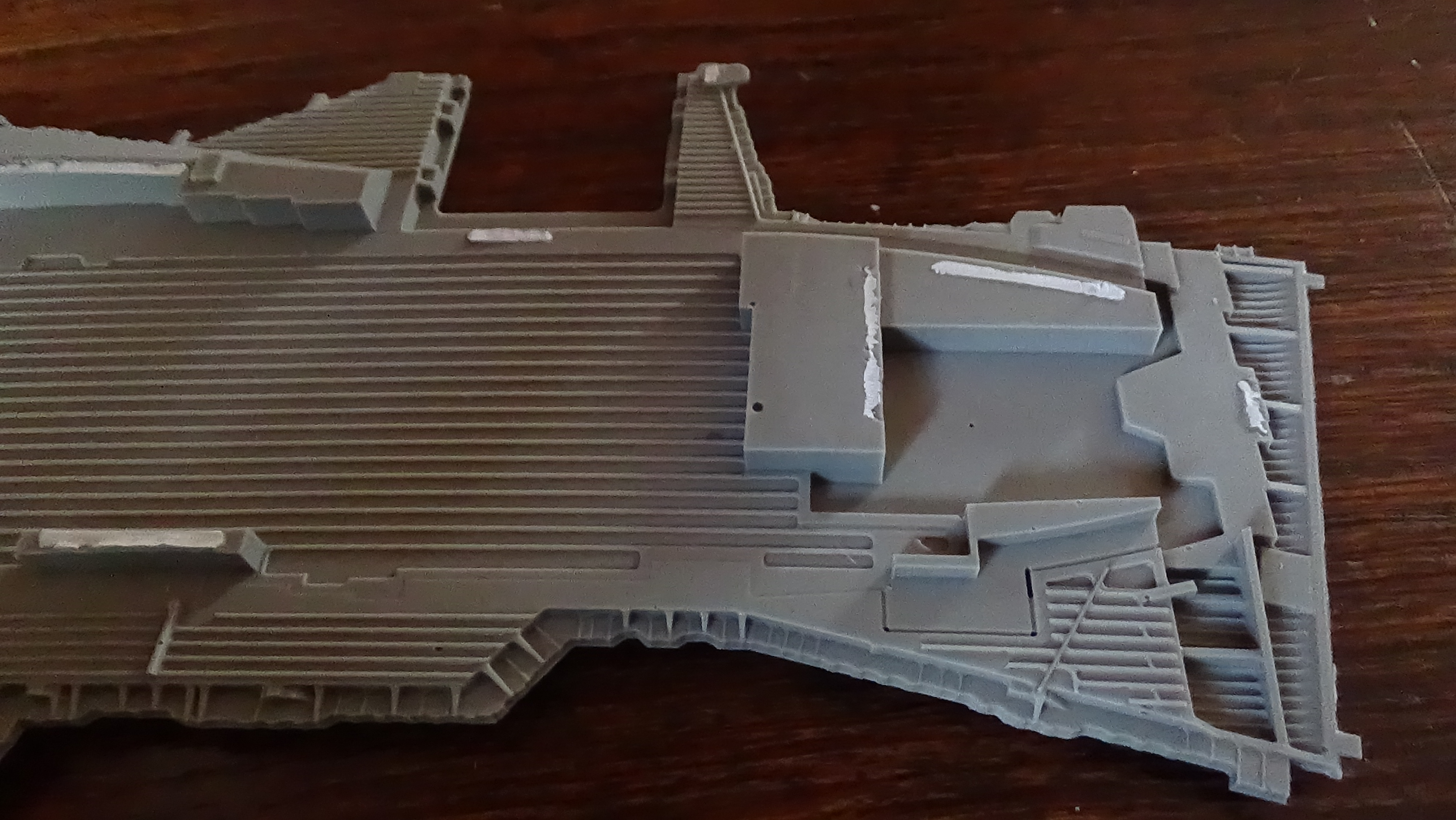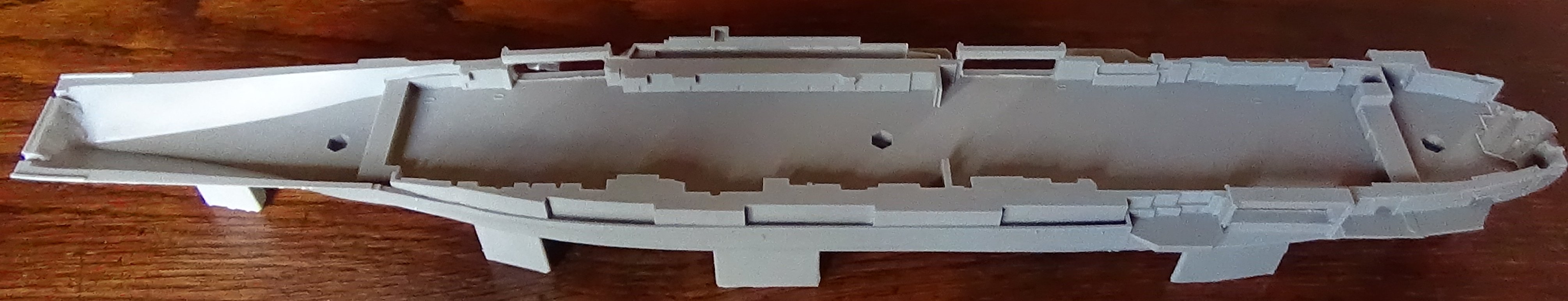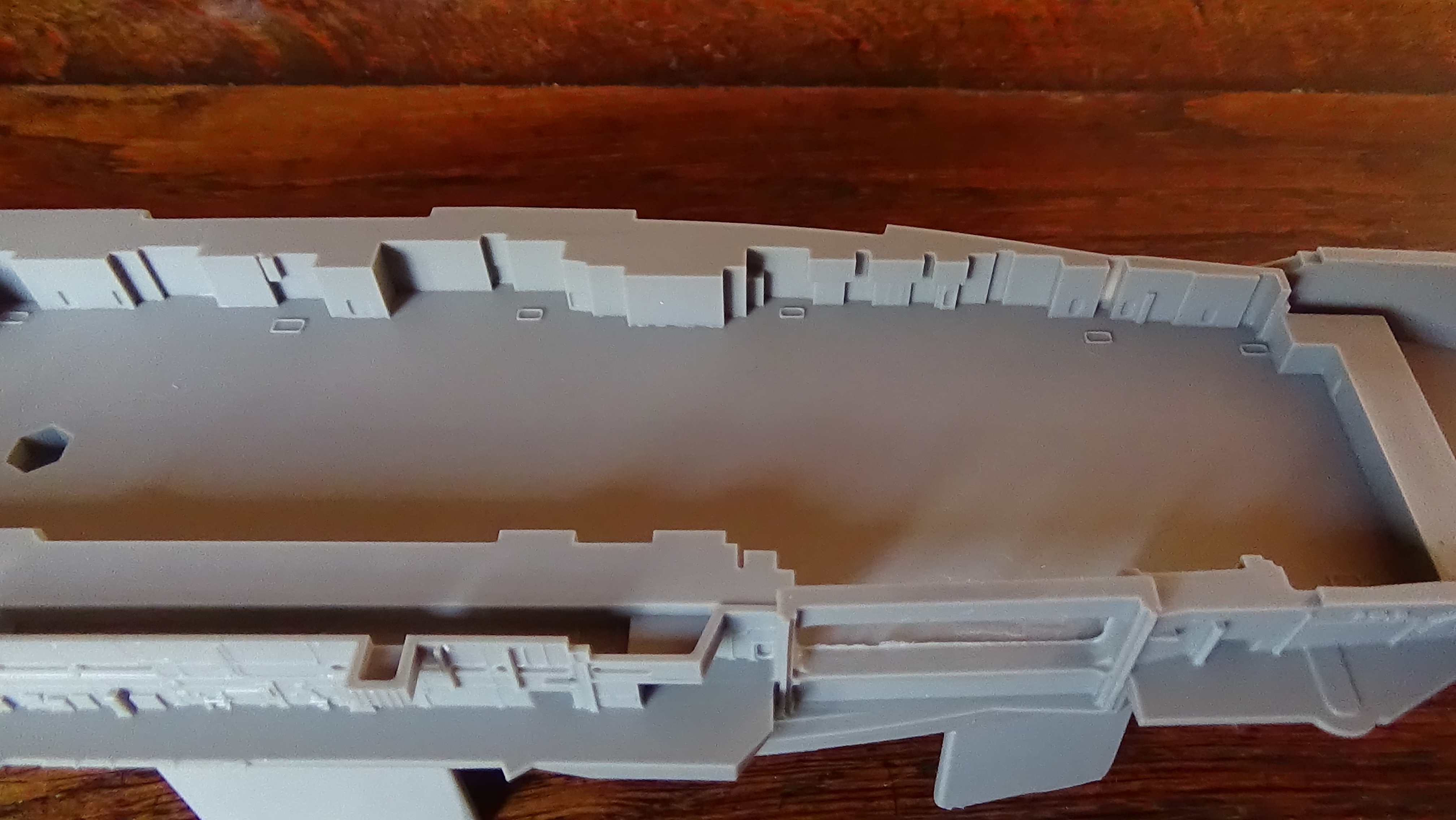 Le hangar. Le hangar est bien rendu et « pleure » pour du détaillage en scratch. Par chance le Midway est maintenant un musée flottant à San Diego et de nombreuses photos de son hangar sont disponibles sur le net. À noter les trois emplacements prévus pour visser la maquette à son support, prévenant une déformation éventuelle sur une grande pièce de résine. Les trois vis sont fournies :