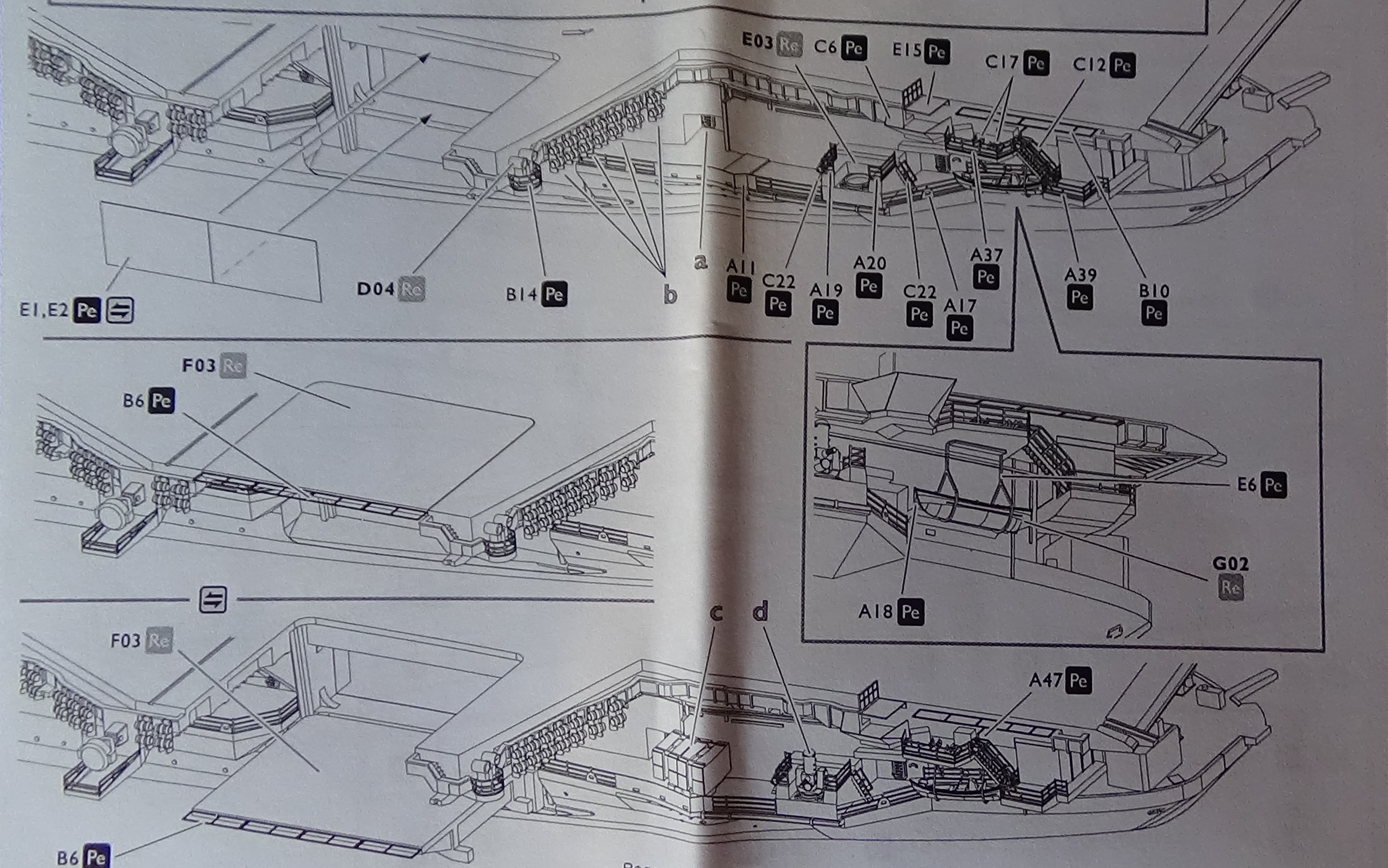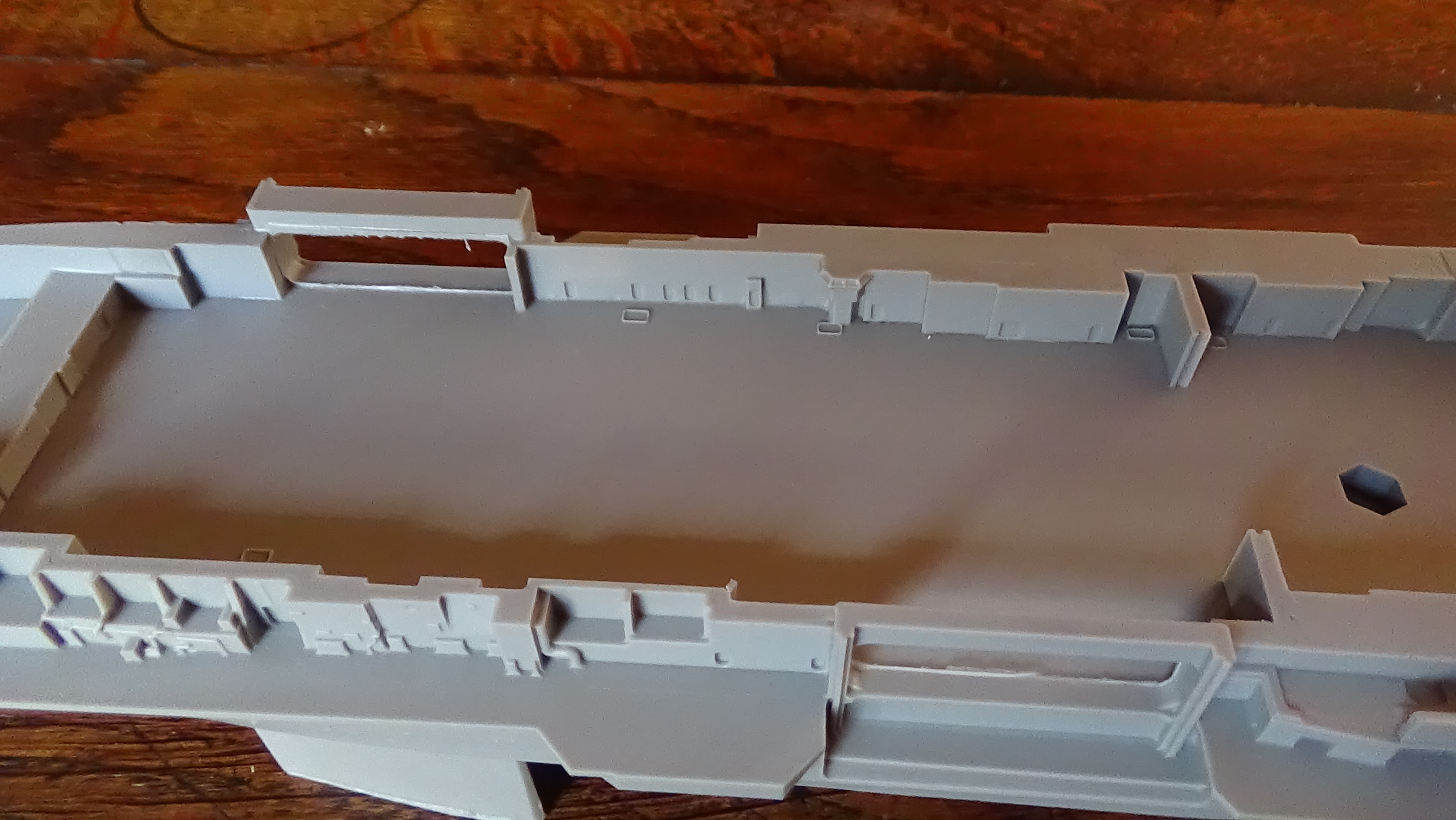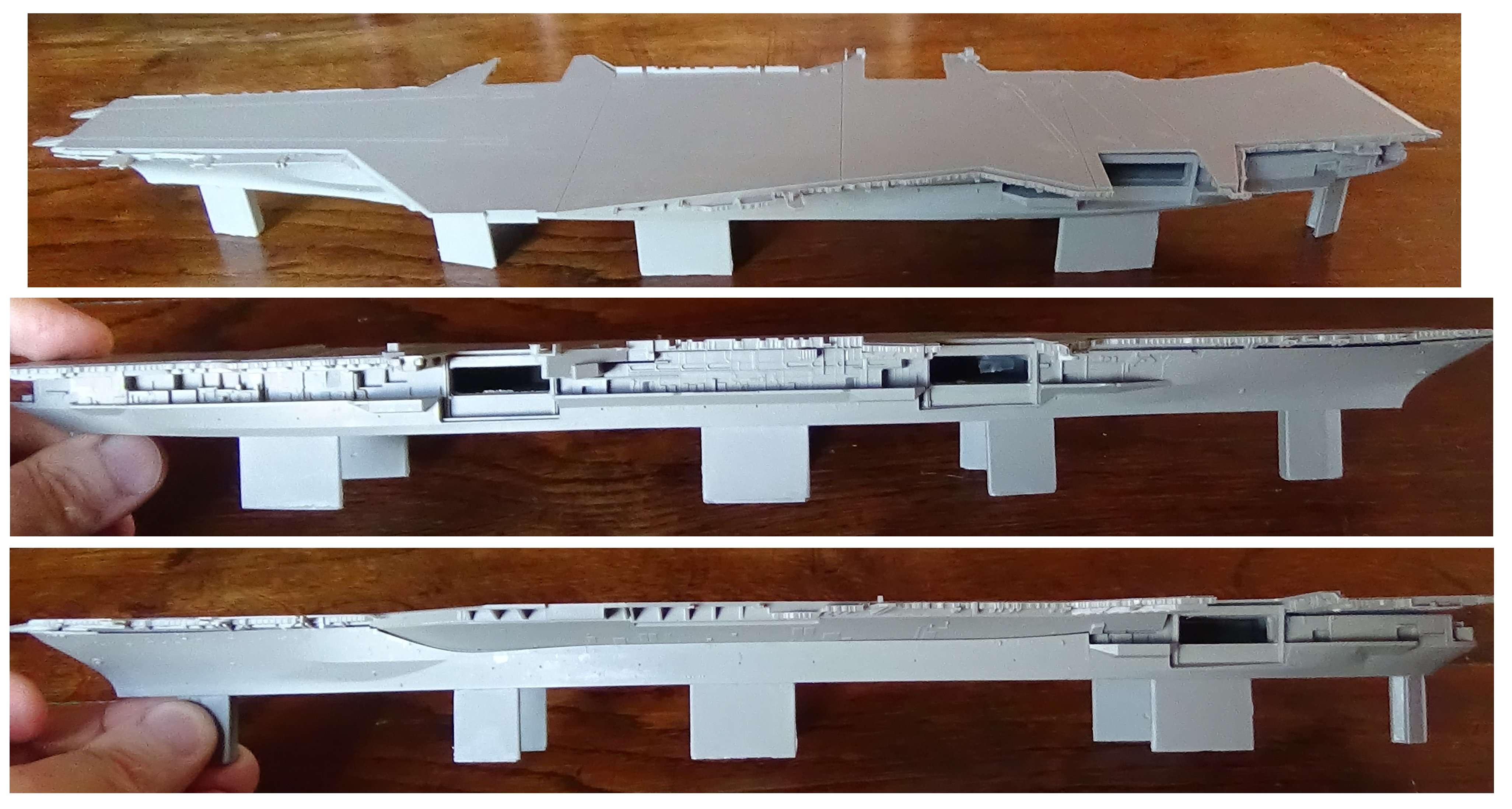 Le hangar. Le hangar est bien rendu et « pleure » pour du détaillage en scratch. Par chance le Midway est maintenant un musée flottant à San Diego et de nombreuses photos de son hangar sont disponibles sur le net. À noter les trois emplacements prévus pour visser la maquette à son support, prévenant une déformation éventuelle sur une grande pièce de résine. Les trois vis sont fournies :
