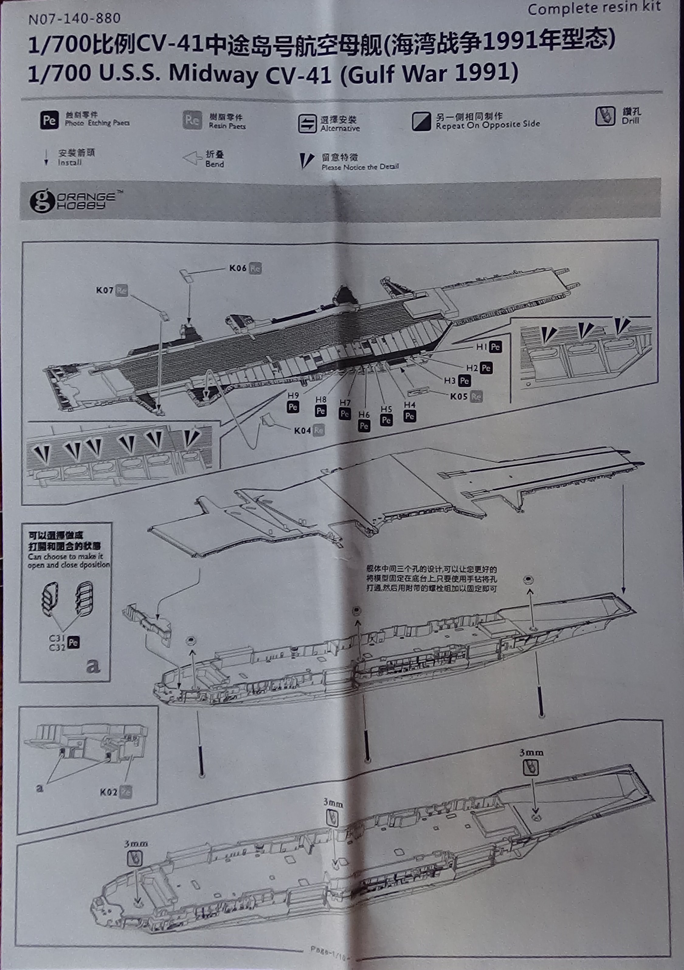 Encore un nouveau kit exceptionnel de la marque Orange Hobby au 1/700e. Il s’agit du porte-avions américain USS Midway (CVA-41) dans sa version ultime, celle de la Guerre du Golfe (1991) en version « waterline ». Un très gros kit en résine et photo découpe, livré avec une partie de son groupe aérien de l’époque.