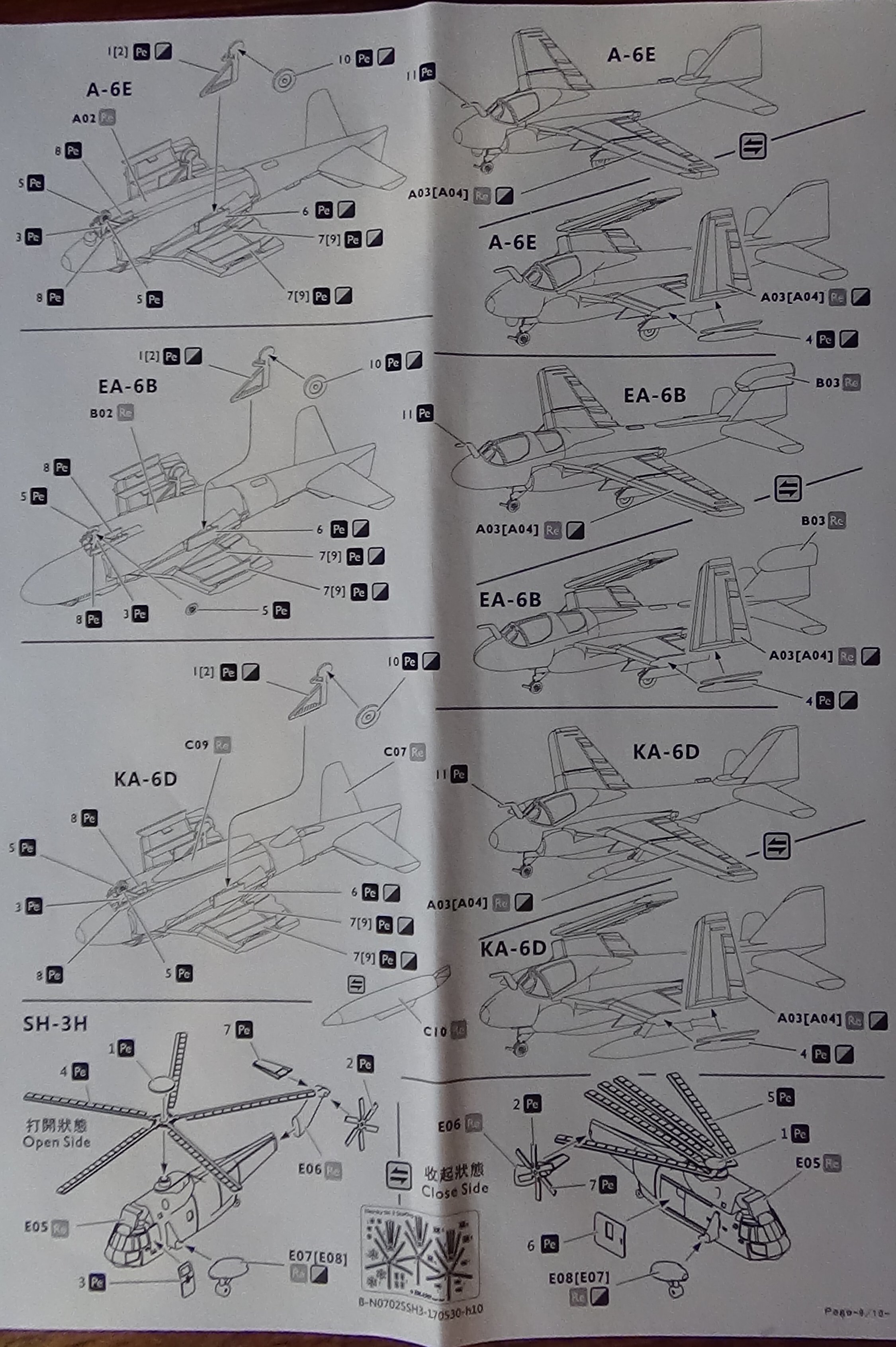 Les avions : curieusement Orange Hobby n’inclut pas les F/A 18 Hornet qui constituent l’essentiel du parc, mais se concentre sur les A-6 qui sont déclinés en 3 versions : six A6-E, quatre EA6-B Prowler et deux tankers KA-6D. Il s’agit probablement d’une mesure pour limiter le prix du kit, sachant que les F-18 sont disponibles en plastique injecté chez Trumpeter notamment. Orange Hobby commercialise tout de même des F-18 par lots de six mais séparément du kit.