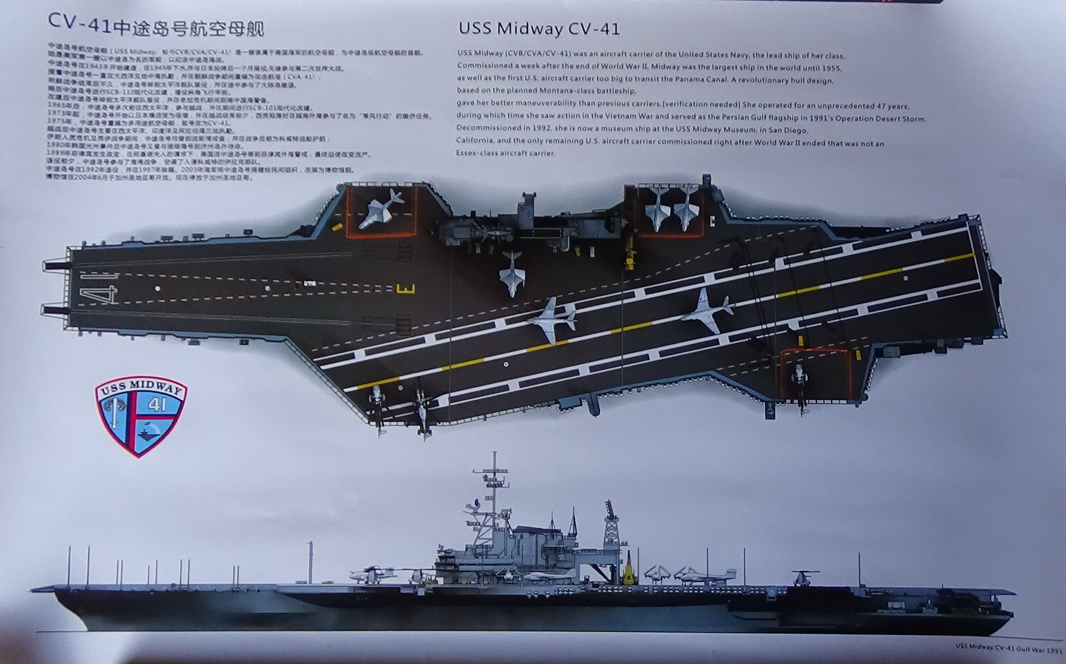 Le Midway de 1991 est très différent du porte-avions d’origine aux lignes simples : il a grossi en largeur, son pont d’envol s’est agrandi de façon démesurée, son ilot n’a plus rien à voir avec l’original, très bas et assez petit.