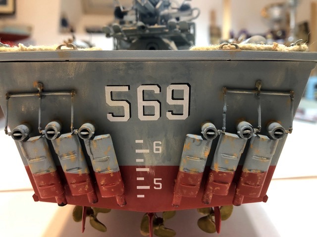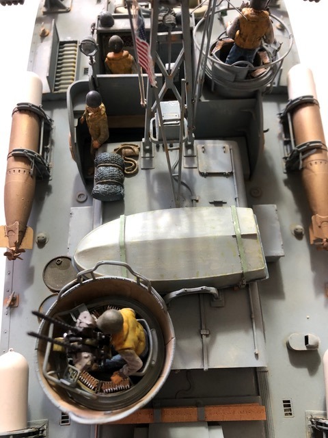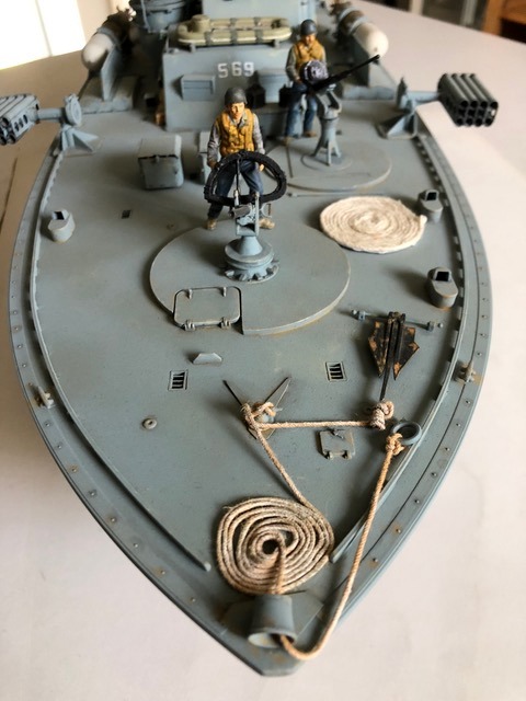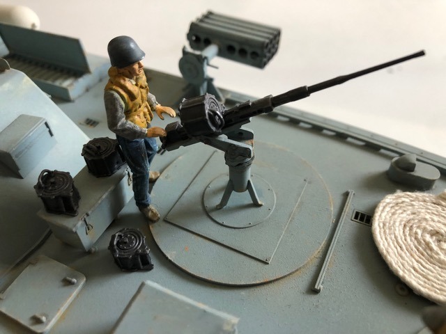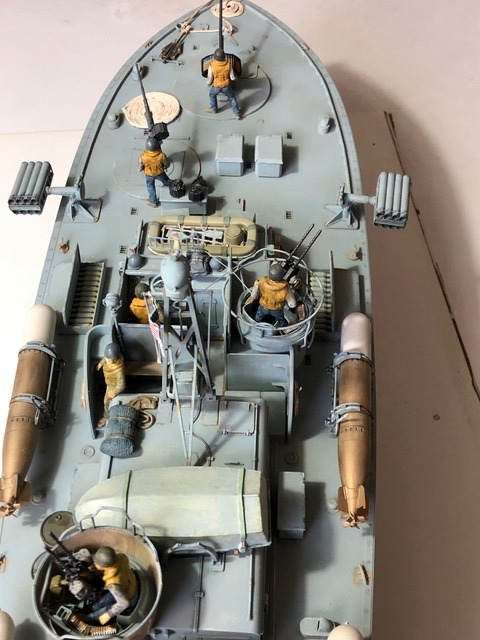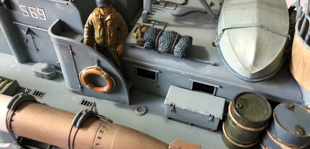 Comme toutes les vedettes Italeri à cette échelle, on trouve de belles grappes de pièces, de la photo découpe, un vrai plaisir à monter et à peindre. J’ai choisi la déco d’une vedette dans les opérations du Pacifique. Coque sous flottaison / Pont et Superstructures : 1/2 Humbrol matt 230 et 1/2 Humbrol matt 37 Eraflures Humbrol matt 28 Coque sous flottaison : 1/2 Revell matt 36 , 1/2 Revell matt 37