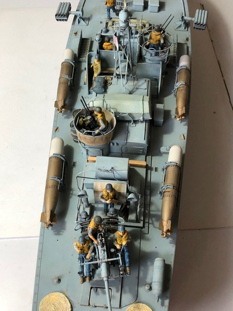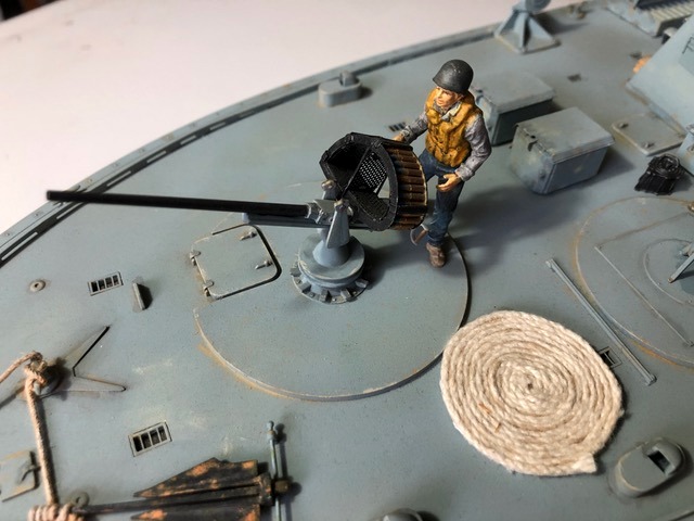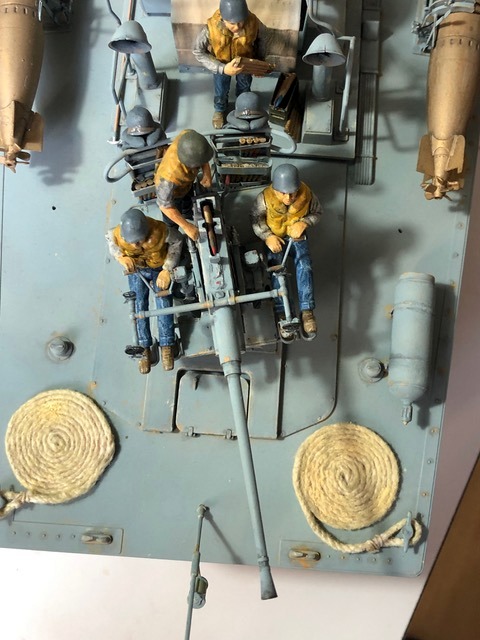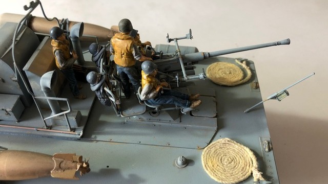 Autres tons utilisés pour manches à air, ponts, canot, radeau, gilets sauvetage, bâches, tubes canons, personnages, etc… Humbrol matt 140 , 83 , 90 , 33 , 89 , 25 , 144 , 34 , 93 ,31 , 81 , 82 , 66 , 28 ,16 , 24 , 60 , 101 , 66 , Metal Cote 27004 Humbrol métal 53 , Tamiya weathering light sand , rust , Tamiya panel accent color black Rouleaux de cordage réalisés par moi. Like all the Italeri stars on this scale, we find beautiful clusters of parts, photo-cut, a real pleasure to assemble and paint. I chose the decoration of a star in Pacific operations. Hull under flotation / Bridge and Superstructures: 1/2 Humbrol matt 230 and 1/2 Humbrol matt 37 Eraflures Humbrol matt 28 Hull under flotation : 1/2 Revell matt 36, 1/2 Revell matt 37