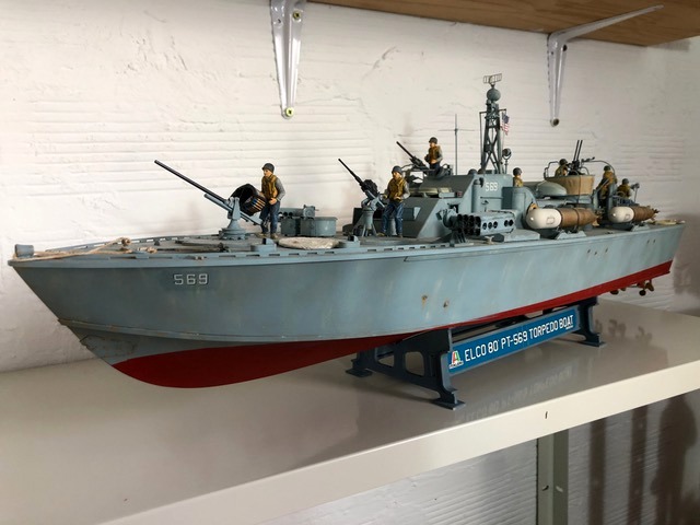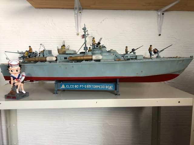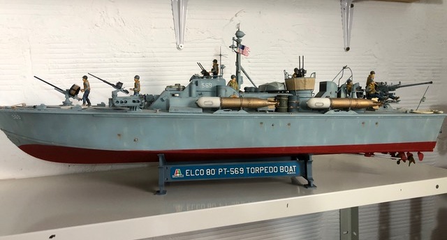 Caractéristiques de l’Elco 80 : Coque bois composée de deux double couches d’acajou collées, rivetées, vissées. 3 moteurs à essence Packard de 1350 à 1500 cv permettant une vitesse de 40 noeuds. Autonomie de 500 milles ( 930 Km ) Equipage 16 hommes. Armement : 1 canon de 40mm, 1 de 37mm, 1 de 20mm, 2 paires de mitrailleuses double de 50, 4 torpilles de 457mm 2 lance roquettes de 12 tubes chacun de 127 mm. Parfois emport de mines sous-marines. Characteristics of the Elco 80: Wooden shell composed of two double layers of mahogany glued, riveted, screwed. 3 Packard gasoline engines from 1350 to 1500 hp allowing a speed of 40 knots. Autonomy of 500 miles (930 Km) Crew 16 men. Armament: 1 40mm cannon, 1 37mm gun, 1 20mm gun, 2 pairs of 50 double machine guns, 4 torpedoes of 457mm 2 launch rockets with 12 tubes each of 127 mm. Sometimes carrying underwater mines.