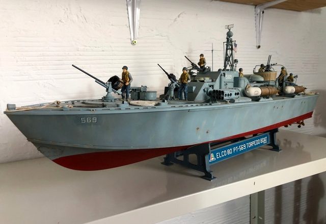 Caractéristiques de l’Elco 80 : Coque bois composée de deux double couches d’acajou collées, rivetées, vissées. 3 moteurs à essence Packard de 1350 à 1500 cv permettant une vitesse de 40 noeuds. Autonomie de 500 milles ( 930 Km ) Equipage 16 hommes. Armement : 1 canon de 40mm, 1 de 37mm, 1 de 20mm, 2 paires de mitrailleuses double de 50, 4 torpilles de 457mm 2 lance roquettes de 12 tubes chacun de 127 mm. Parfois emport de mines sous-marines. Characteristics of the Elco 80: Wooden shell composed of two double layers of mahogany glued, riveted, screwed. 3 Packard gasoline engines from 1350 to 1500 hp allowing a speed of 40 knots. Autonomy of 500 miles (930 Km) Crew 16 men. Armament: 1 40mm cannon, 1 37mm gun, 1 20mm gun, 2 pairs of 50 double machine guns, 4 torpedoes of 457mm 2 launch rockets with 12 tubes each of 127 mm. Sometimes carrying underwater mines.