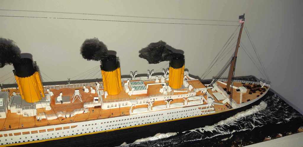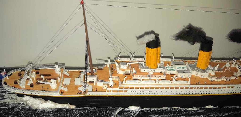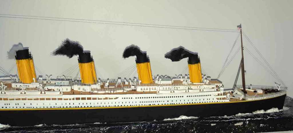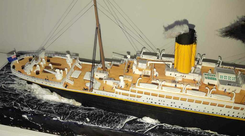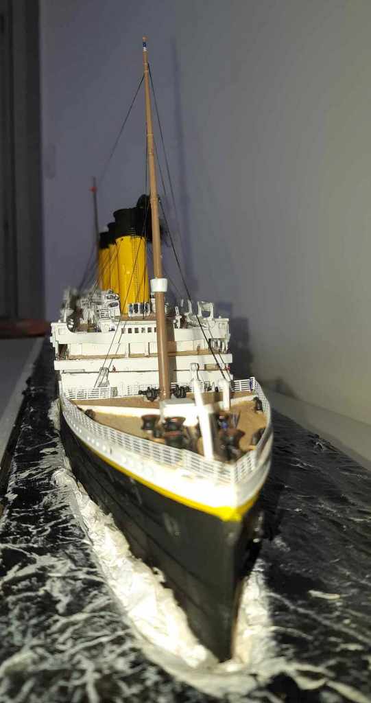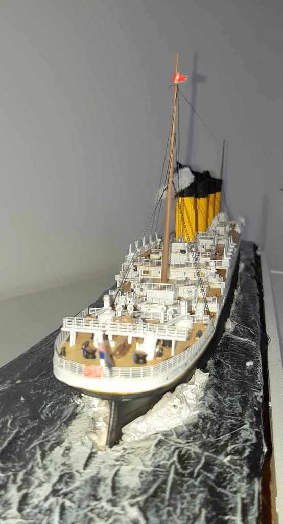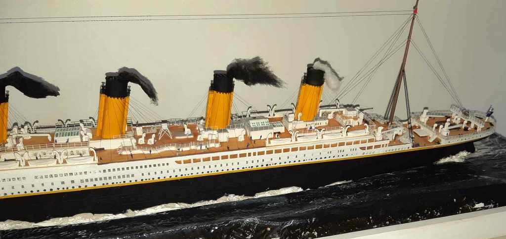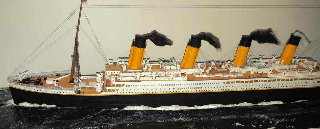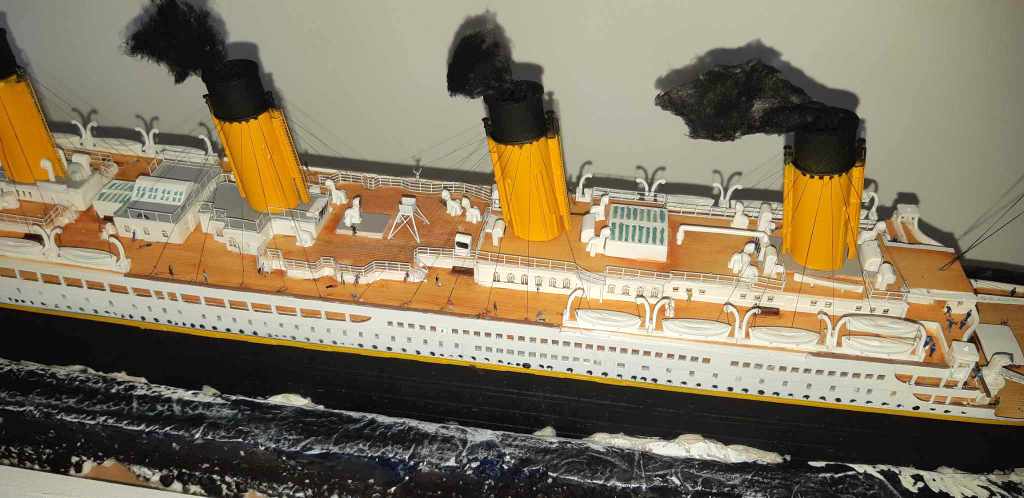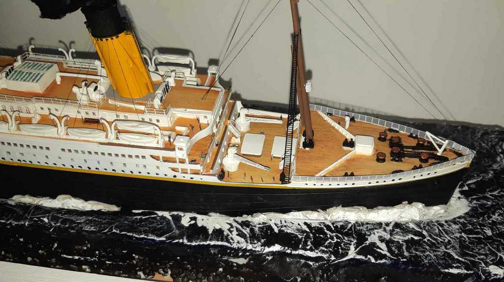 Voilà plus de 15 ans, j’avais essayé de monter la maquette du TITANIC de chez ACADEMY, résultat un fiasco total. J’ai voulu réessayer avec le model du TITANIC de chez revell (fait pour le centenaire, pensant naïvement à un nouveau moule). J’ai acquis le navire, le pont imitation bois et le kit photo découpe Eduard (kit introuvable). A l’ouverture de la boîte, grosse déception, le kit n’a rien de nouveau et celui-ci est archi vieux (quel retour en arrière). A cet instant, je sais que je vais passer de très mauvais moment !!!! Apprêtage des pièces en blanc puis peinture de la coque, au moment de la mise en place des ponts, rien ne va comme il faut !!!! après plein de scrogneugneu et des litres de café, tout roule. Et la patatra ! lors de la mise en place des pont imitations bois, rien ne correspond, je m’aperçois que le kit est prévu pour le kit academy et non le revell !!!!!