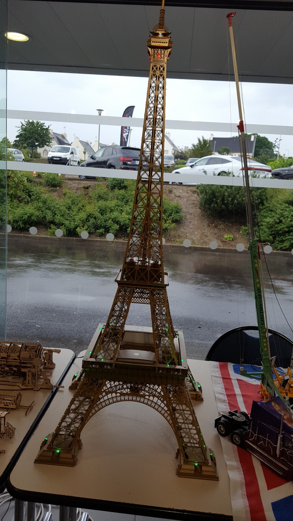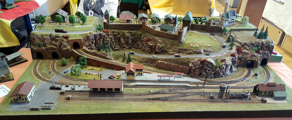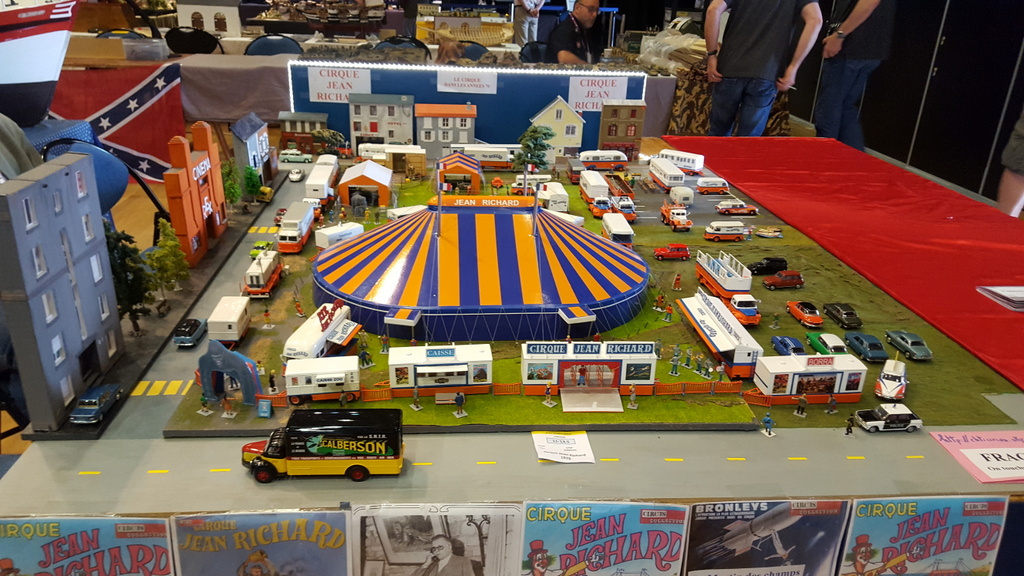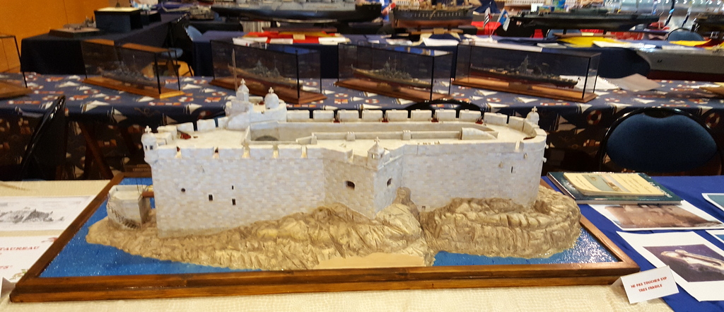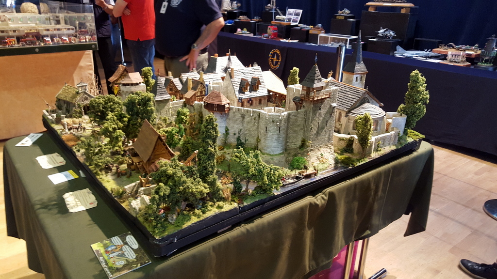 Une fois le stand en place, en route pour la visite. De très belles choses, comme d’habitude en maquettes, autant en blindés, figurines que bateaux, en extérieur sur le bassin évoluaient les bateaux radio-commandés de tous types et fort bien réalisés. Se déroulait également une démonstration d’engins de chantier aussi vrai que nature. On pouvait admirer des niveleuses, chargeuses et toutes sortes d’engins évoluer sur une aire sablée. Mais parmi toute ces réalisations je tiens à citer la reconstitution au 1/75 du château du taureau de Jean Paul, entièrement réalisée d’après des photos et des visites. De l’avis général une très belle pièce.