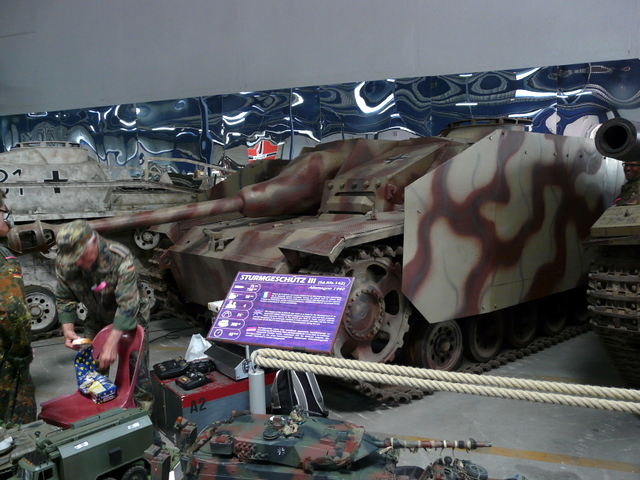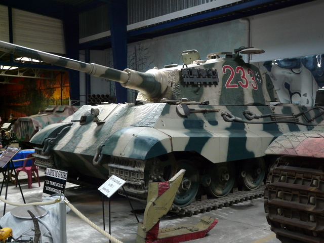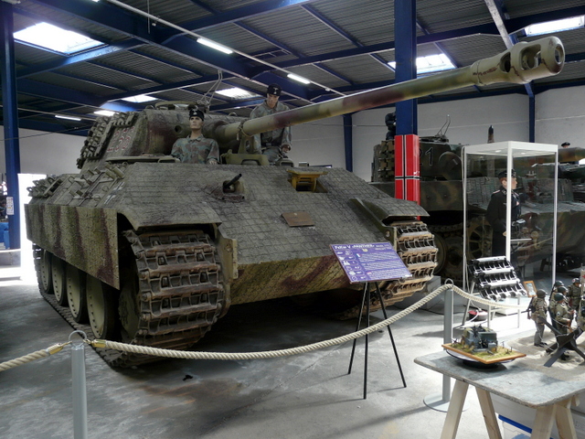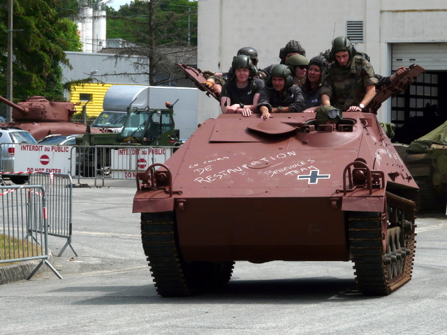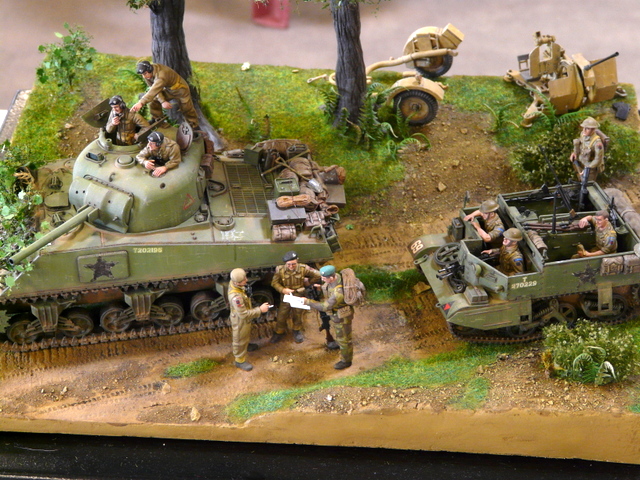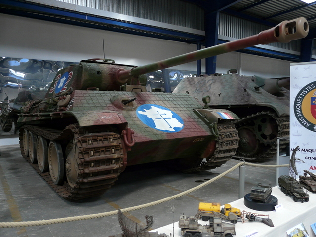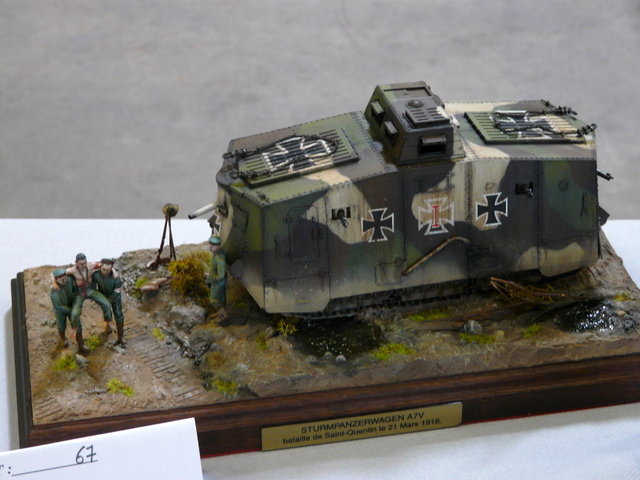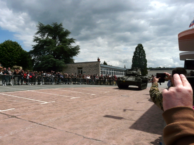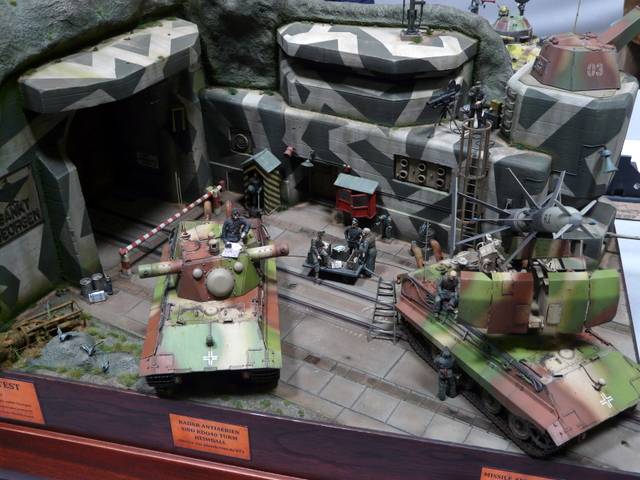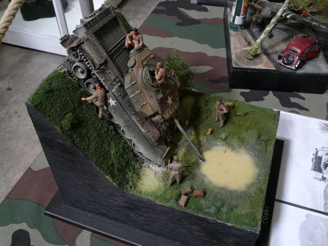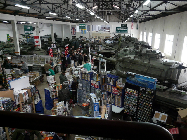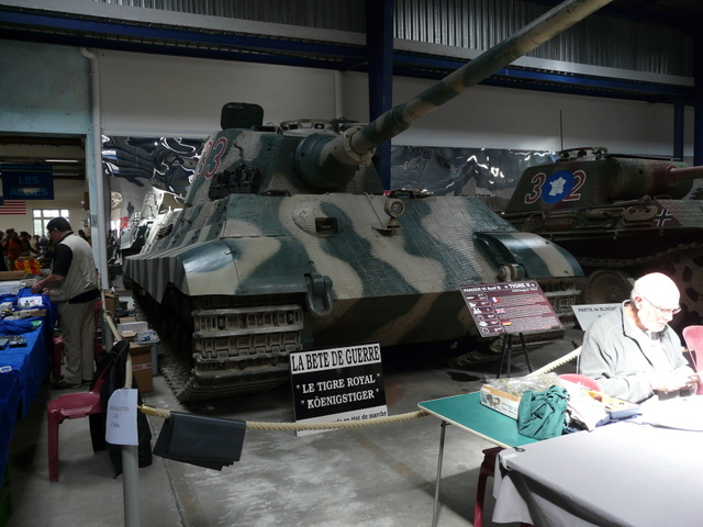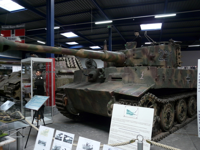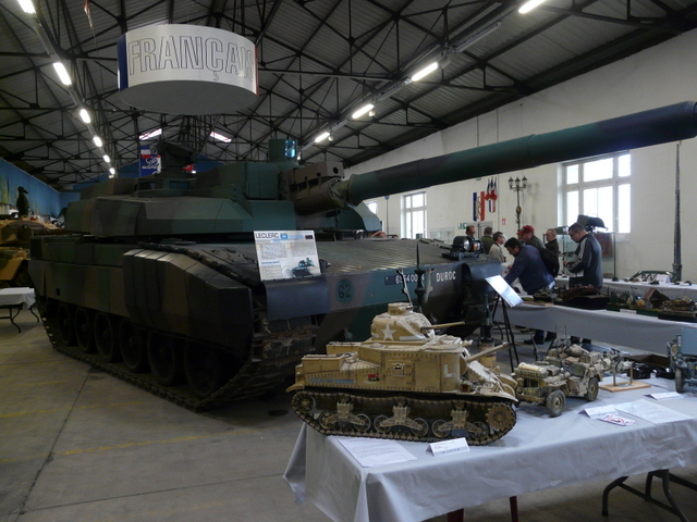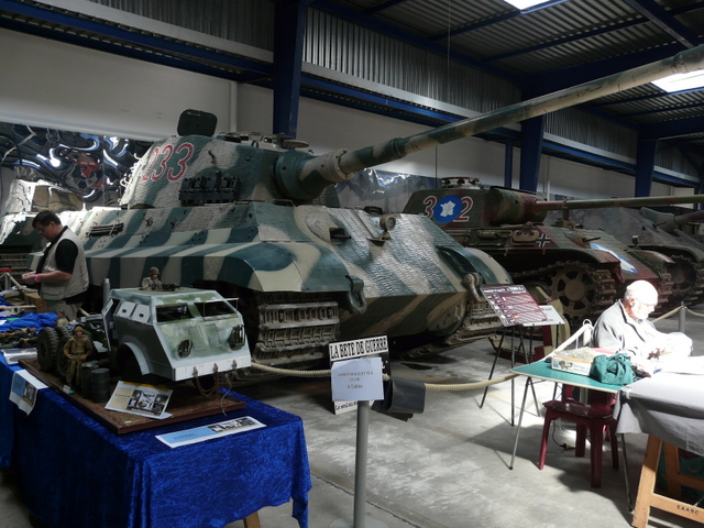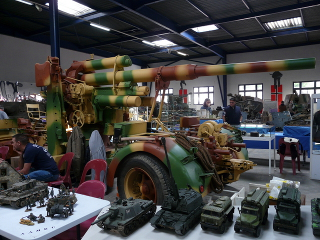 Bizarre, le GPS nous indique un chemin détourné. Nous passons de nombreux rond-points et dans l’un d’entre eux, un petit freinage sportif du Capitaine et là, c’est carrément un V 2, (le pied d’appareil photo) qui explose le dio du cageot ! Pierrot pleure… Je calme les esprits, et en ma qualité de Prez, je déclare solennellement : «pas grave ! Vous allez réparer !». On arrive au Musée, tout de suite surpris par l’ampleur de l’établissement et de cette belle façade peinte en bleu/blanc/rouge. Accueil très sympa. Je passe par l’administration pour percevoir le package papiers et emplacement. Tout est prêt, ça va vite. On rentre dans la place, par la salle blindés allemands 39/45 et là c’est plein les yeux. Nous trouvons notre emplacement dans la salle des alliés et montant notre stand à toucher un canon PAK 40. A deux mètres de nous en face, de superbes chars Anglais. Le stand est vite monté. Je laisse la place pour les deux ingénieurs chargés des réparations du sinistre du cageot. Rapidement réparé par des mains d’experts, on inscrit le dio à Thiébaud dans la catégorie, «dio où il y a plus de colle que de plastique, maintes fois réparés!».