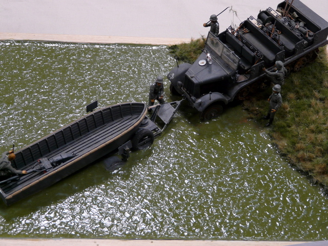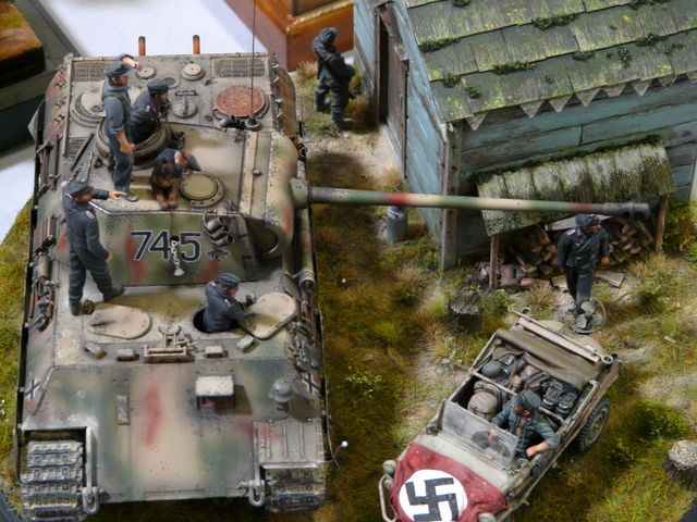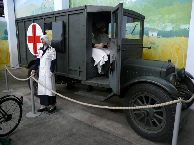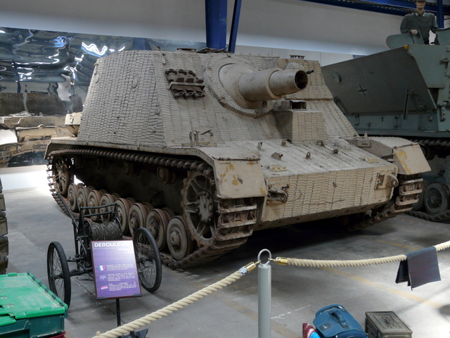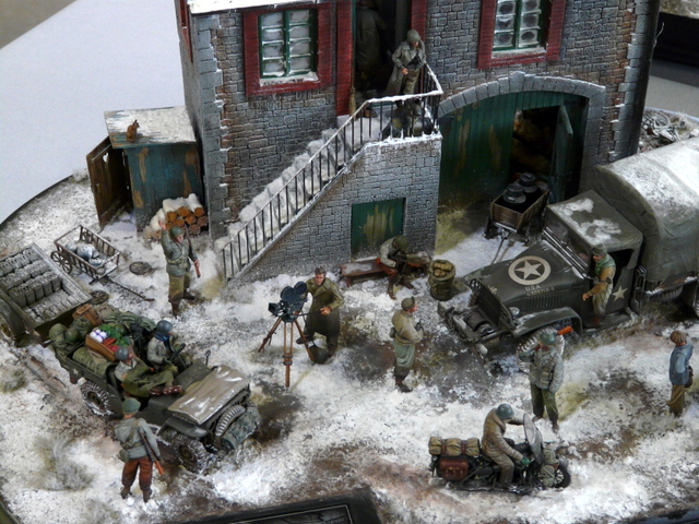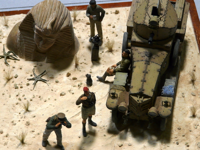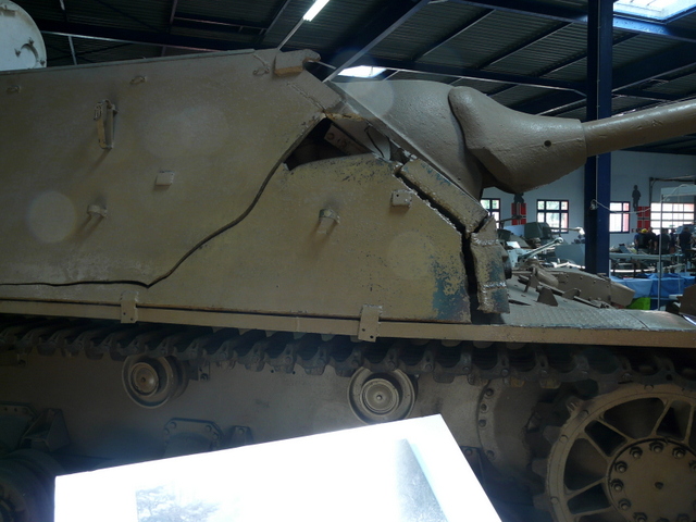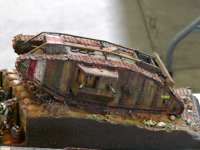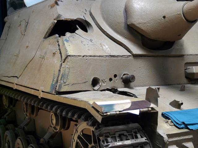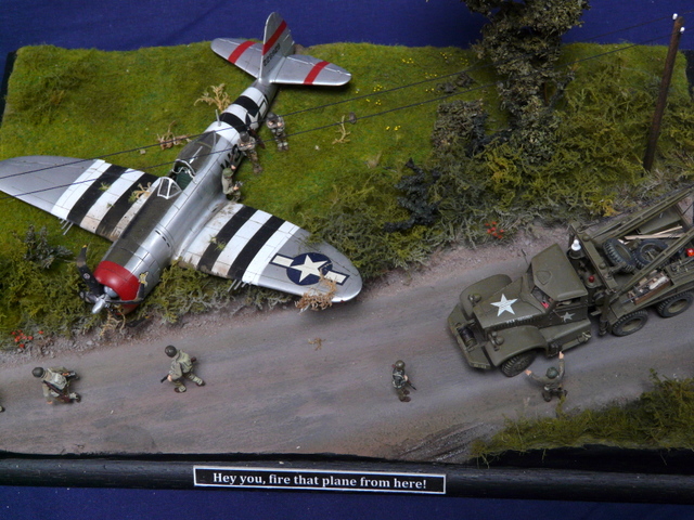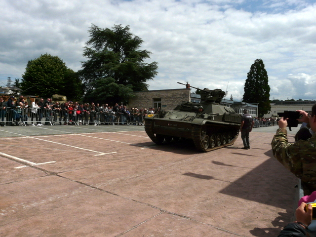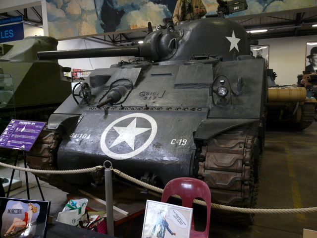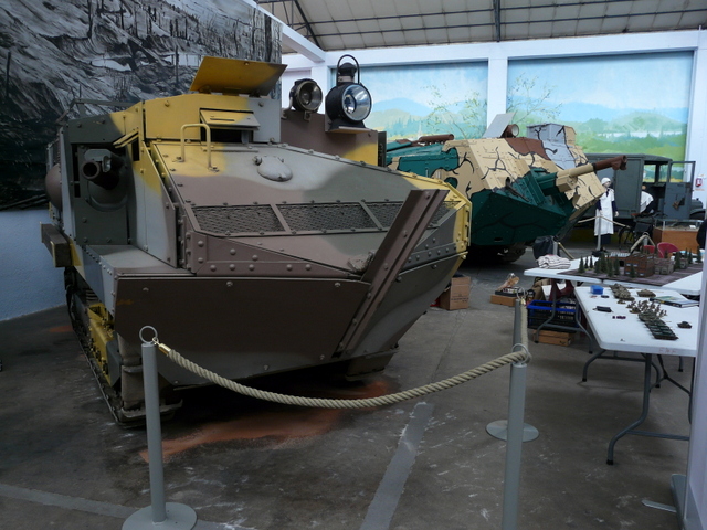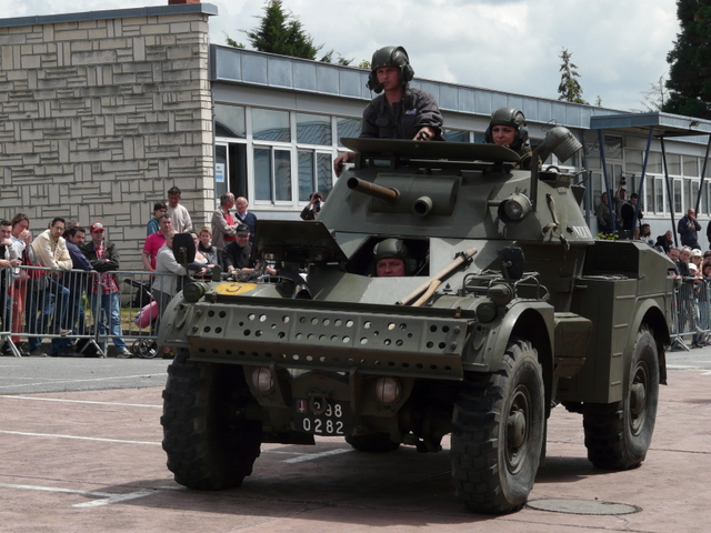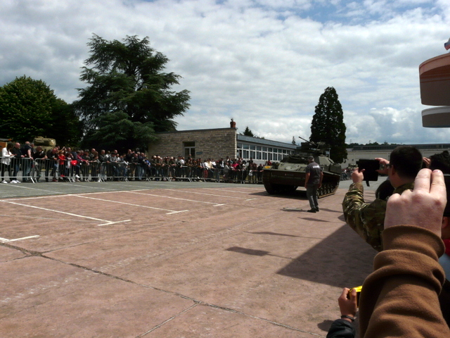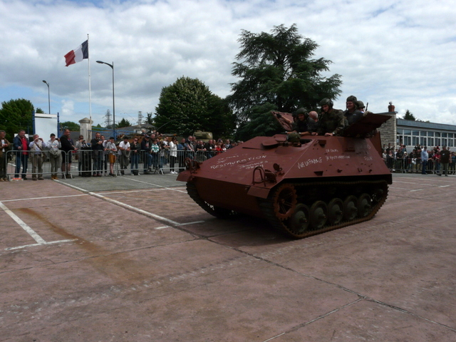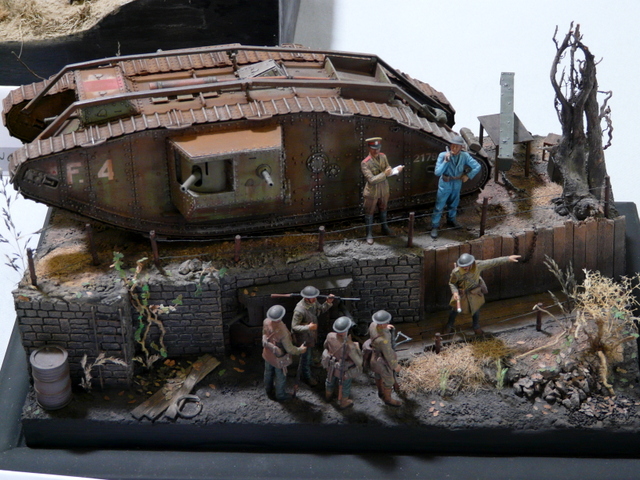 Bizarre, le GPS nous indique un chemin détourné. Nous passons de nombreux rond-points et dans l’un d’entre eux, un petit freinage sportif du Capitaine et là, c’est carrément un V 2, (le pied d’appareil photo) qui explose le dio du cageot ! Pierrot pleure… Je calme les esprits, et en ma qualité de Prez, je déclare solennellement : «pas grave ! Vous allez réparer !». On arrive au Musée, tout de suite surpris par l’ampleur de l’établissement et de cette belle façade peinte en bleu/blanc/rouge. Accueil très sympa. Je passe par l’administration pour percevoir le package papiers et emplacement. Tout est prêt, ça va vite. On rentre dans la place, par la salle blindés allemands 39/45 et là c’est plein les yeux. Nous trouvons notre emplacement dans la salle des alliés et montant notre stand à toucher un canon PAK 40. A deux mètres de nous en face, de superbes chars Anglais. Le stand est vite monté. Je laisse la place pour les deux ingénieurs chargés des réparations du sinistre du cageot. Rapidement réparé par des mains d’experts, on inscrit le dio à Thiébaud dans la catégorie, «dio où il y a plus de colle que de plastique, maintes fois réparés!».