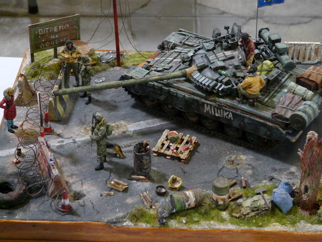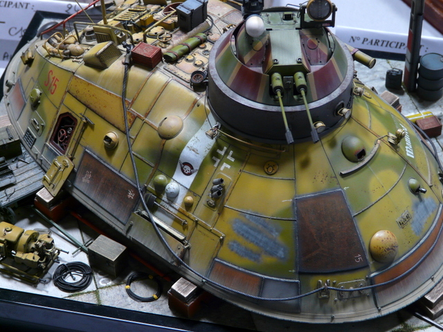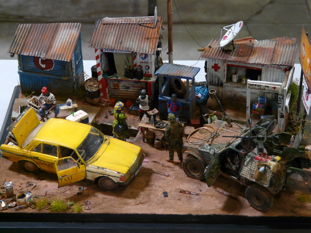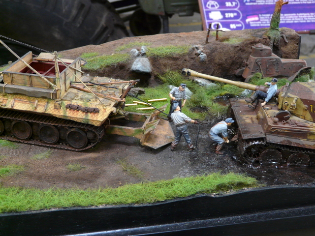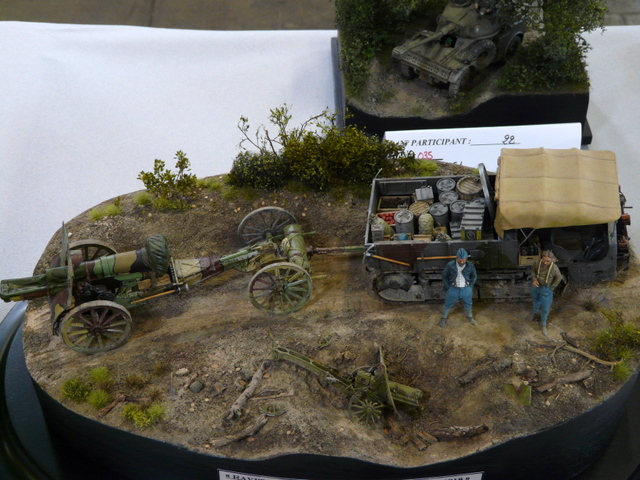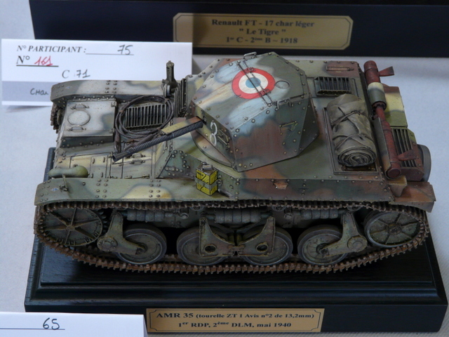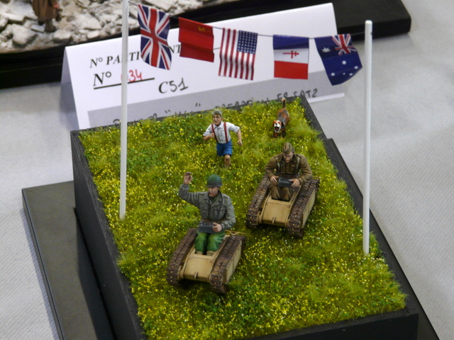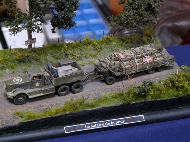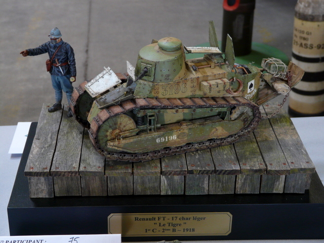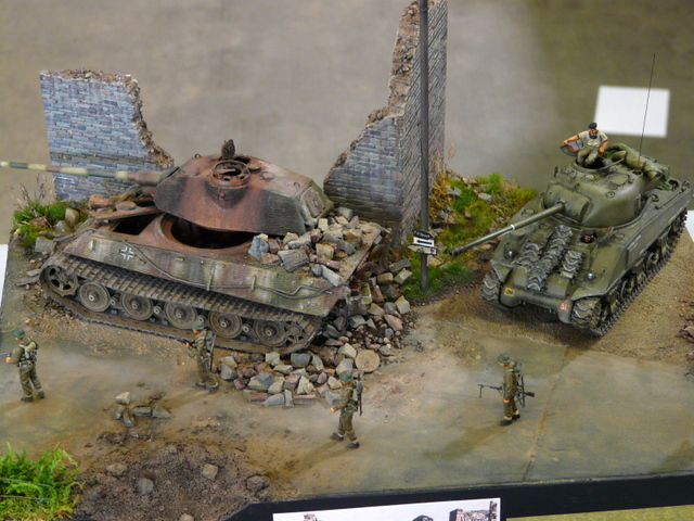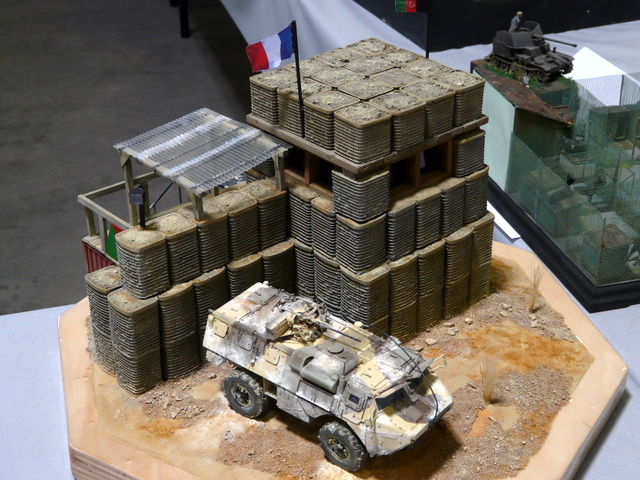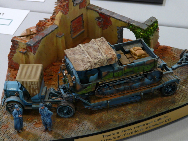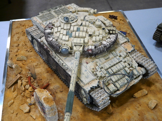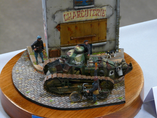Et l’équipe s’étiole entre tous ces chars. On retrouve beaucoup d’amis de ce microcosme maquettiste. Beaucoup d’étrangers sont également présents. Une salle est consacrée aux commerçants. On a voulu faire croire à Jean No que l’accès à cette salle était interdit, mais notre plan n’a pas tenu bien longtemps. Midi, on récupère nos plateaux repas, commandés auprès de l’organisation, copieux et sympa. Après-midi photos et digestion ou l’inverse, je ne sais plus. Grâce au téléphone de Jean No, (autonomie 10 mn, je plaisante !) on localise un chinois pas loin de l’hôtel. On ne dit rien à Pierrot et direction le Chinois où Pierrot trouve encore des frites à volonté !