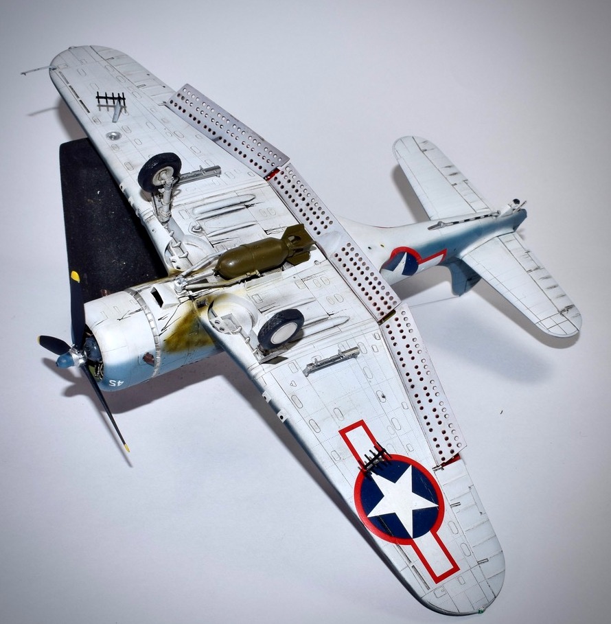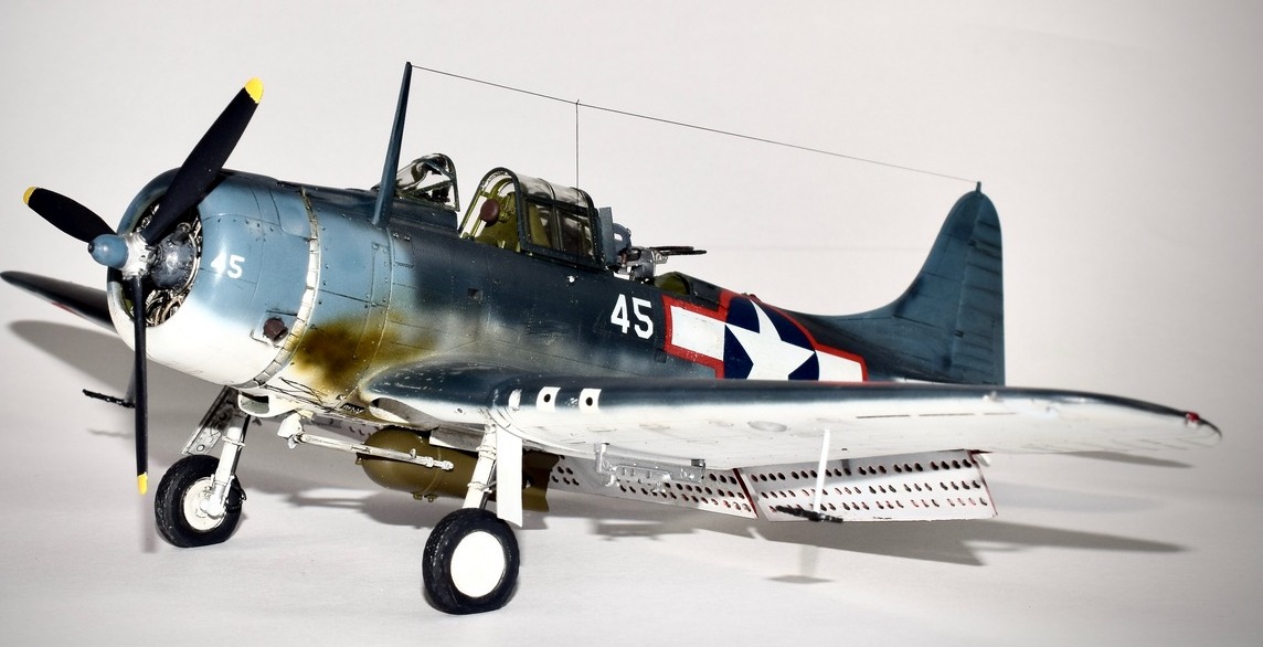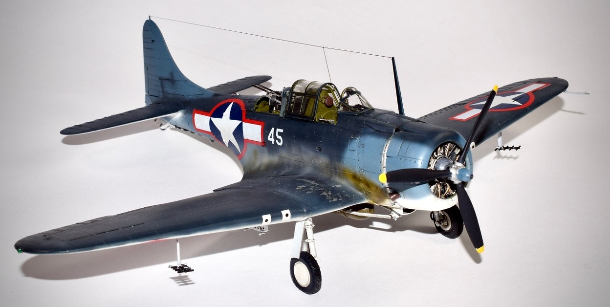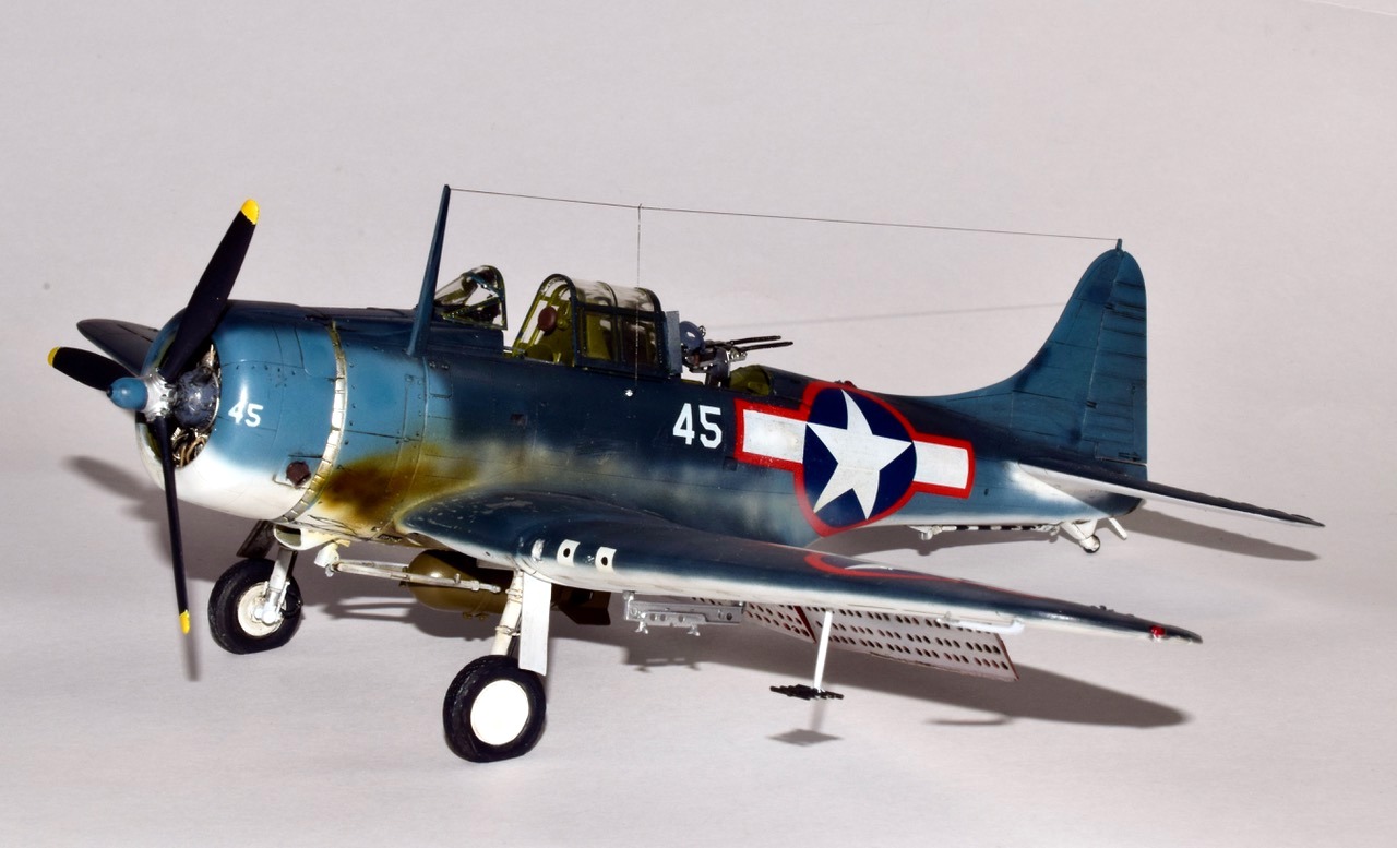 Dans la continuité de l’US Navy et pour vider mon stock (j’y suis presque) j’avais un vieil SBD5 d’Accurate Miniatures qui trainait depuis des années. Mis à part les sièges de chez Ultracast, le moteur et les échappements de chez Quickboost c’est du « from the box ». L’avion porte des fausses mitrailleuses sur les ailes pour tromper les nippons, la photo est dans le Squadron Signal, la même photo montre des trainées d’échappement conséquentes, dont acte. Ce Dauntless est basé sur le Lexington pendant les raids sur les îles Gilbert avant Tarawa en 43. Malgré son âge la maquette est un vrai plaisir à monter, et, une fois n’est pas coutume, j’ai utilisé des décalques, les courbes du fuselage ne se prétant pas vraiment à l’utilisation des masques en vinyl!