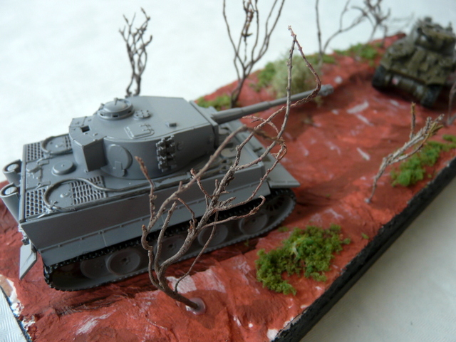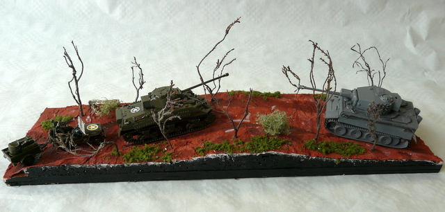 J’ai commencé le maquettisme il y a quelques mois, et pour mon premier diorama j’ai eu l’idée de représenter une rencontre entre un Tigre et un Sherman Firefly. Une jeep de ravitaillement suit ce dernier pour lui donner du carburant. L’affrontement étant inévitable, les artilleurs se préparent au combat. Mais au moment de tirer, un artilleur allemand annonce que le canon est enrayé et force son commandant de char à annoncer le repli immédiat. Le Sherman peut donc faire le plein d’essence et la jeep continuer son travail dans d’autres unités.