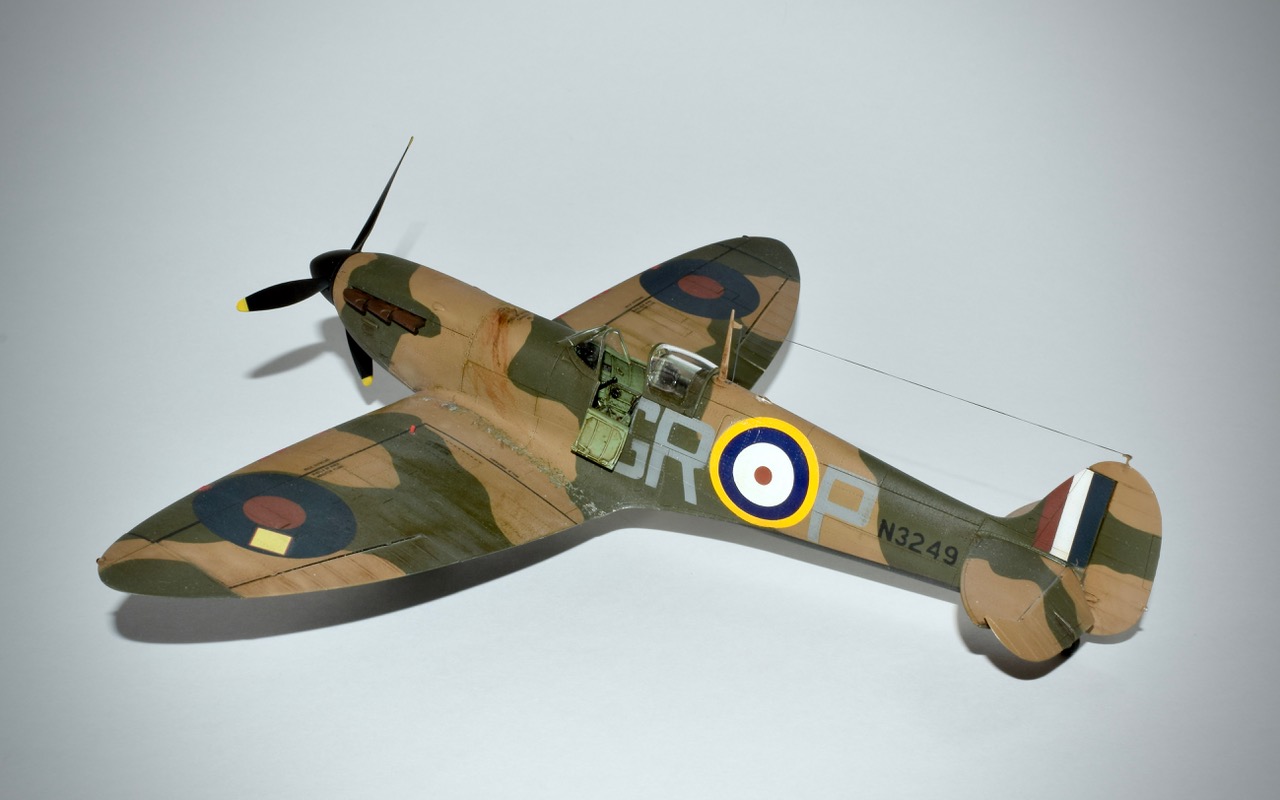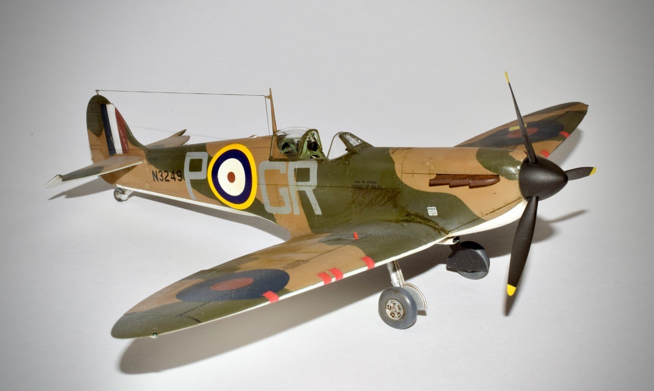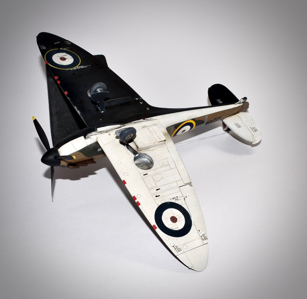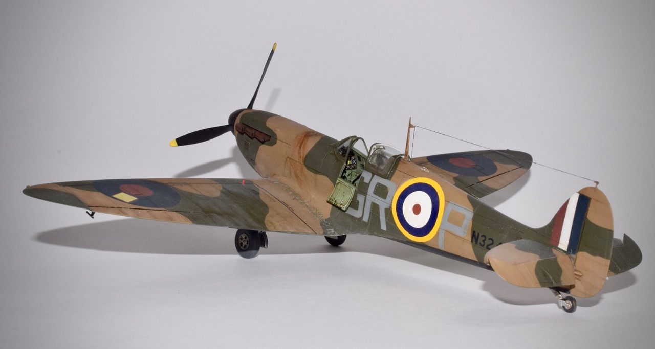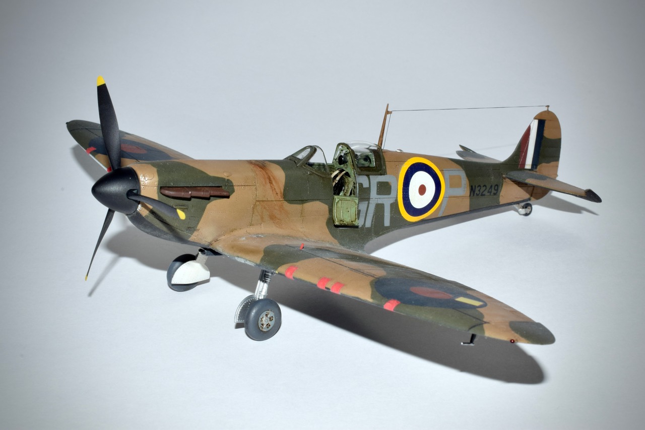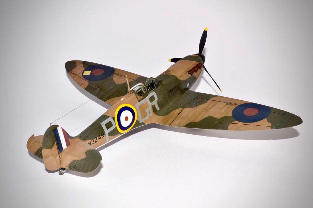 Es-il encore utile de présenter ce classique? Qui ne connait pas cet avion mythique qui assure le pain et le beurre de bon nombre de marques de maquettes! Eduard nous gratifie d’un très très beau modéle des premières versions du Supermarine, laissant derrière l’ancien Tamiya datant de 1993, et peut-être aussi le nouveau moule Japonais. N’ayant pas eu ce dernier en main je ne me prononcerai pas sauf pour le prix qui place encore une fois l’Eduard en tête. Il y a vraiment tout dans la boite et la version profipack permet de réaliser pas moins de sept décorations, ajoutons au passage la planche de stencils! Seul point négatif, ma maquette souffrait de nombreuses retassures, et les échappements ont été remplacès à cause de cela par des piéces en résine Brassin, tout comme les roues dont je n’aimais pas les jantes! Nous disions donc sept décos, mais bien entendu j’en ai fait une qui n’était pas disponible, avec des masques, si si, pour représenter l’avion de Robert Standfrord-Tuck au sein du 92 Squadron à Pembry en Mai 40. Le serial N3249 nous indique un schéma de type « B » ce qui fut fait. L’intrados est noir et blanc, et l’usure reste subtile, ce n’est pas une épave! Tuck sera abattu par la Flak en Janvier 42, il s’évadera en 45 et rejoindra les forces Soviétiques avant d’être rapatriè en Angleterre.