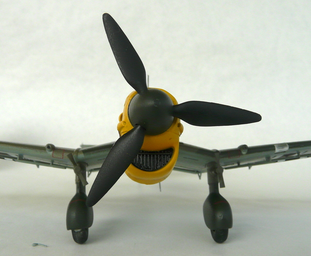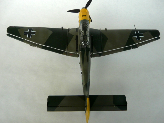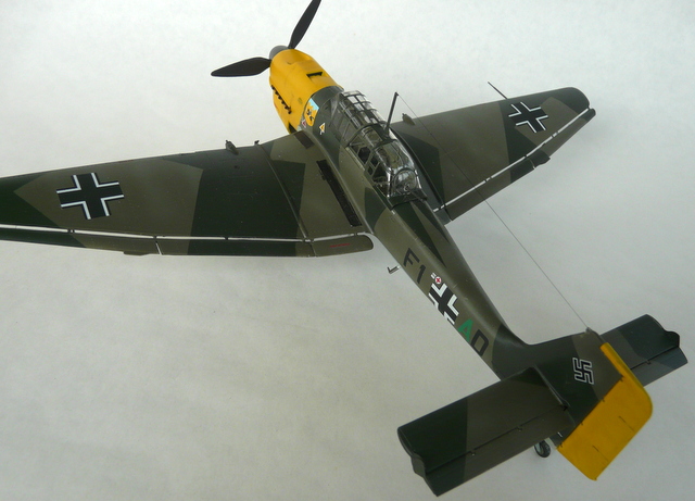 Pour la peinture, toujours la même technique en commençant par un apprêtage en blanc mat. J’ai pris aussi pour ce montage, les caches vitres EDUARD, pas très cher, cela vous sauve vos carreaux. Utilisant que de la GUNZE AQUEOUS, nous aurons donc pour le bleu RLM 65 du 67, pour le RLM 70 du 65 et pour le RLM 71 du 64. Une couche de vernis brillant sur toute la maquette. Une nuit de dodo et pose des décalques. Une nuit de dodo et vernis mat sur tout l’ensemble. Le fil d’antenne est du lycra de la marque INFINI MODEL, (quand on y a gouté, il est irremplaçable). Pose finale d’une staviska trouvée dans ma boite à rabiot.