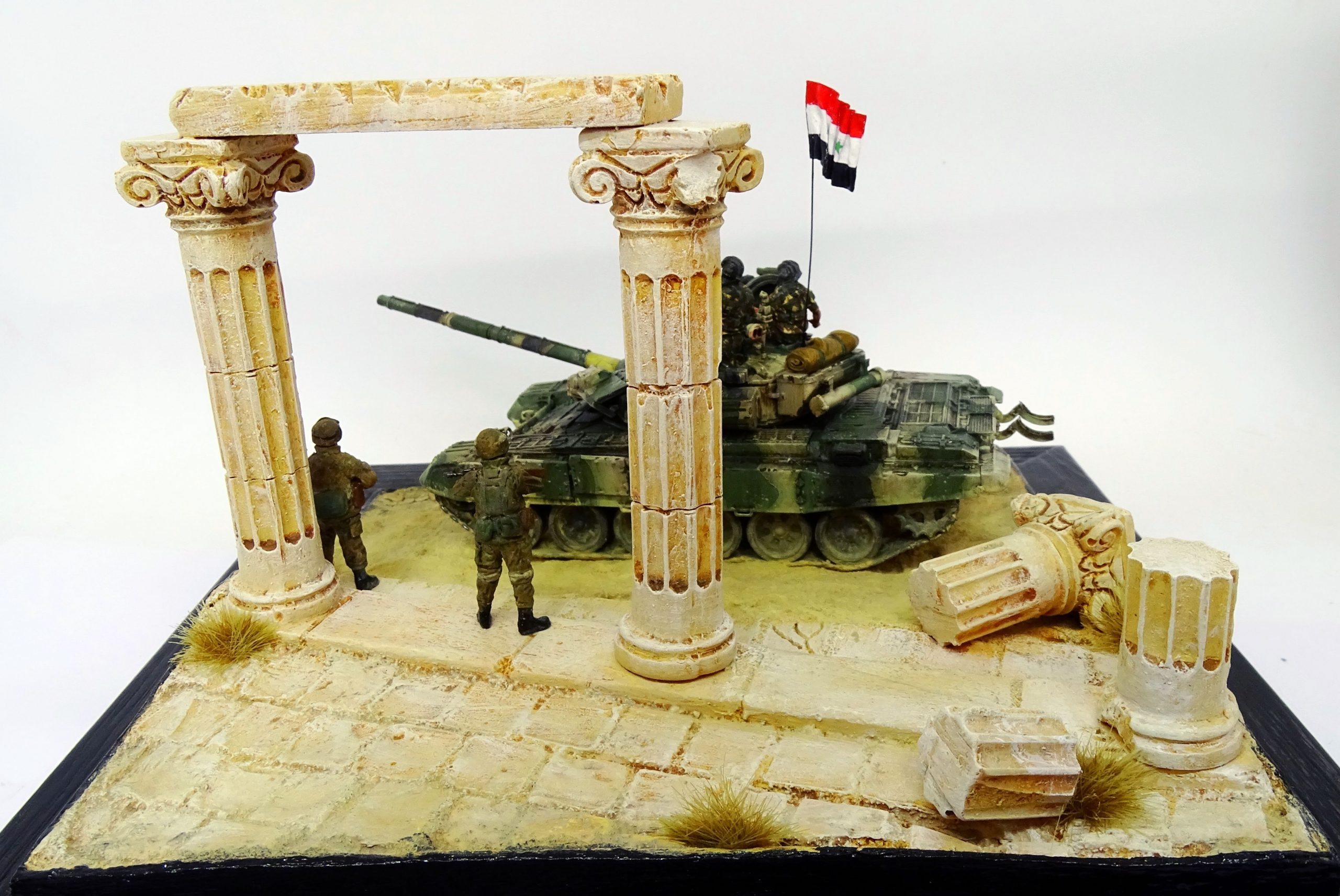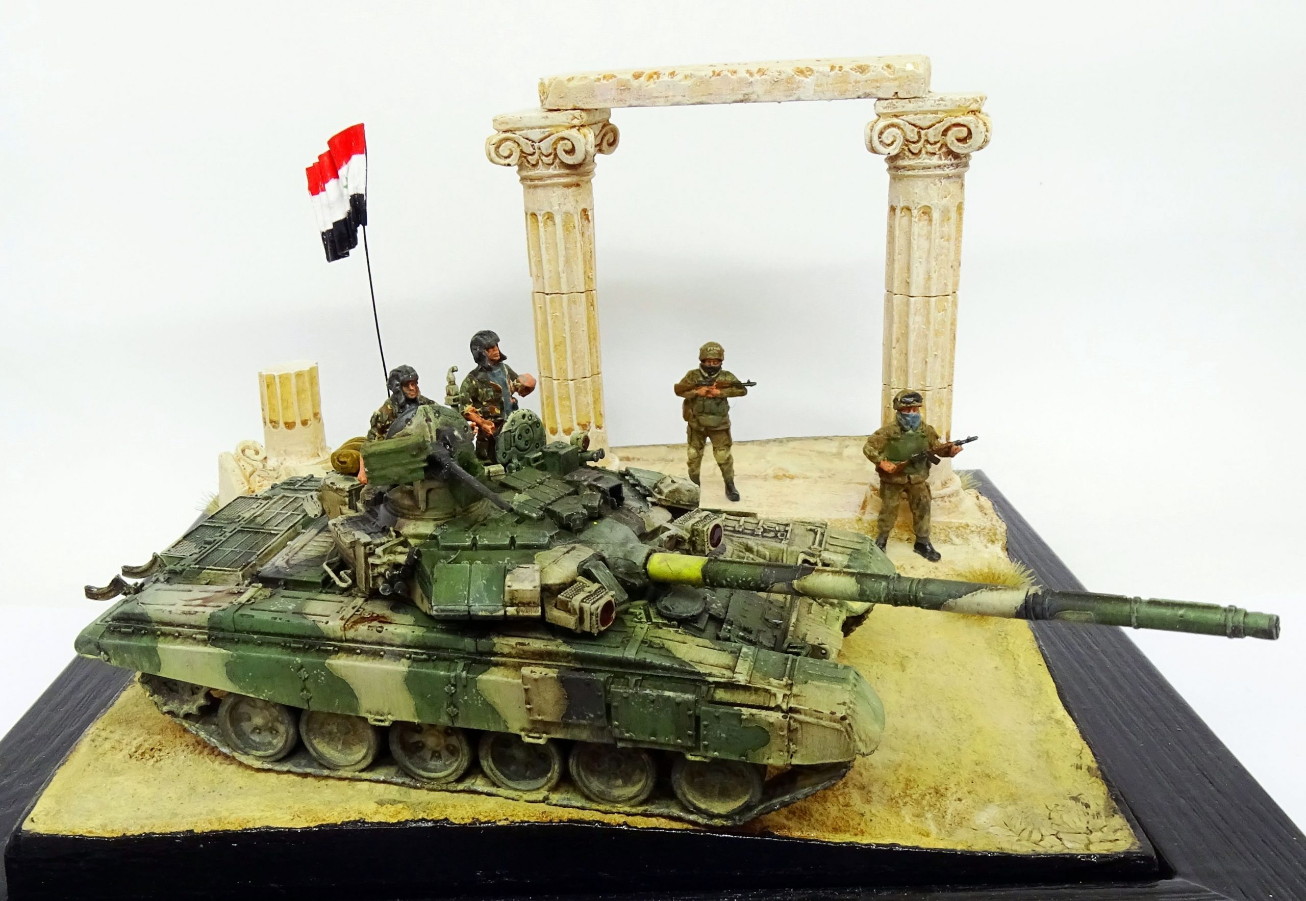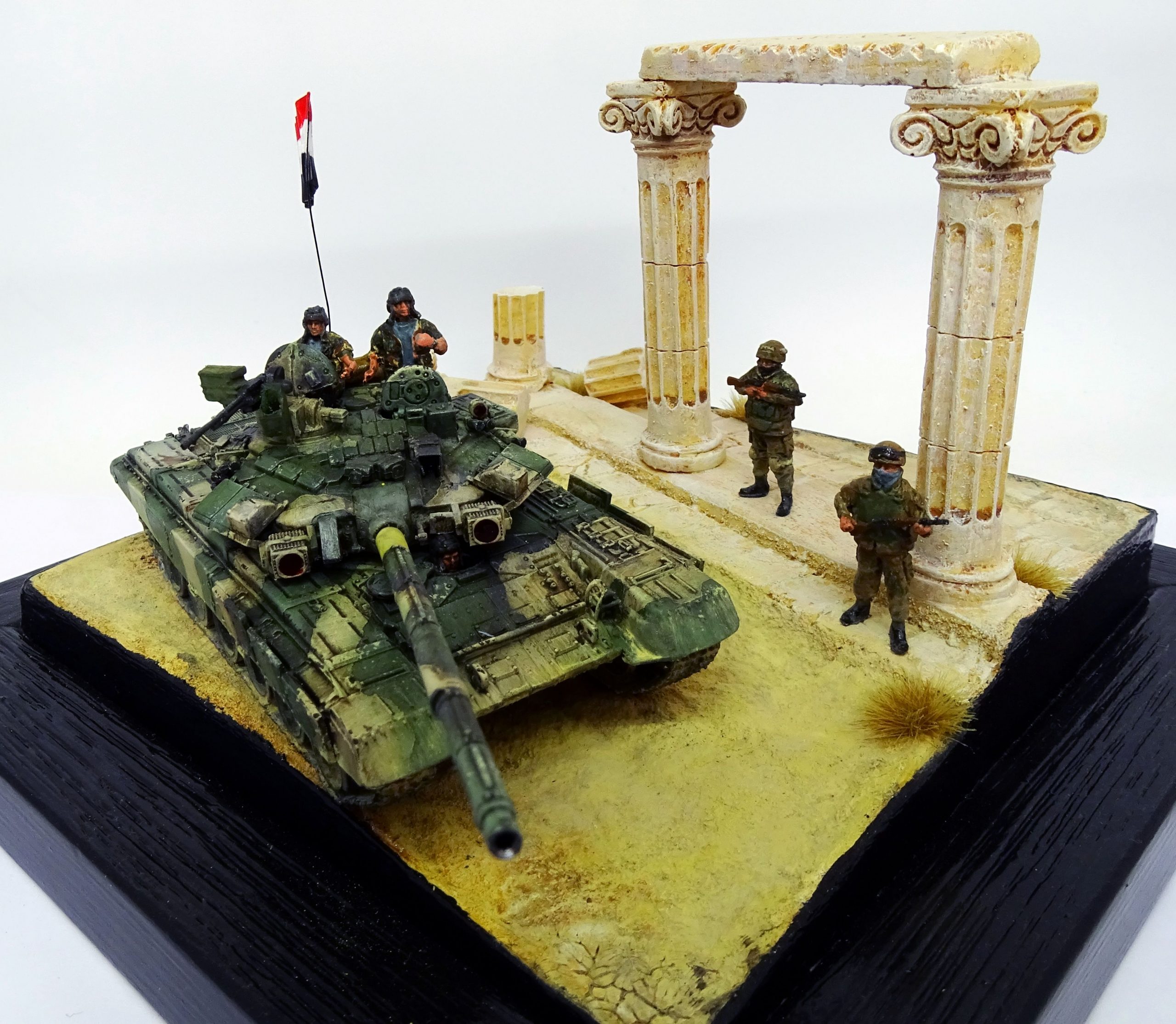 T 90 A Syrien (acheté aux russes ) lors de la reprise de la ville de Palmyre ,accompagné de l’infanterie russe .