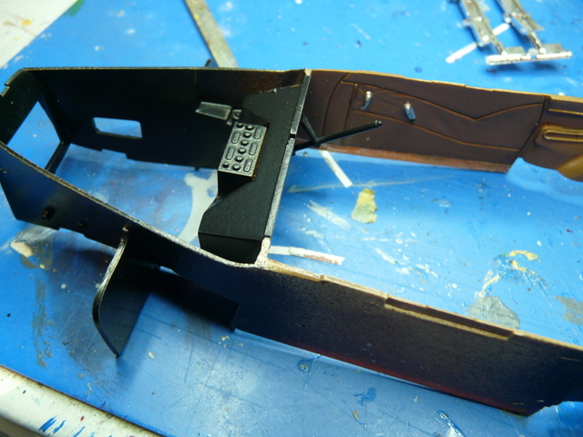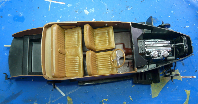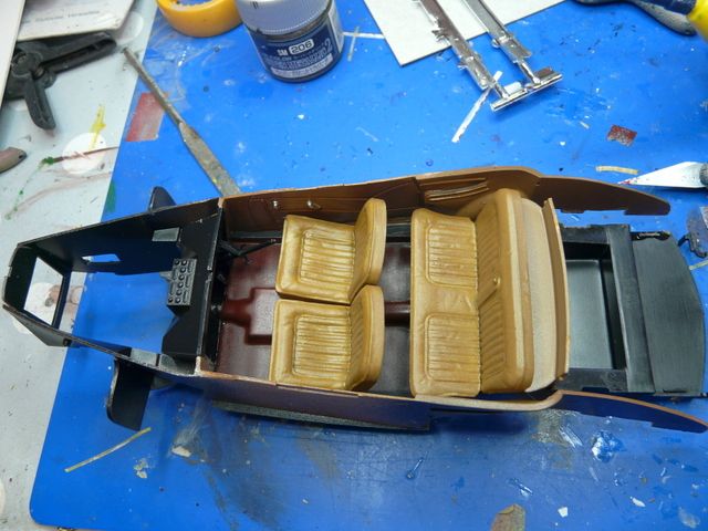 Puis, on attaque l’intérieur : l’assemblage proposé est des plus curieux : d’abord les sièges à mettre sur le plancher. J’ai donc peint les sièges après un blanc mat, en couleur « cuir ». Puis une fois bien secs, j’ai repeint le tout à l’huile, terre de sienne et ombre naturelle (selon la méthode transmise par le grand sage et vénéré Pierrot). A noter que tout cela se travaille à l’essence de pétrole (dispo en petit flacon dans les rayons peintures tableau).