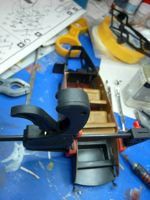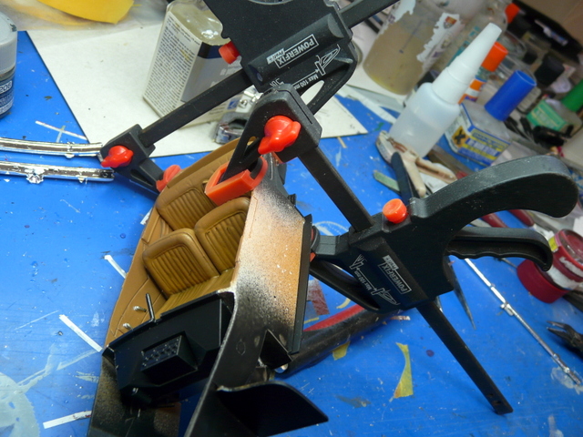 Et là, mon beau vernis, il souffre, plein d’empreintes digitales partout (ce n’est pas le crime parfait). Cela se fait enfin dans la douleur et la colle cyano. Petite anecdote, il a fallu se battre avec les deux vitres des portières qui s’obstinaient à pencher vers l’intérieur. J’ai inventé un stratagème, digne d’un sioux sur le sentier de la guerre. Avec plusieurs pinces plastiques, j’ai fait un contre-poids qui me les a maintenues en place et permis de les coller au pare-brise avec une micro goutte de cyano. Bien évidemment, tout cela ne demande qu’à sauter à la première manipulation un peu virile.