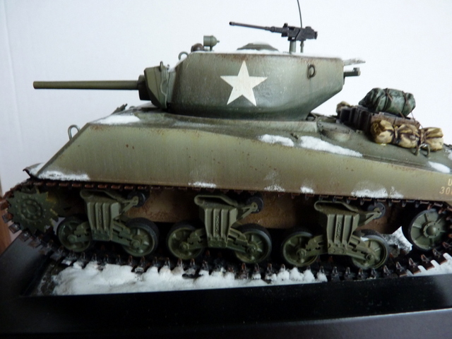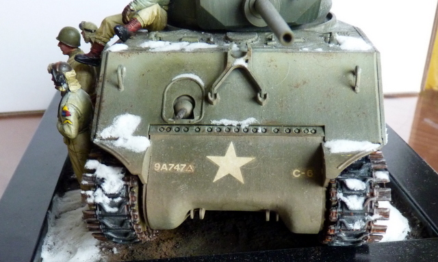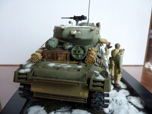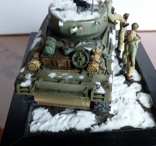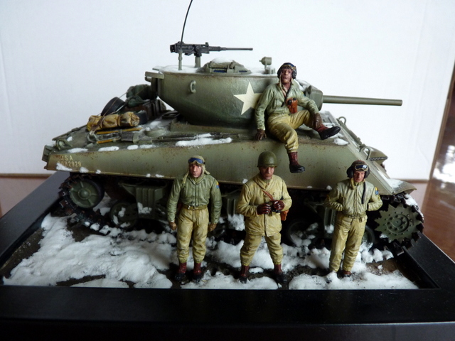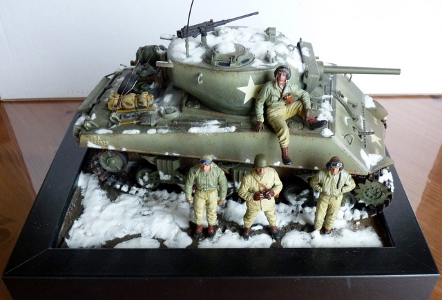Pour la mise en scène, j’ai choisi de placer le char en hiver, sous la neige. La scène se passe dans les environs de Bastogne, en hiver 1945, l’équipage observe le terrain avant de s’y aventurer.