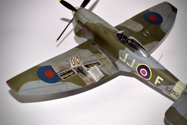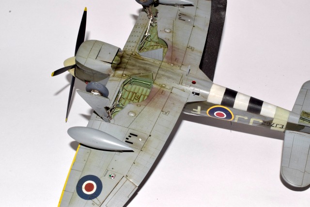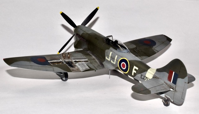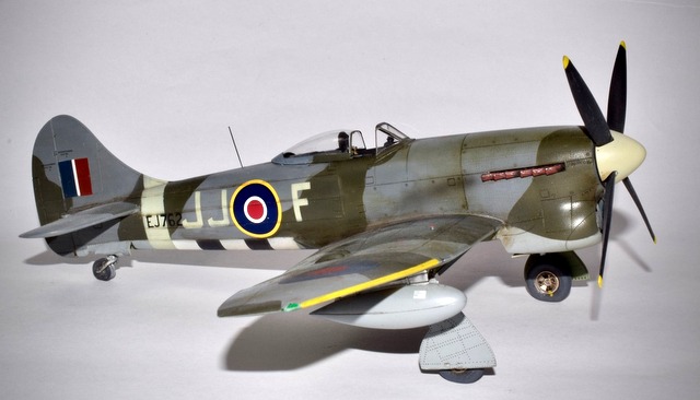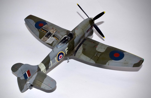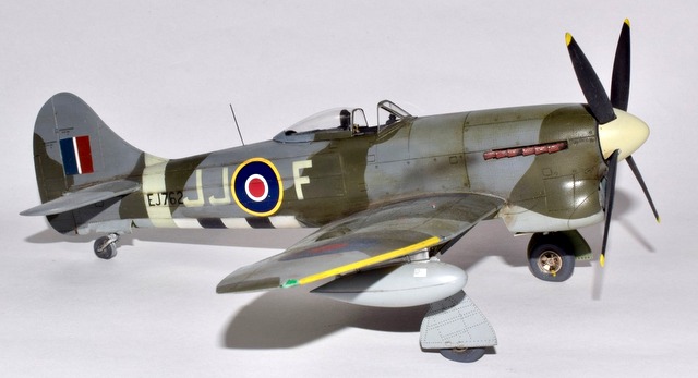 Le Tempest d’Eduard au 48° est une belle maquette, d’un niveau de détail magnifique, mais très fragiles. La découpe de certaines pièces crée des joints inopportuns qui demandent mastic et ponçage. cela fait disparaître les lignes de rivets qu’il faut refaire. J’ai utilisé les articles de la marque pour représenter les baies d’armement ouvertes mais également les roues et les jambes de train en métal. Les décorations proposées sont toutes magnifiques mais j’ai préféré faire dans l’inédit pour représenter à l’aide de masques en vinyl l’avion du Flight Lt D C Fairbanks à Volkel en 45. L’unité est le 274 Sqn. J’ai surtout voulu éviter l’avion de Closterman! Les peintures sont des teintes Mr Color.